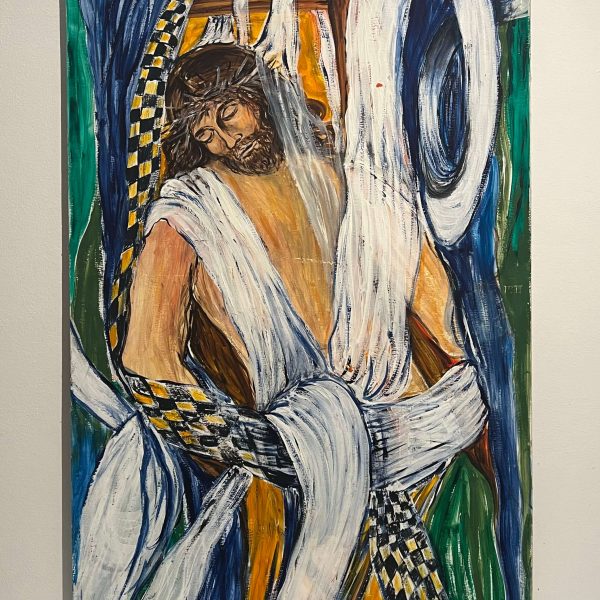 Nagy méretű, modern vallási jelenet ábrázolás kortárs nyugat-európai művésztől, amely keretezést követően azonnal falra akasztható. Az alkotás egy 4 részes sorozat része, melyek mind megtalálhatóak a kínálatunkban!