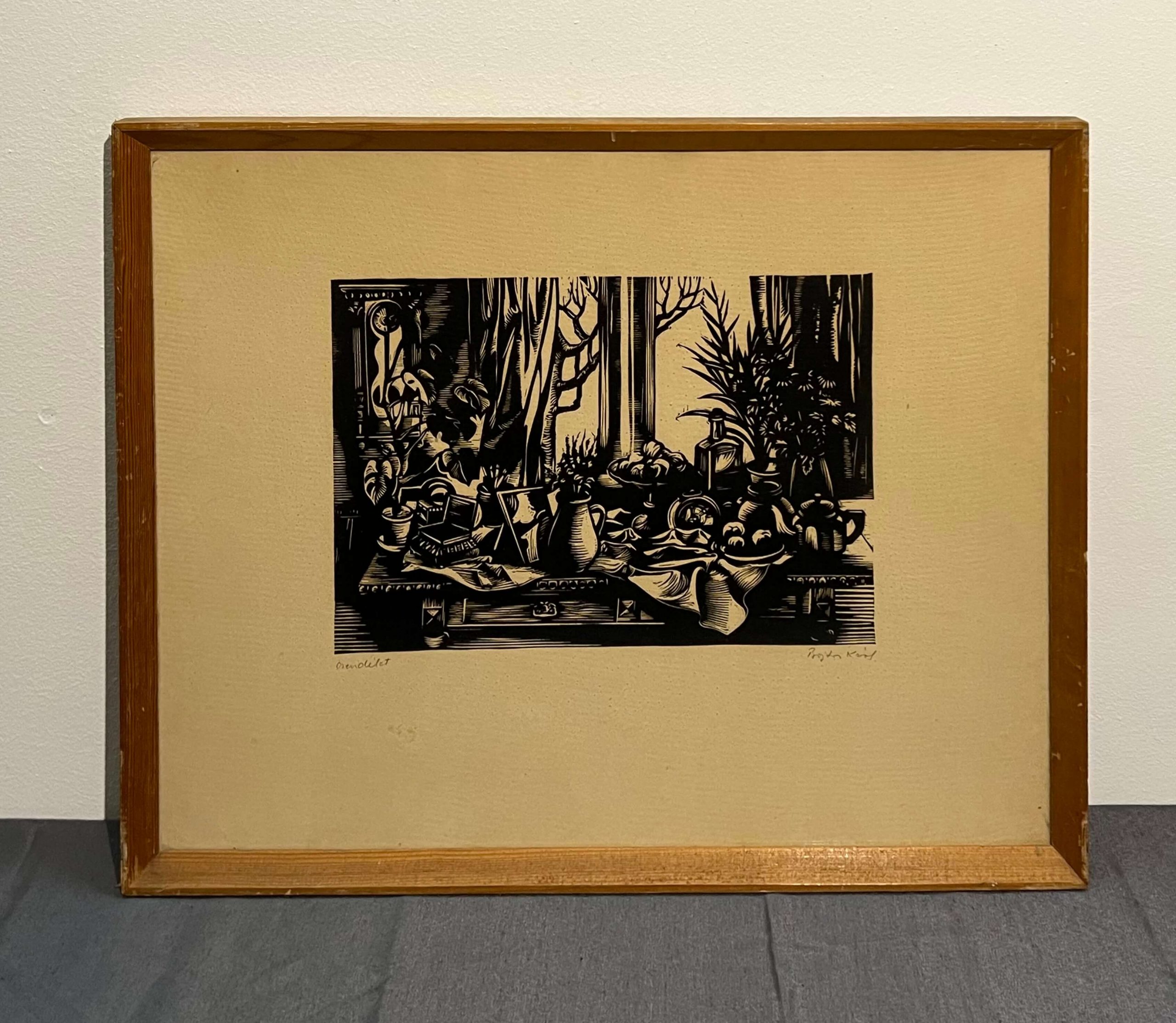 Igényesen elkészített fekete-fehér linómetszet Bojtos Károly (1936- ) híres magyar grafikustól üvegezett keretben, azonnal falra akasztható állapotban.