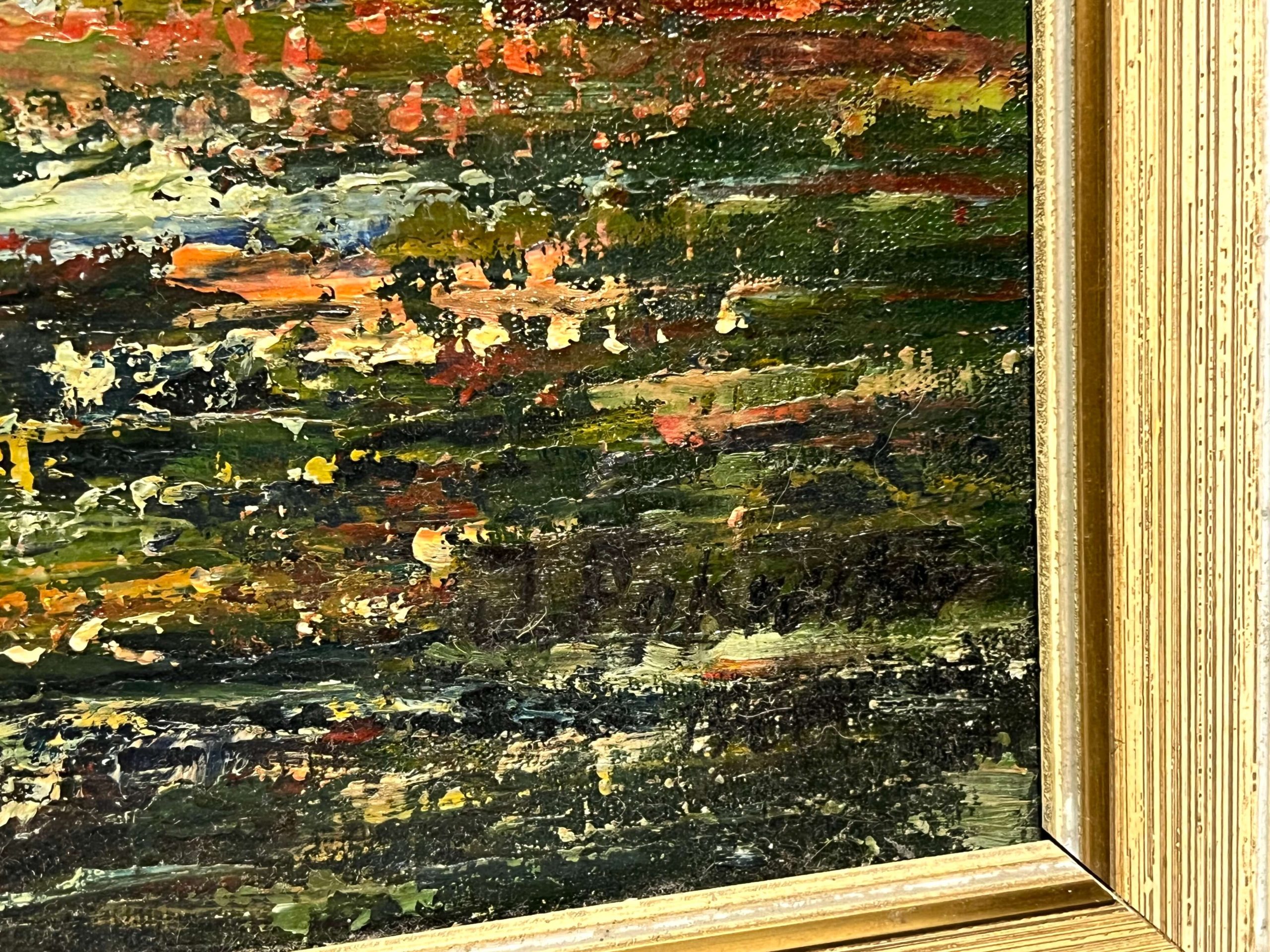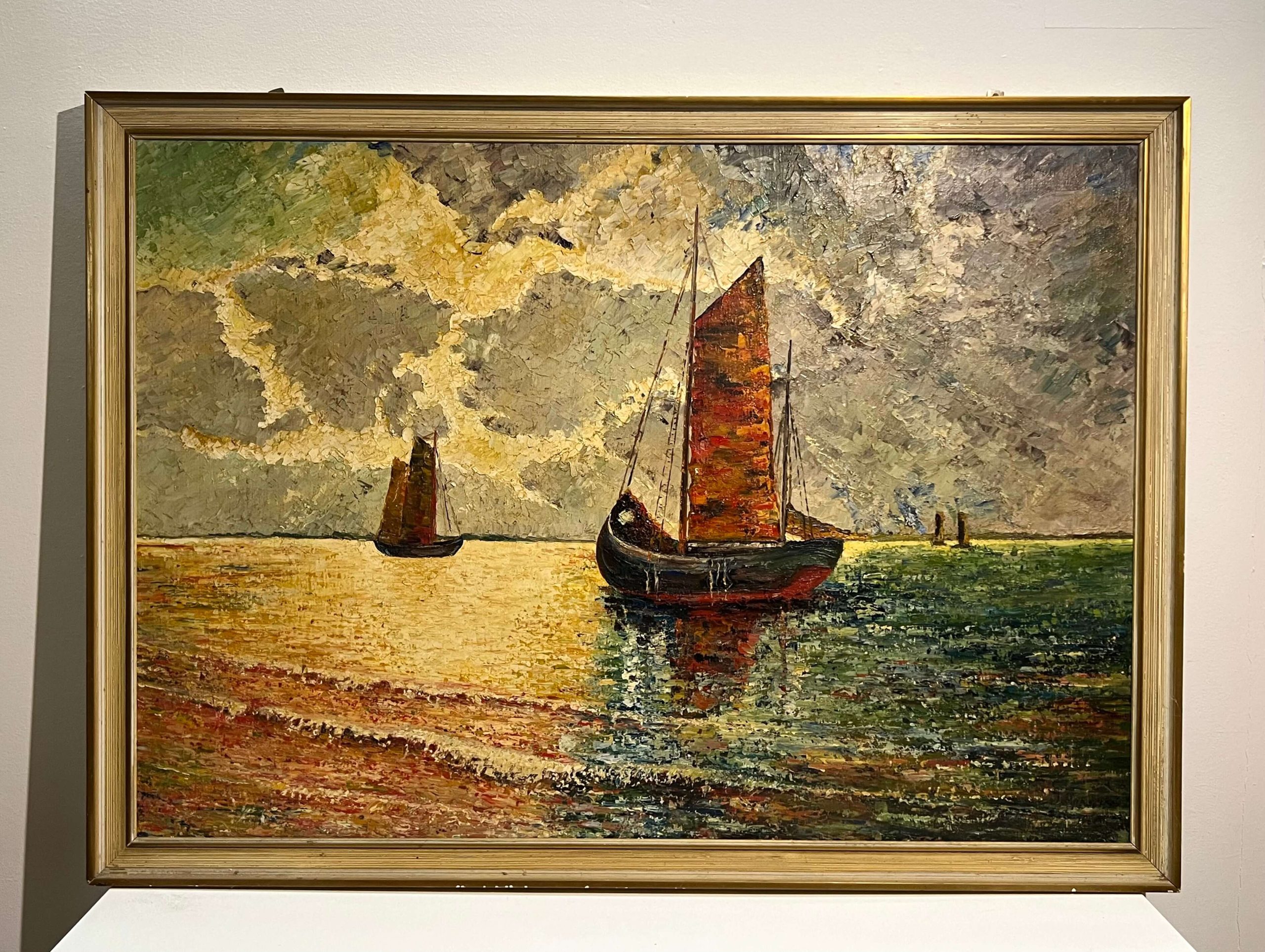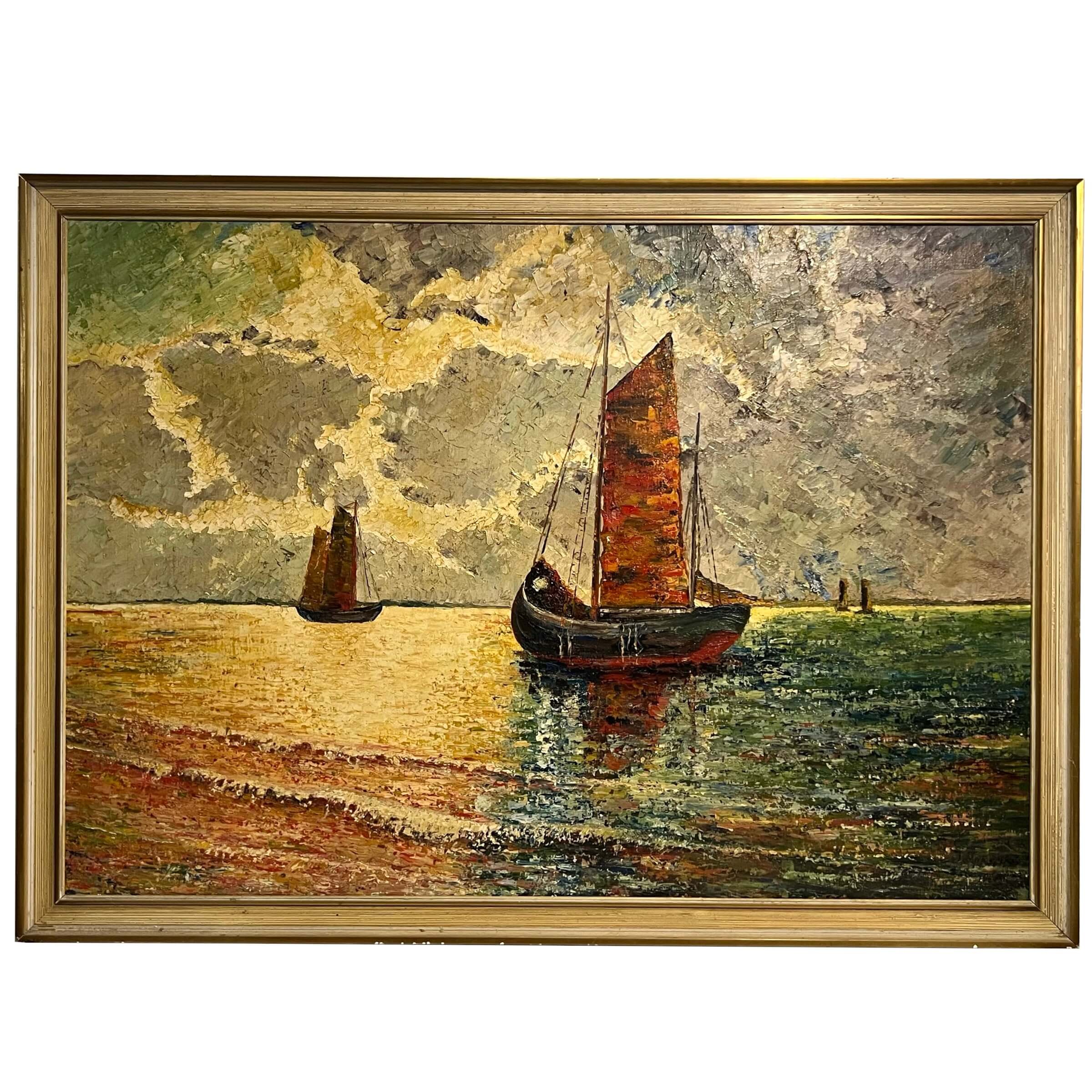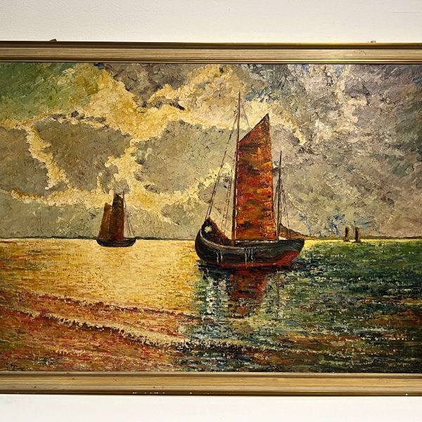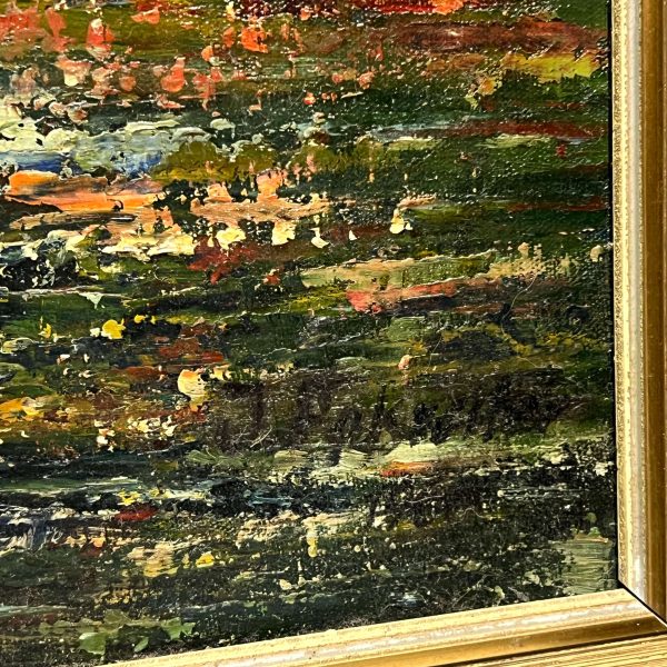 Extra nagy méretű, nagyon jó ecsetkezeléssel és színvilággal megfestett impozáns alkotás szépen keretezve, azonnal falra akasztható állapotban. A művész beazonosítása folyamatban van!
