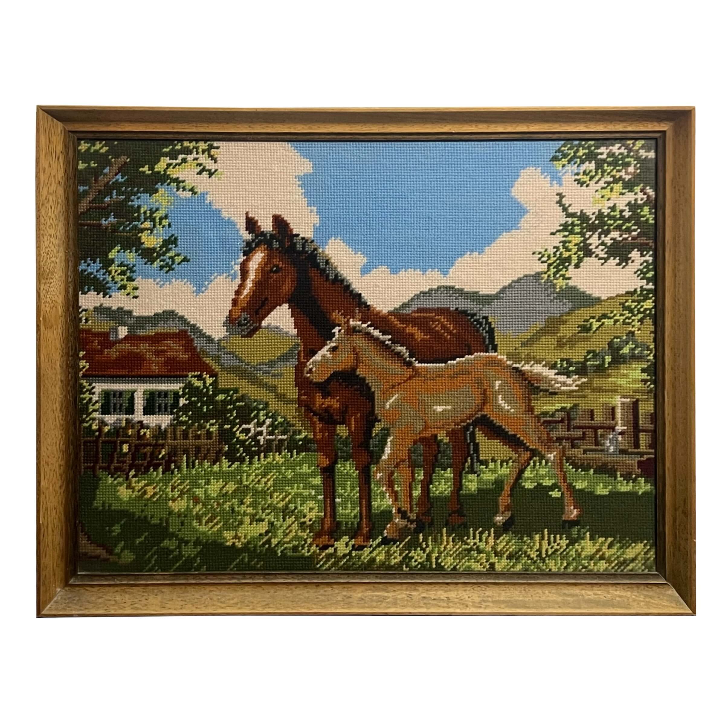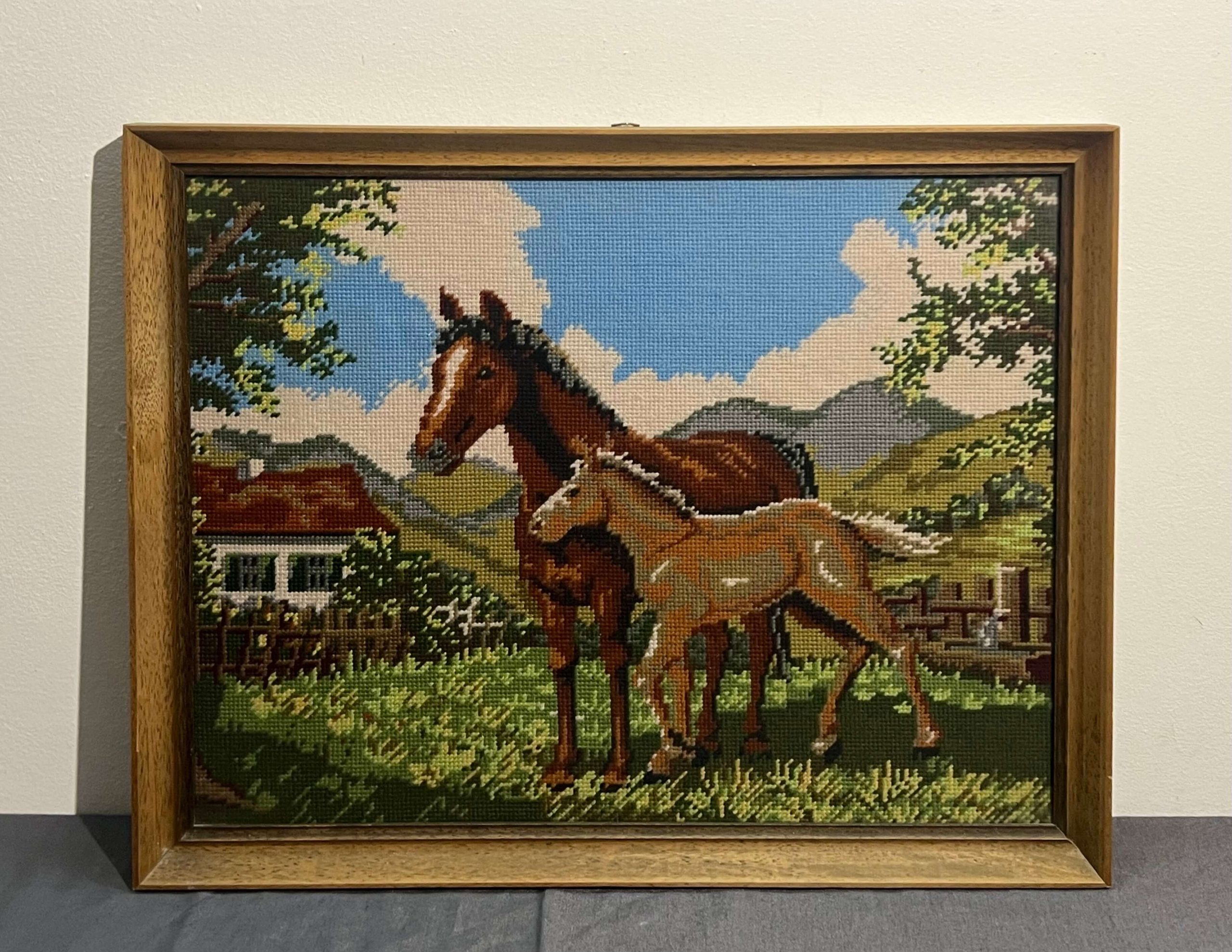 Hímzés. Szépen elkészített gobelin munka Nyugat-Európából a lovak és a vidéki élet szerelmeseinek ajánlva, azonnal falra akasztható állapotban.