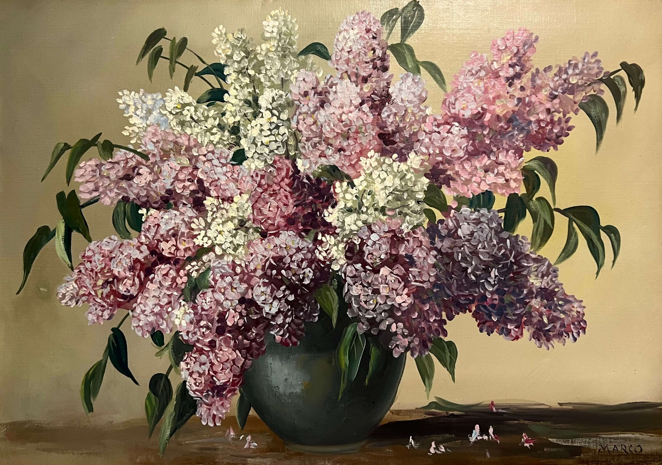 With a sign of MARCO - Lilacs in green vase