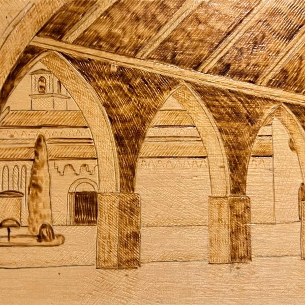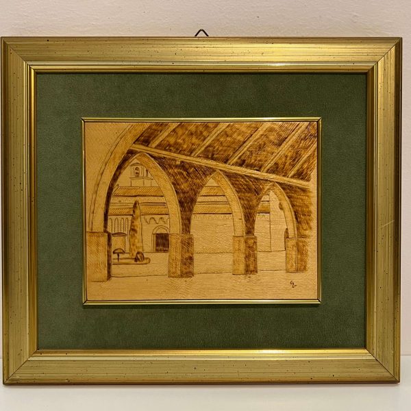 Karcolt és égetett fa táblakép (falemezre tűvel megrajzolt, majd beleégetett munka) igényes, szép keretben, azonnal falra akasztható állapotban!