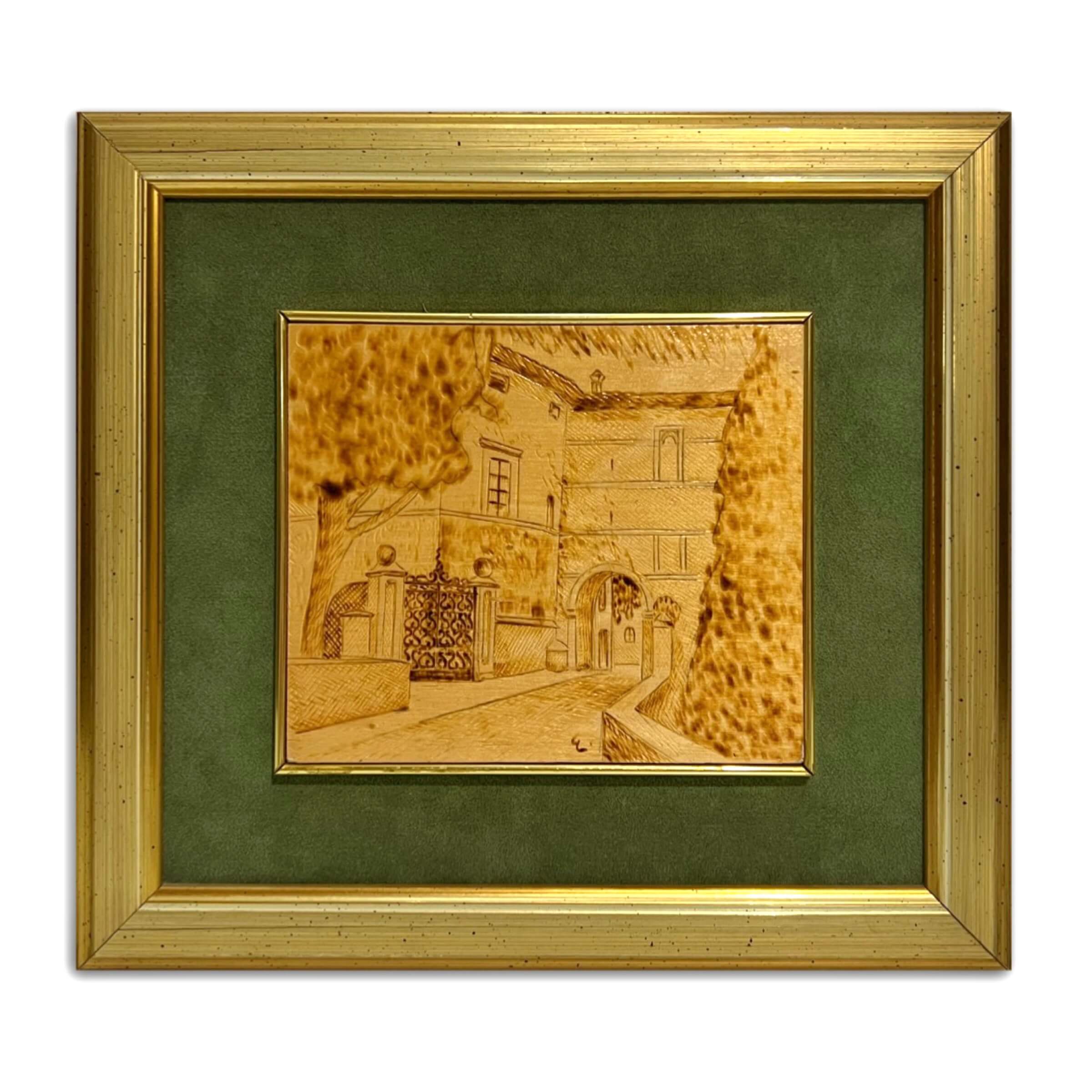 Karcolt és égetett fa táblakép (falemezre tűvel megrajzolt, majd beleégetett munka) igényes, szép keretben, azonnal falra akasztható állapotban!