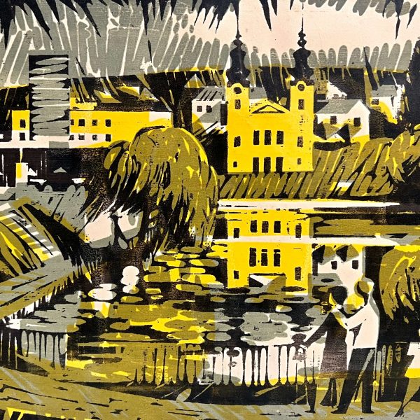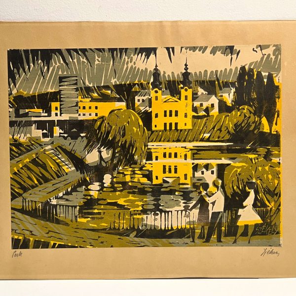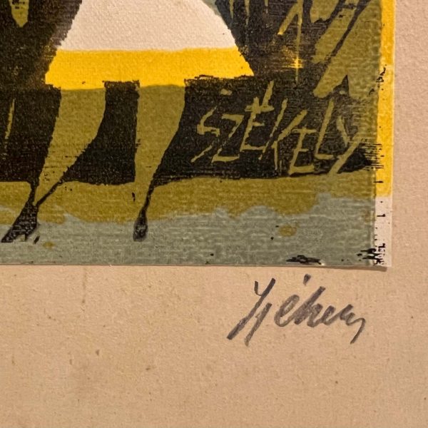 Szépen elkészített színezett városi életkép-látkép alkotás, talán litográfia vagy szitanyomat kartonon Székely Endre (1917-2014) festőművésztől, amely csak egy jó keretezésre és egy gyűjtőre vár!