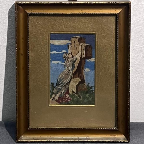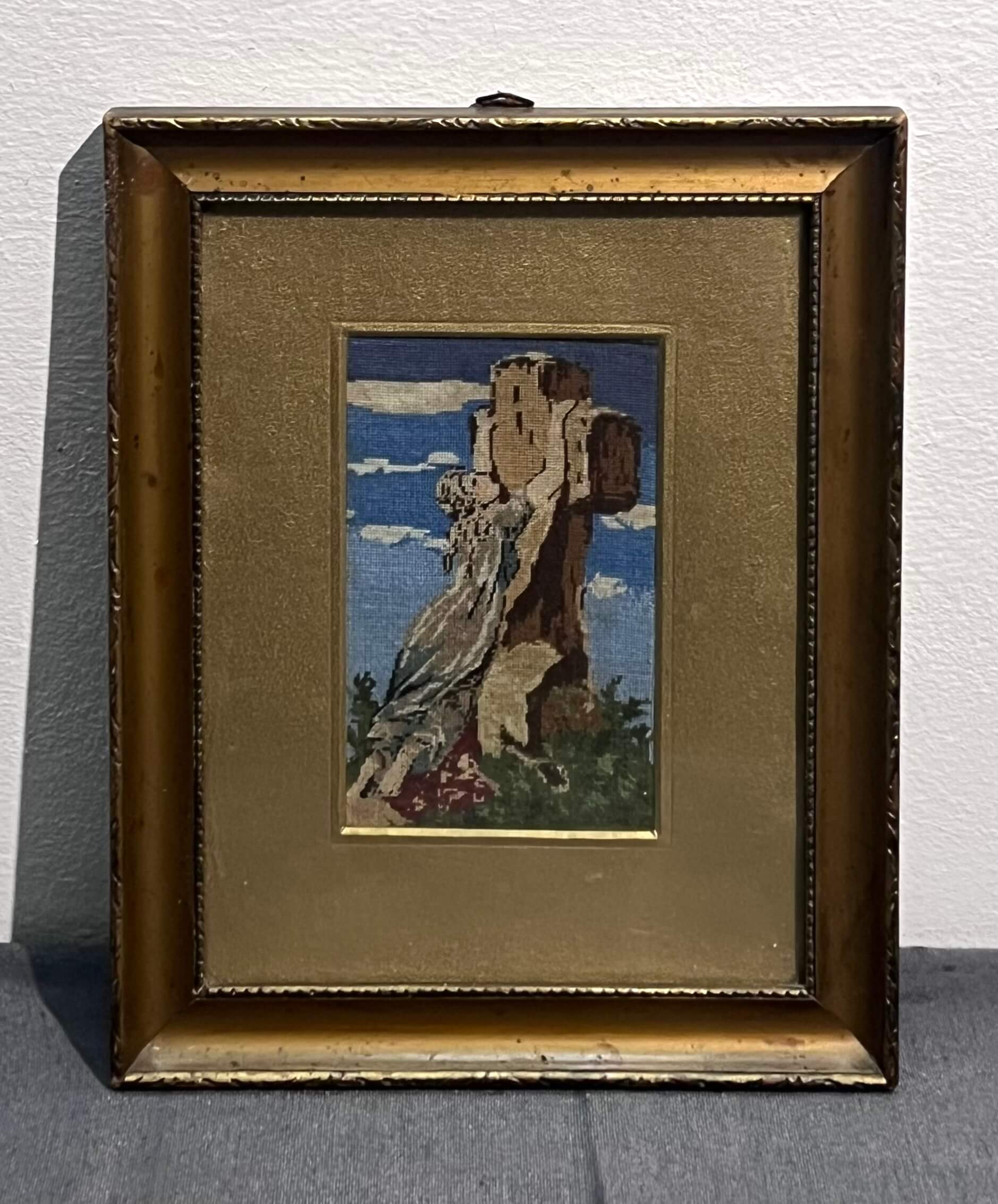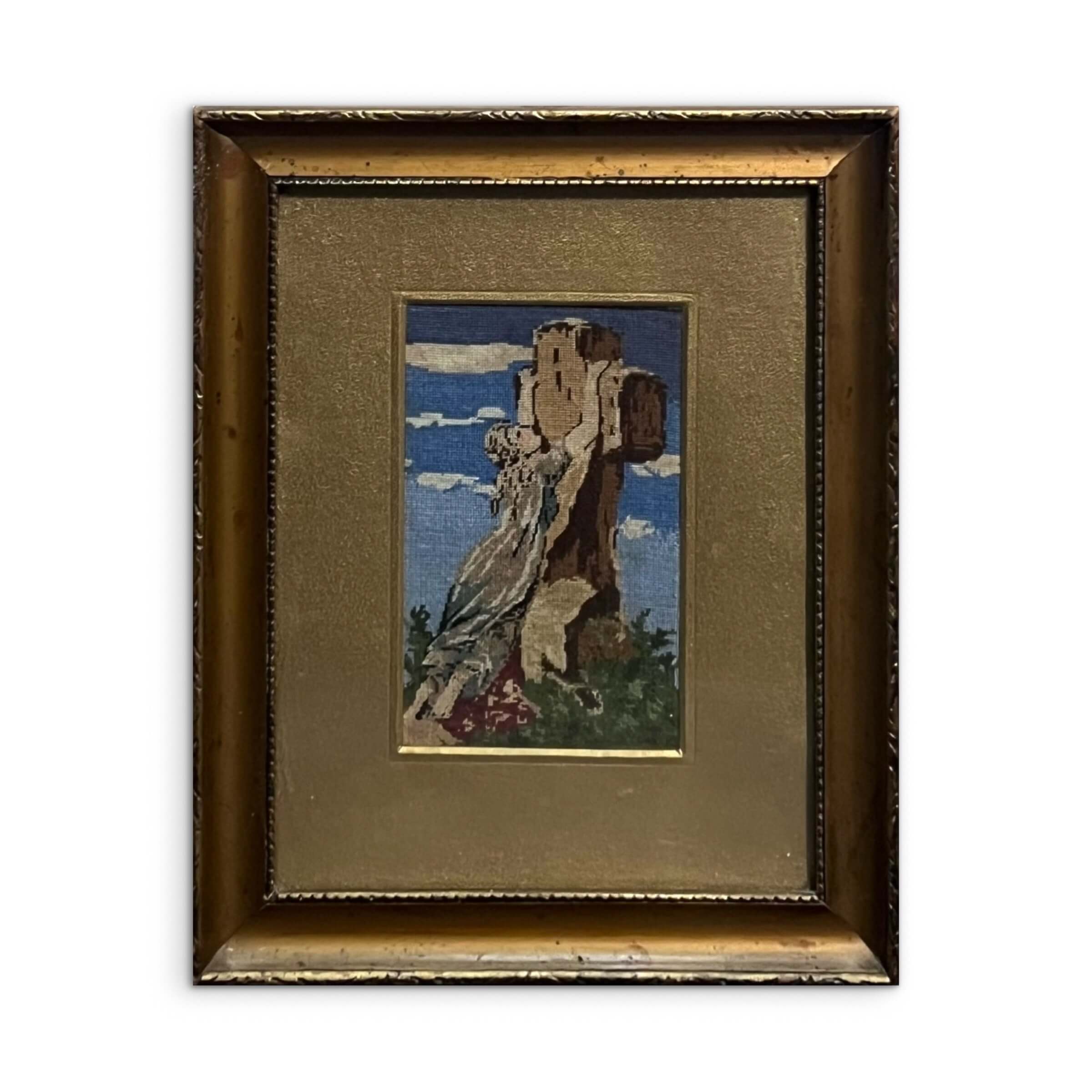 Hímzés. Régi, igényesen elkészített miniatűr tűgobelin munka eredeti keretezésében, azonnal falra akasztható állapotban.