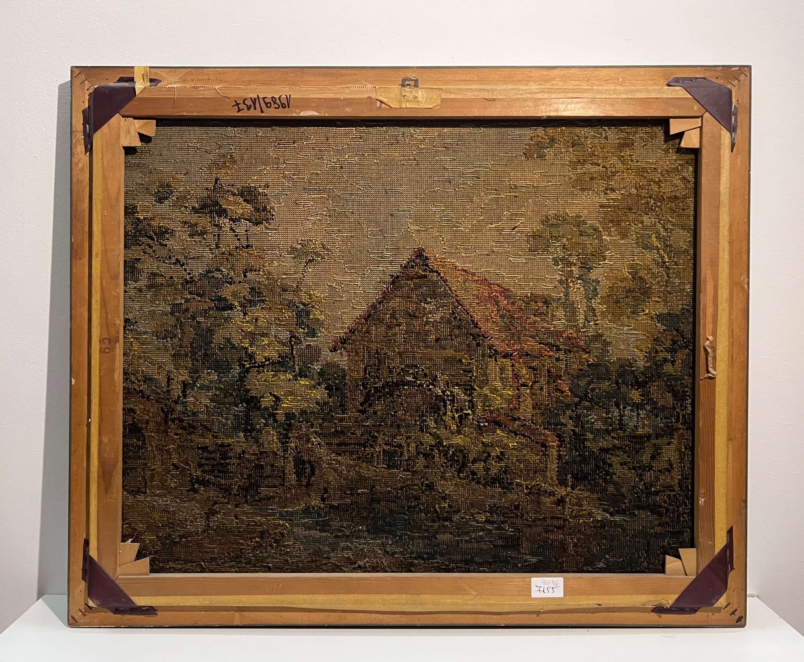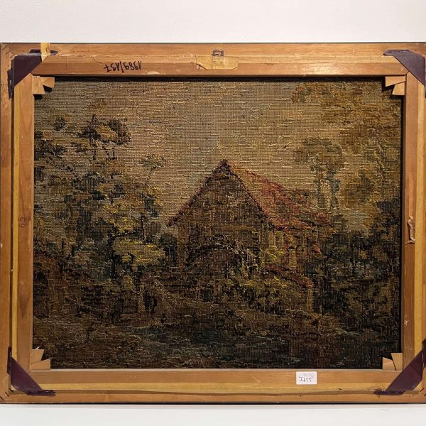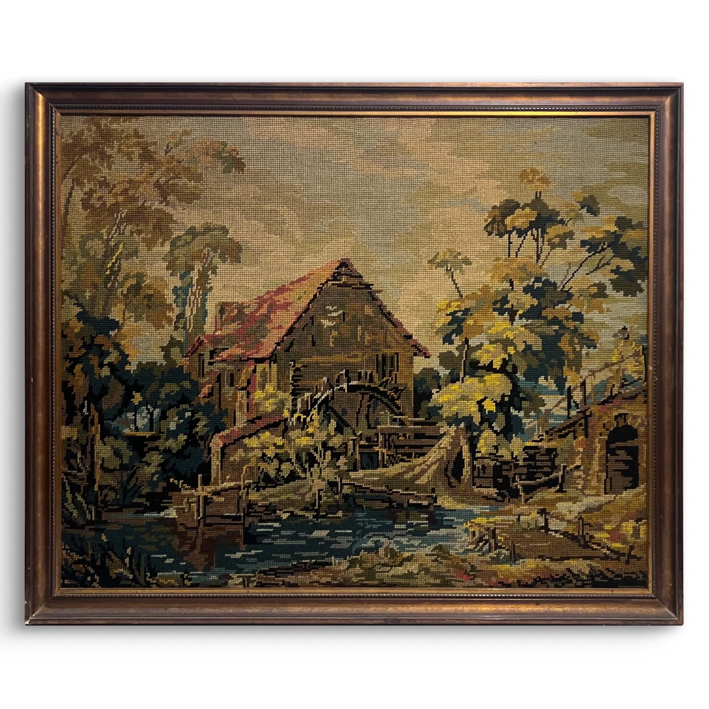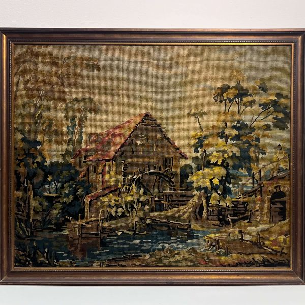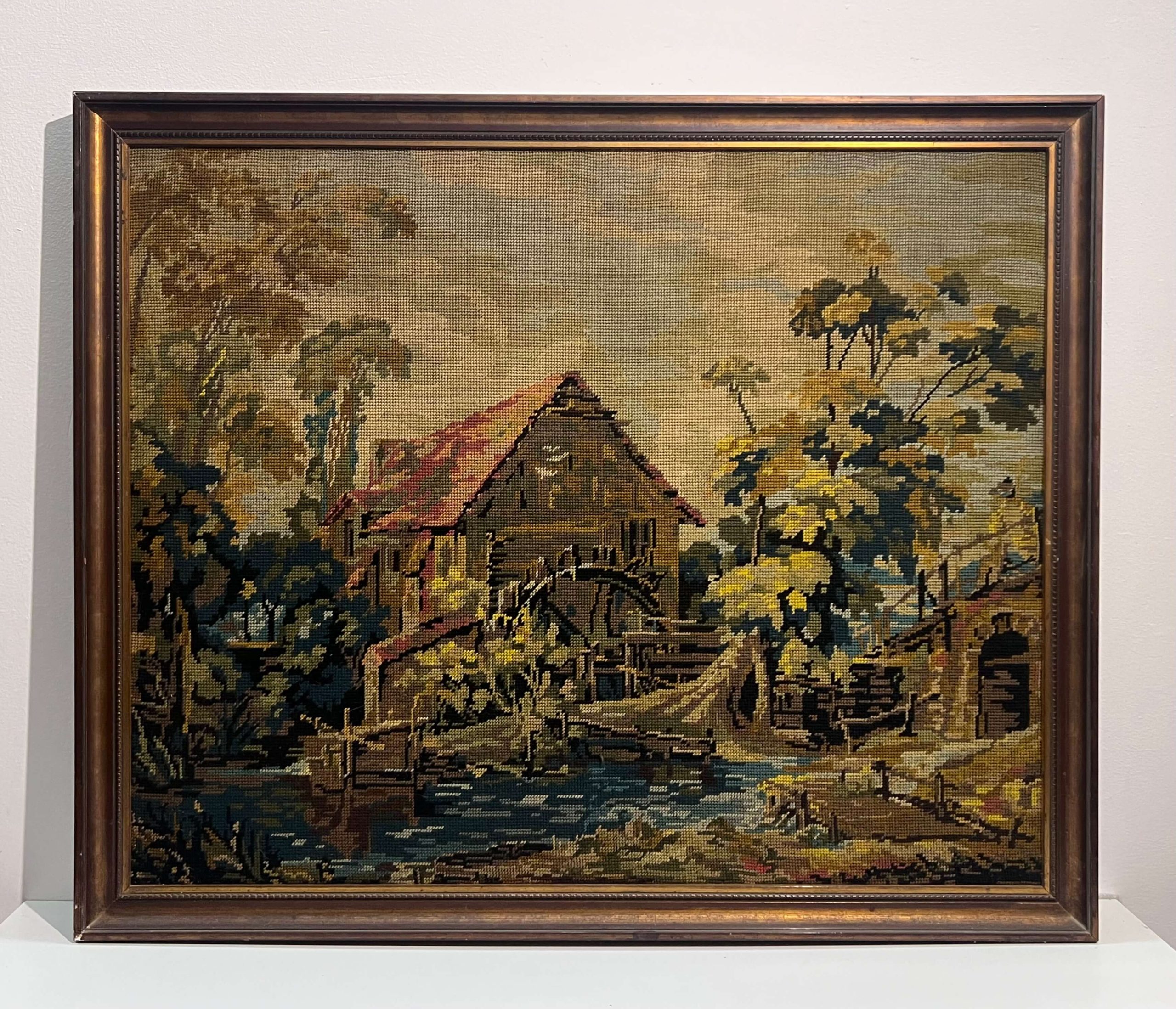 Hímzés. Nagy méretű, múltat idéző gobelin munka Nyugat-Európából szép keretben, azonnal falra akasztható állapotban.