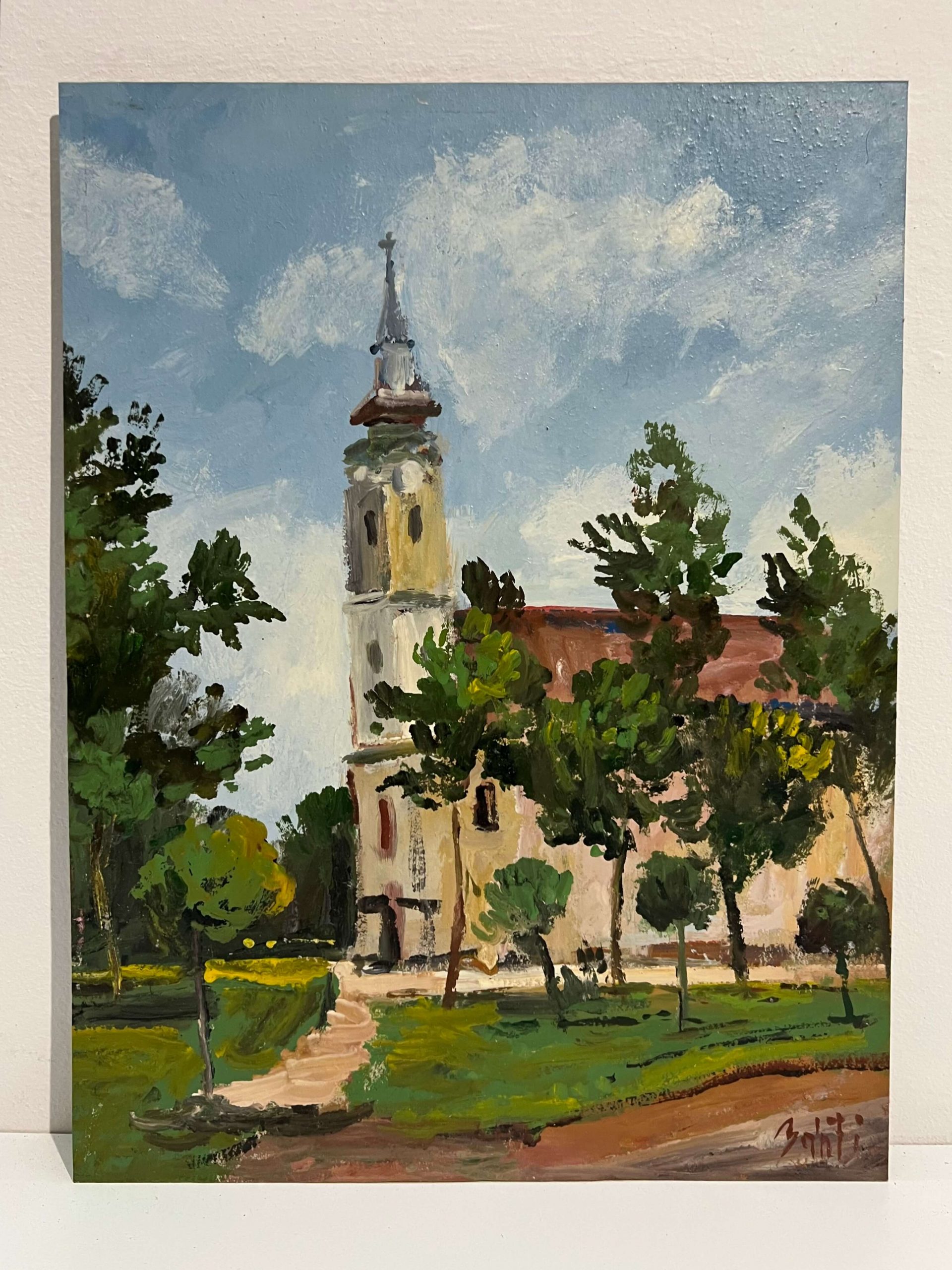 Igényesen megfestett látkép templommal, olaj-karton alkotás a 80-90-es évekből Bánfi József (1936- ) híres magyar festőművésztől! Személyesen a művésztől lett vásárolva a kép! Igazi gyűjtői darab, befektetésre is ajánlva!