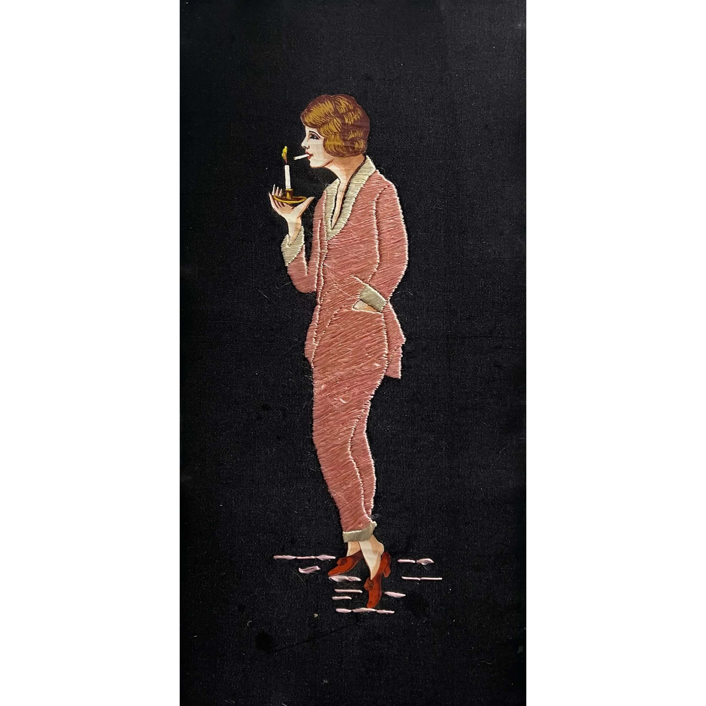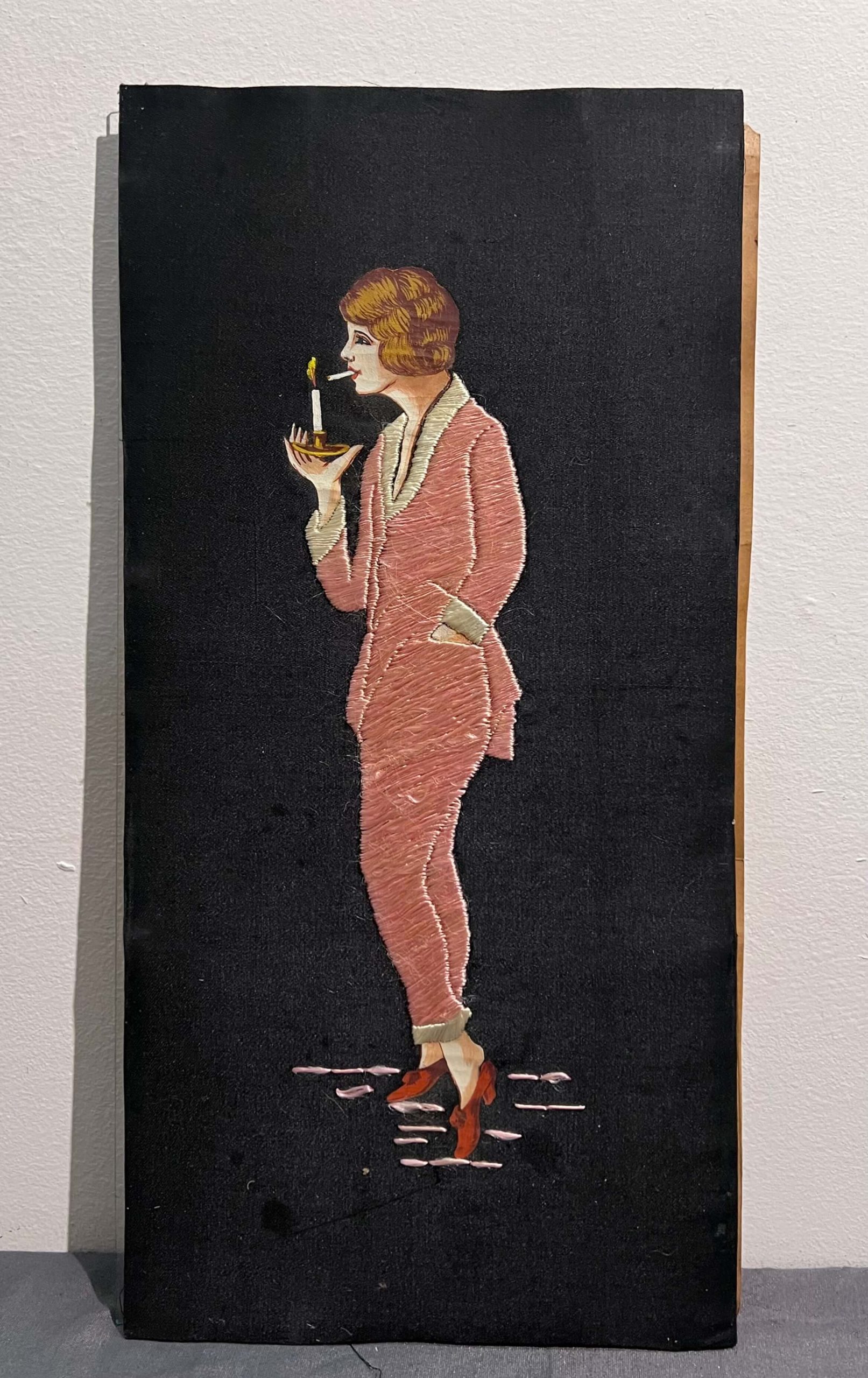 Régi, nagyon művészi, art déco stílusú hímzés fekete selyemre készítve, amely egy hozzáillő keretezést igényel. Igazi különlegesség, egyedi kézimunka!