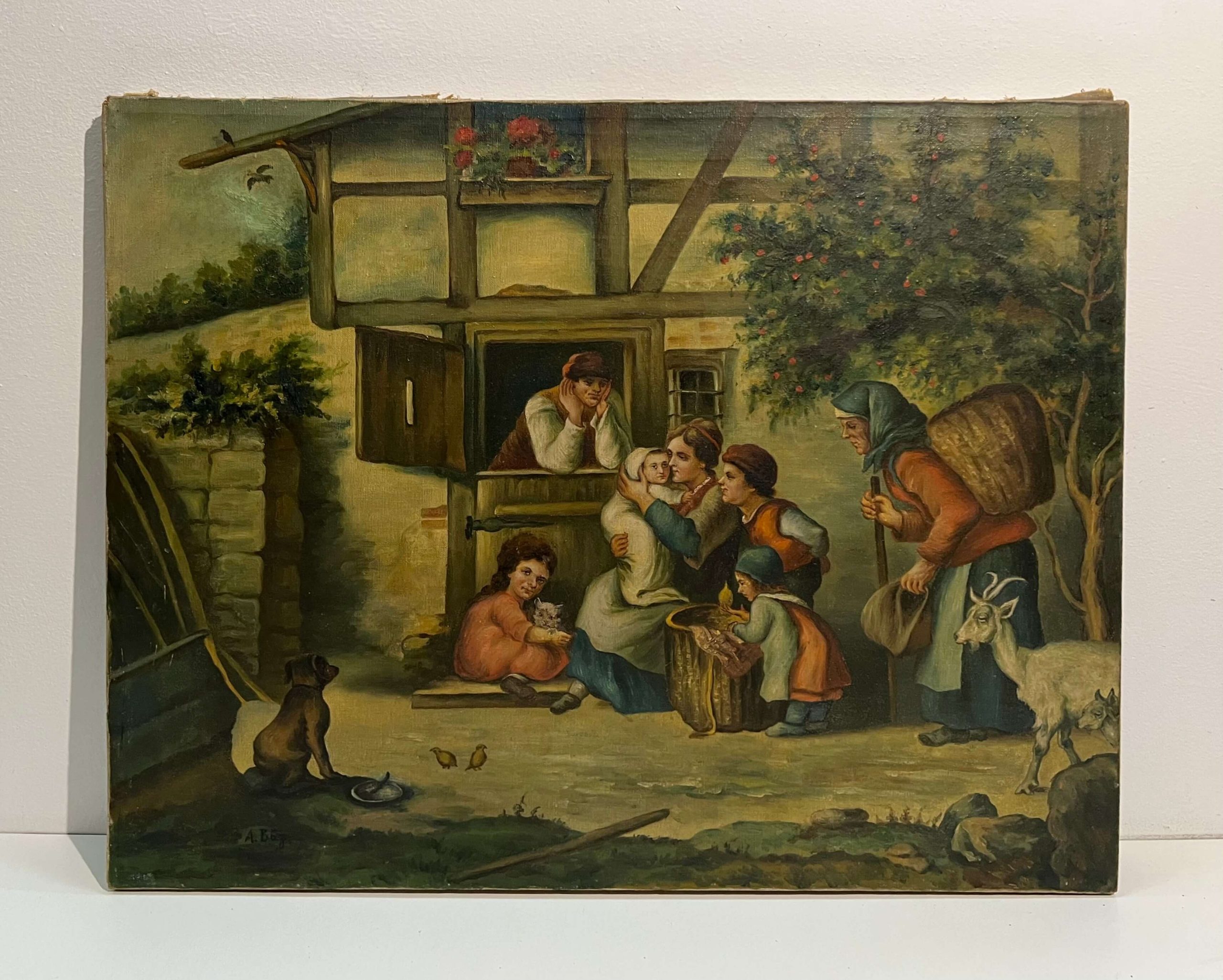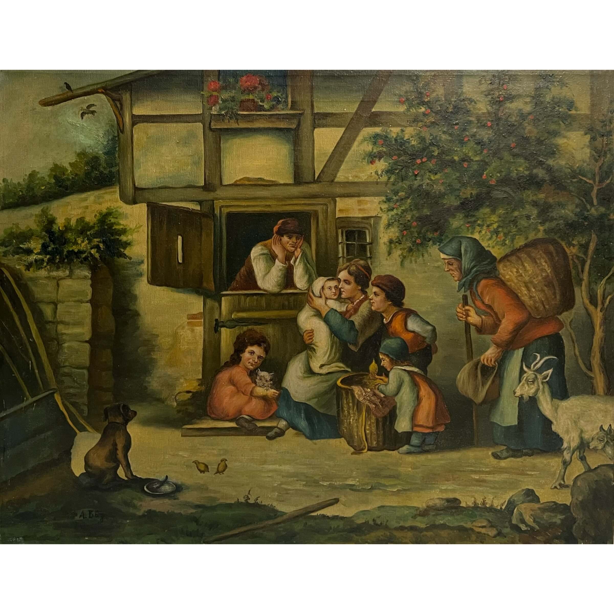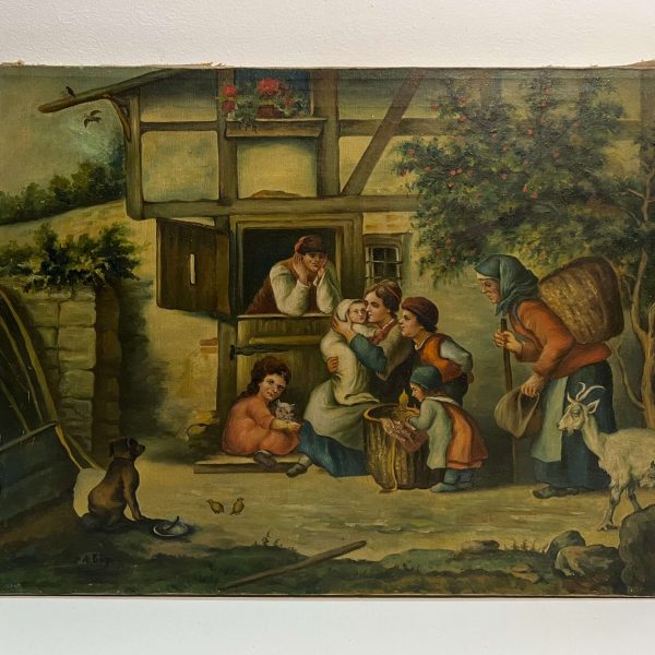 Régi, nagyon különleges hangulatú, múltba repítő olaj-vászon alkotás, németalföldi jelenetet bemutató életkép az 1800-as évek végéről, amely korban is hozzáillő keretezést igényel. A művész beazonosítása folyamatban van! Extra gyűjtői darab!