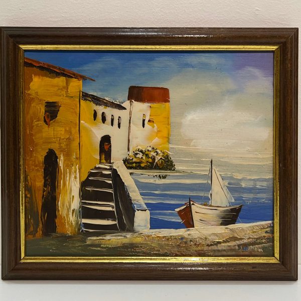 Nyarat idéző, kellemes színvilágú tengerparti látkép ábrázolás szépen keretezve a 80-90-es évekből, esetleg a 2000-es évek elejéről. Azonnal falra akasztható kis szépség!