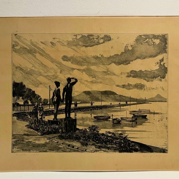 Extra jó, retró hangulatú balatoni életkép ábrázolás, szocreál grafikai munka Csurgói Máté Lajos (1931-2001) híres magyar festő, grafikustól, amely csak egy jó keretezésre és gyűjtőre vár.