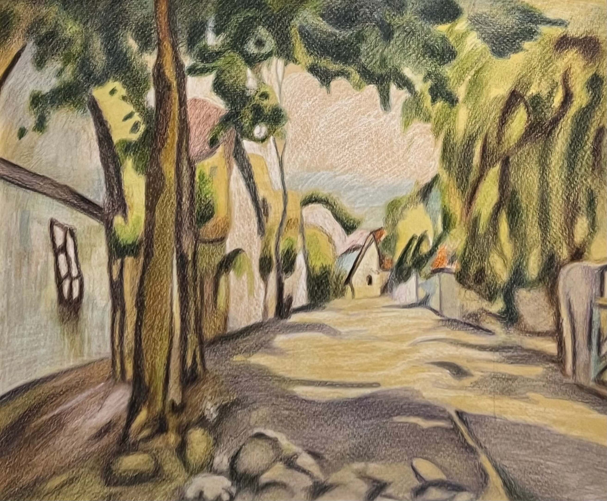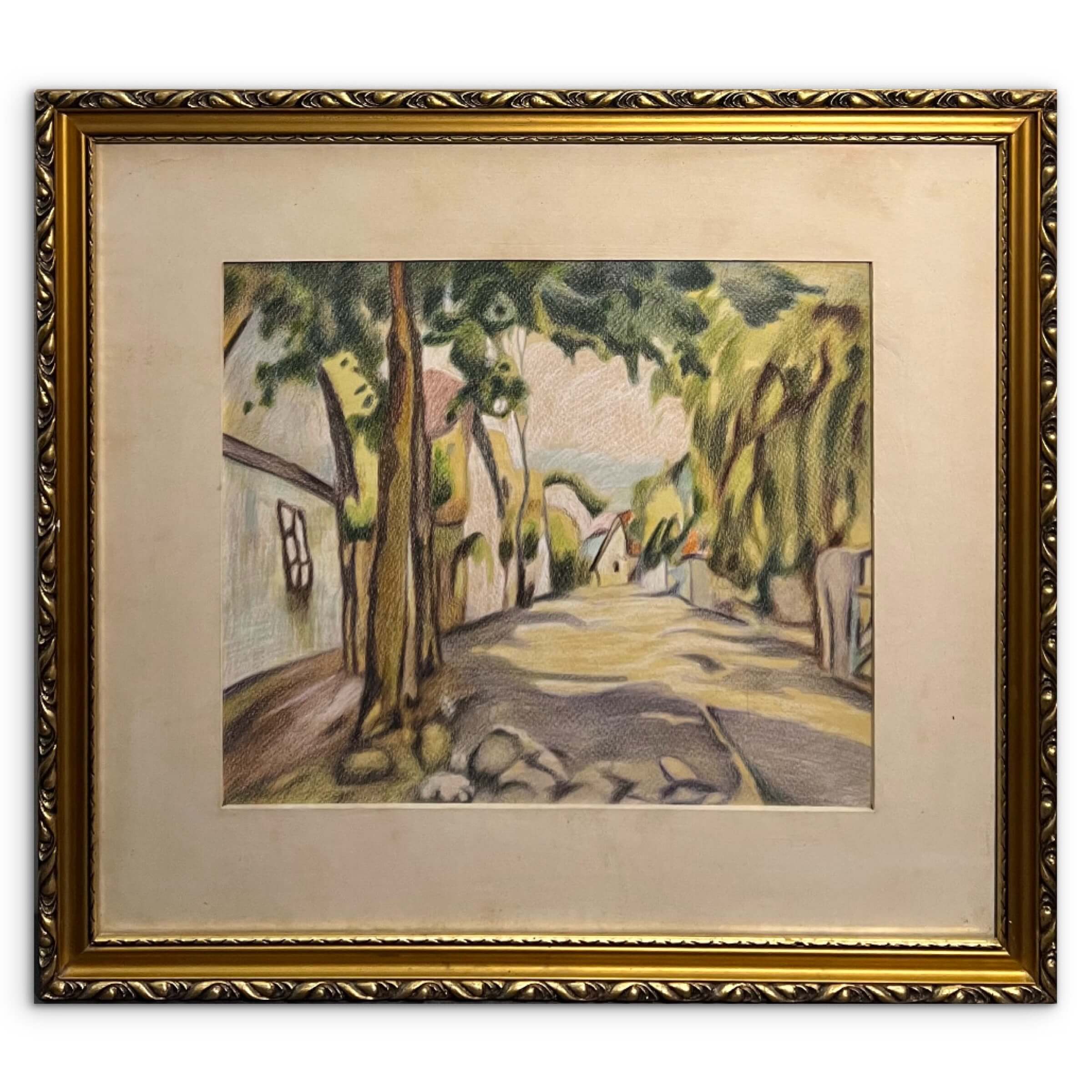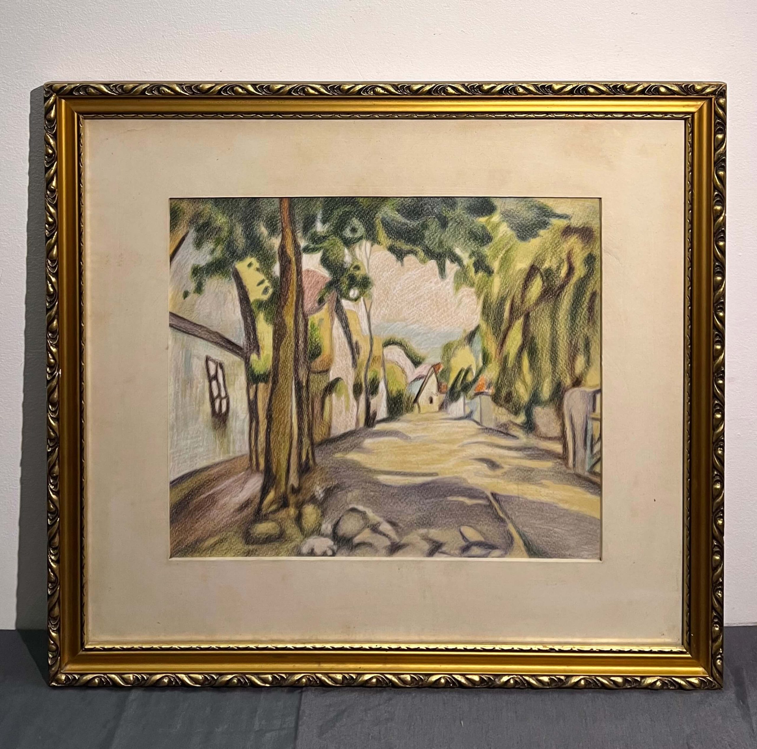Fantasztikus, nagybányai stílusú utcakép ábrázolás ismeretlen művésztől gyönyörű, üvegezett keretben, azonnal falra akasztható állapotban.