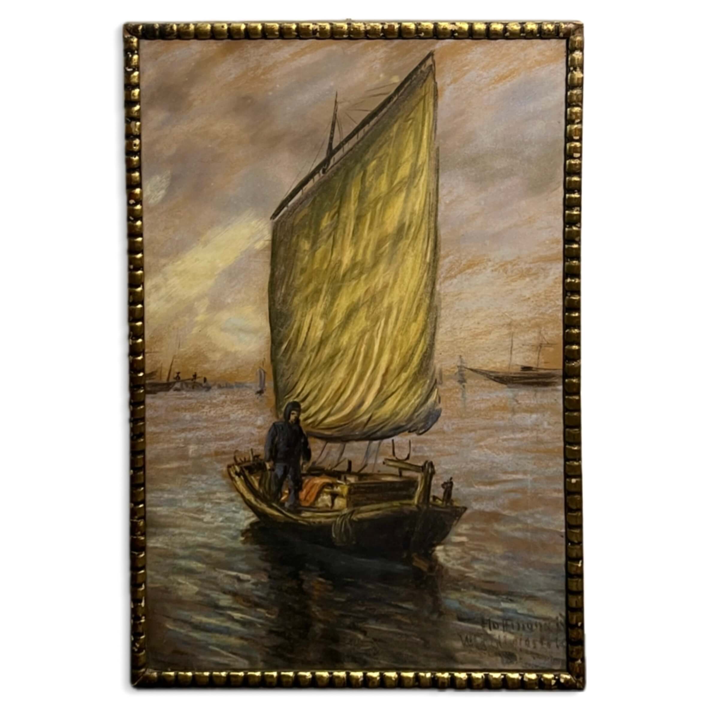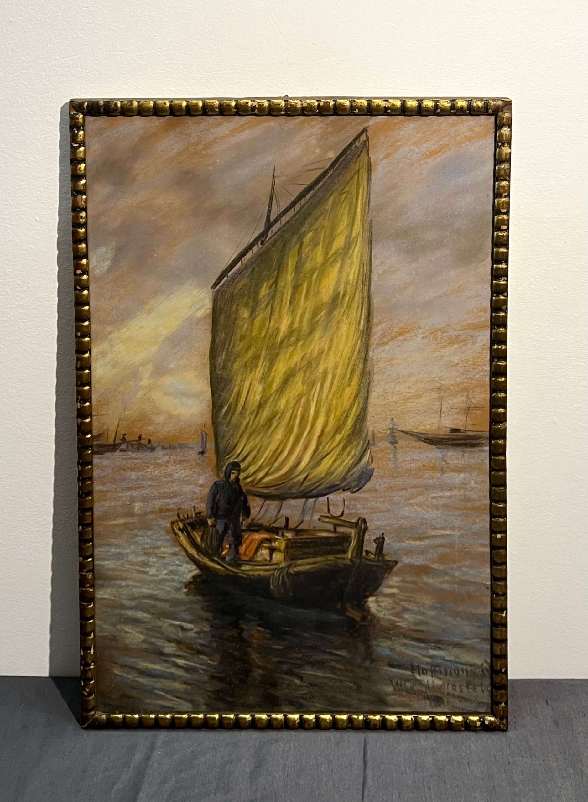 Régi, nagyon igényes, művészien elkészített vízparti látkép, kihajózó halászt megörökítő életkép Hoffmann Antal (1895- ) festőművésztől hozzáillő, üvegezett keretben, azonnal falra akasztható állapotban.