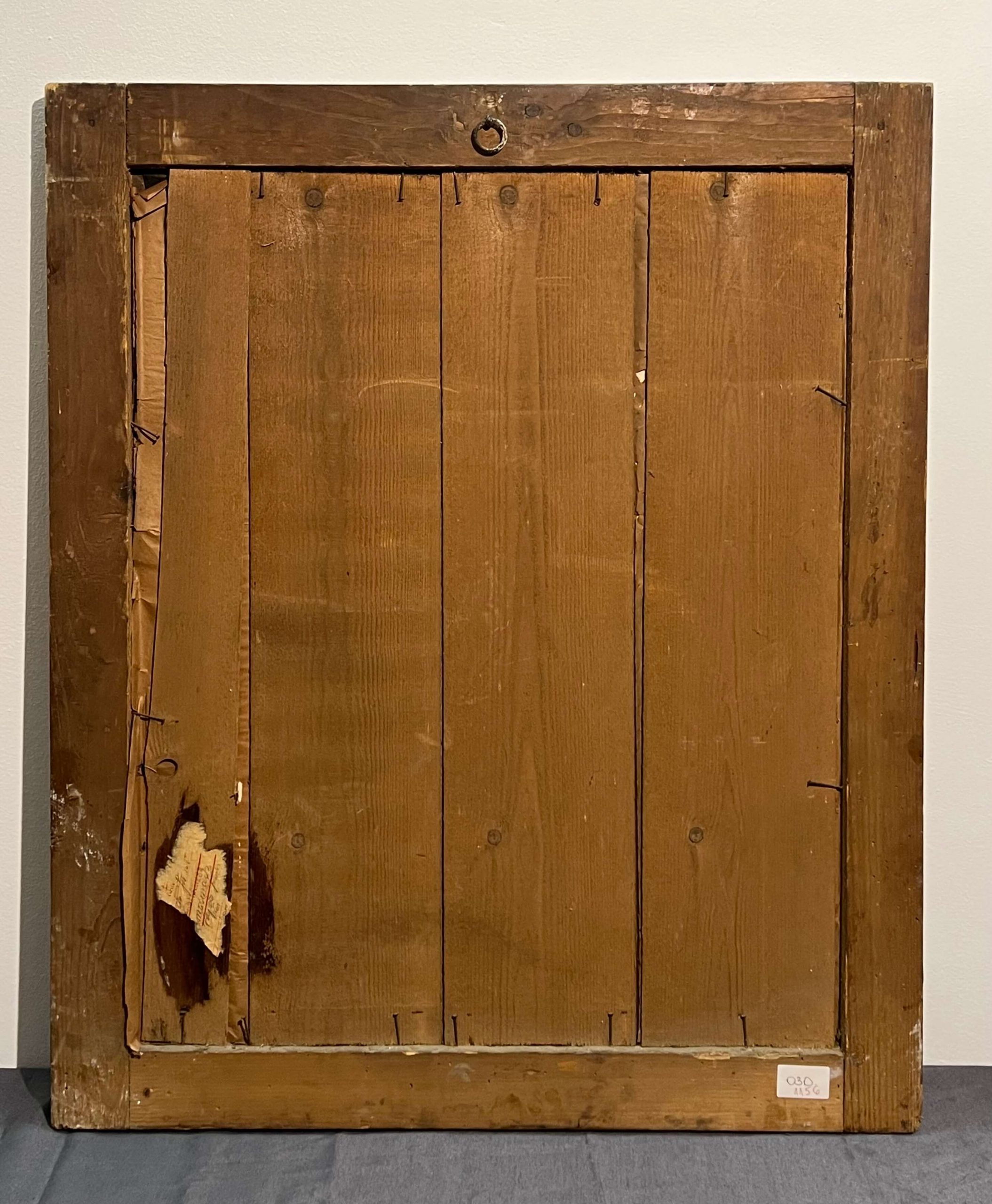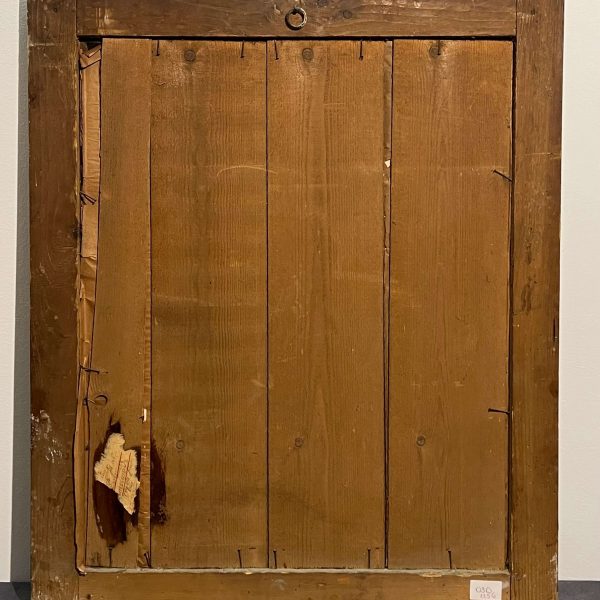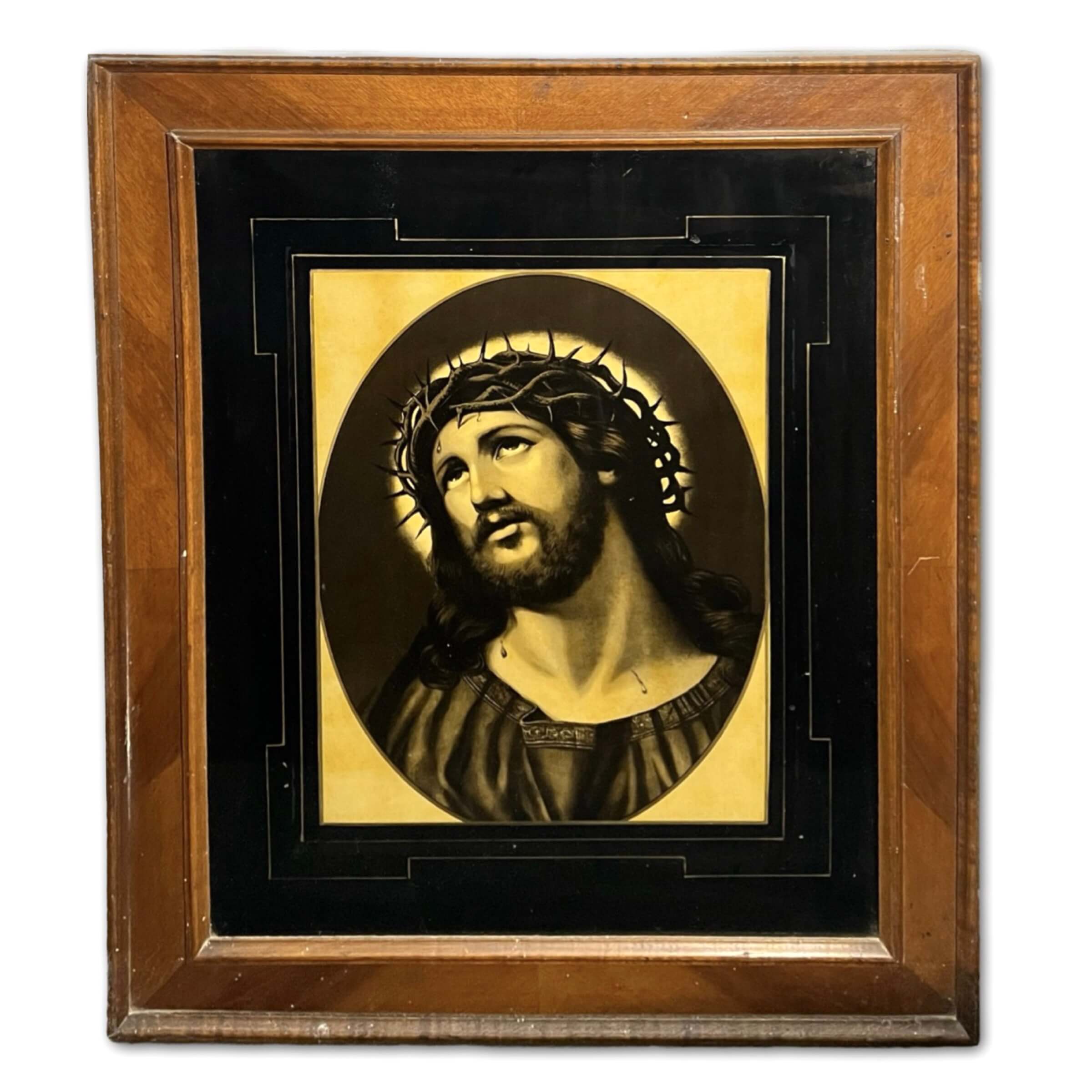 Nagy méretű, legalább 100 éves vallási alkotás, különleges technikával készített üvegnyomat üvegezett, régi, antik keretben, azonnal falra akasztható állapotban. Párja a Mária kép (031).