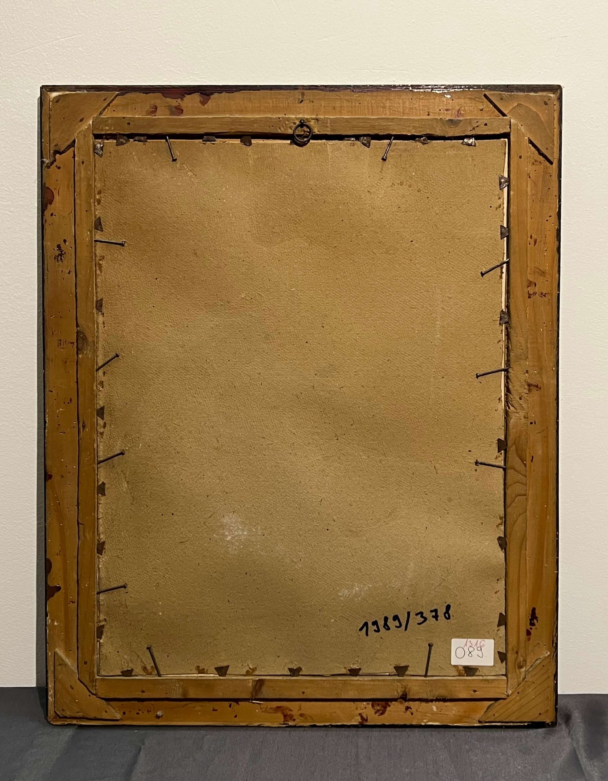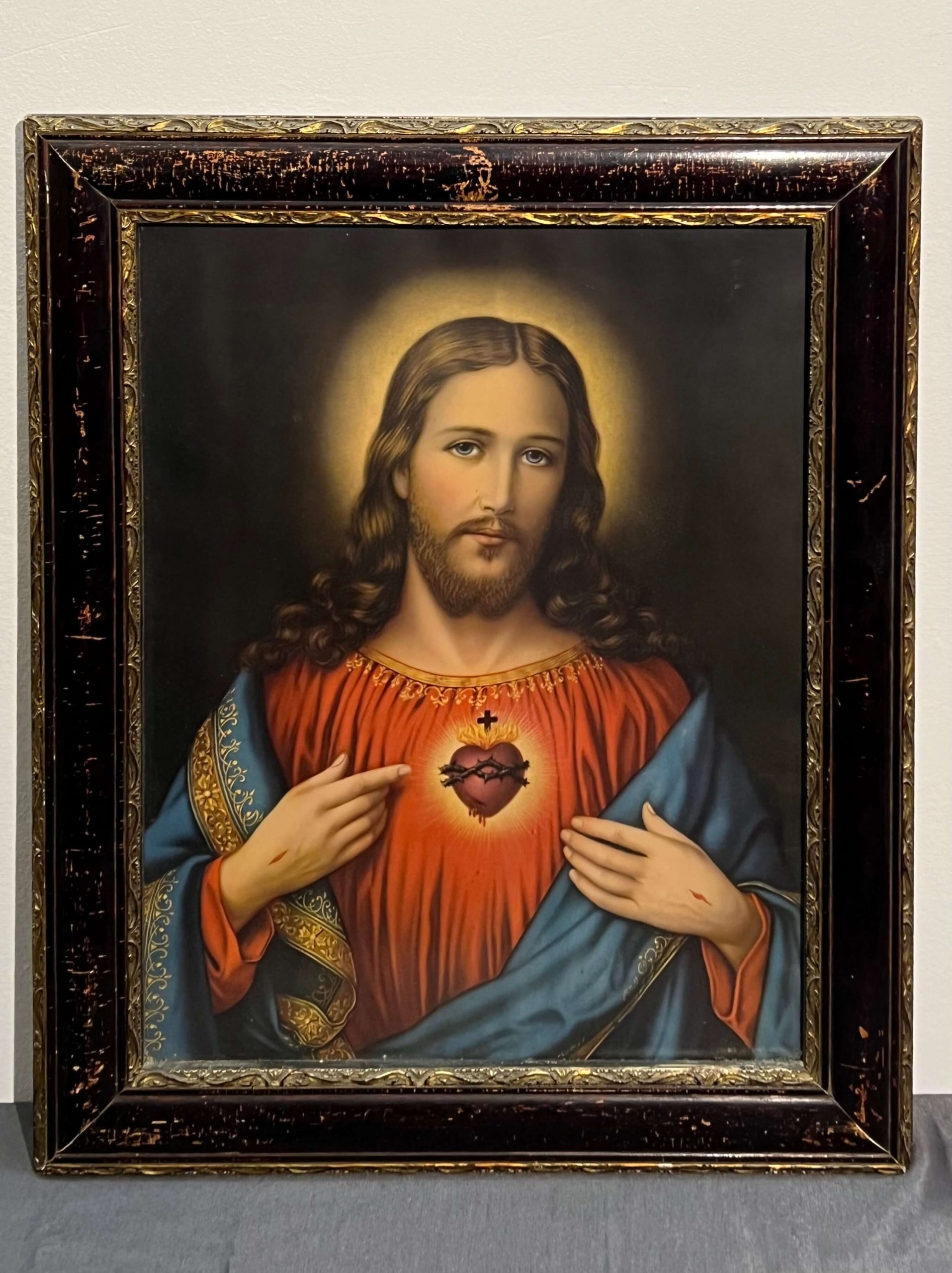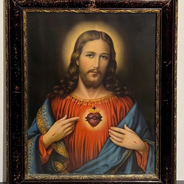 Régi korból származó antik olajnyomat (nem kézimunka). Jellegzetes vallási kép üvegezett, gyönyörű, antik keretben. Párja a 090-es számú kép.