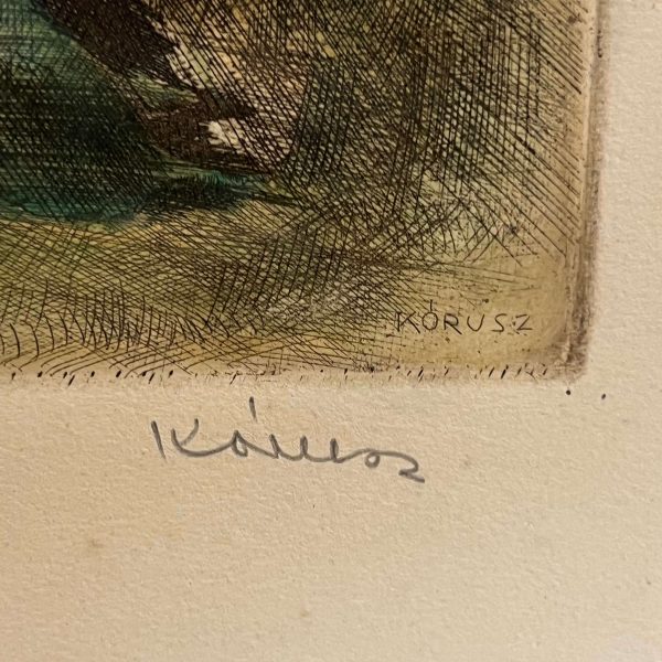 Régi, szépen elkészített színezett rézkarc alkotás Kórusz József (1927-2010) híres magyar festő, grafikustól, mely paszpartuzást és keretezést követően falra akasztható. Gyűjtői darab!