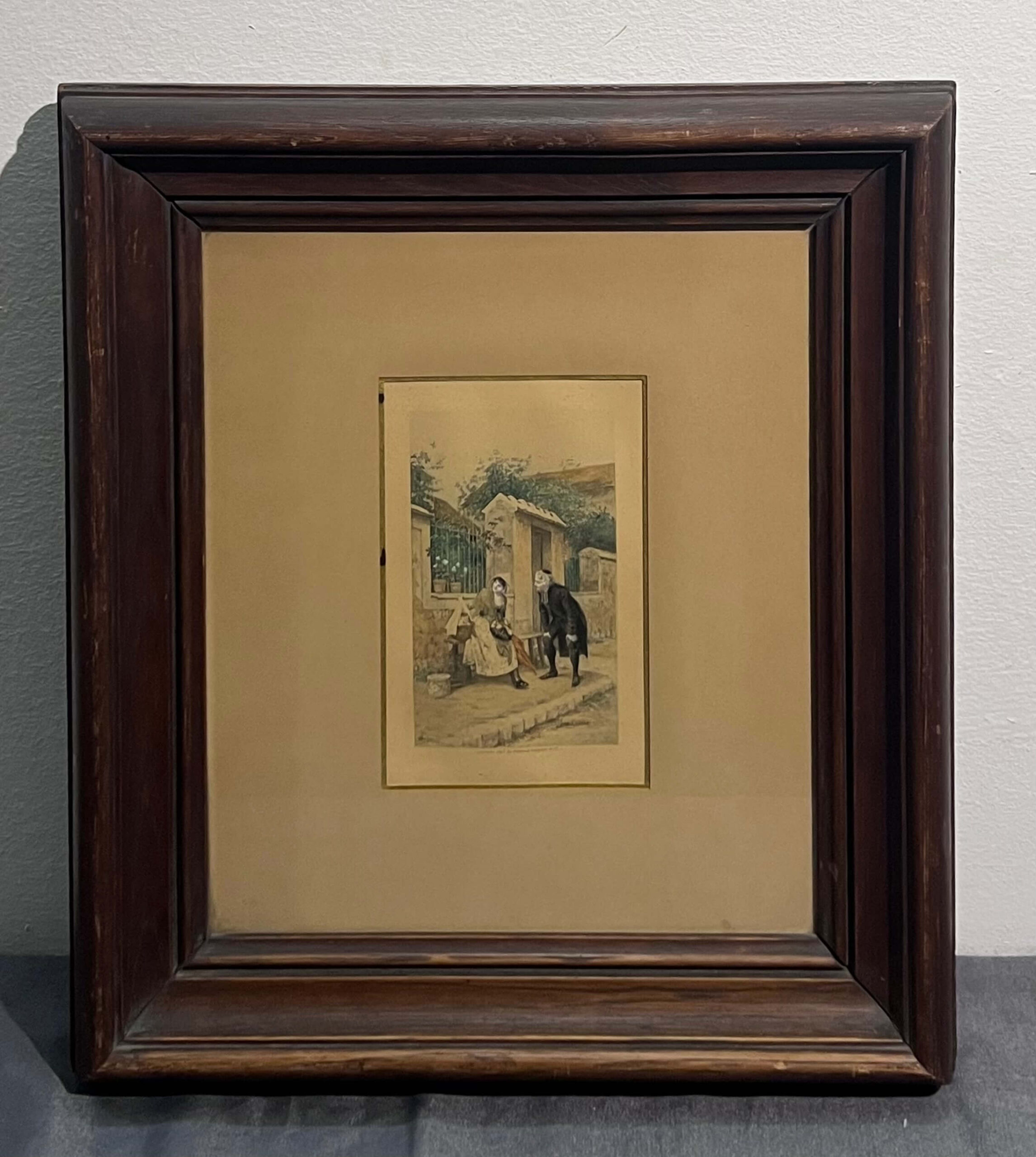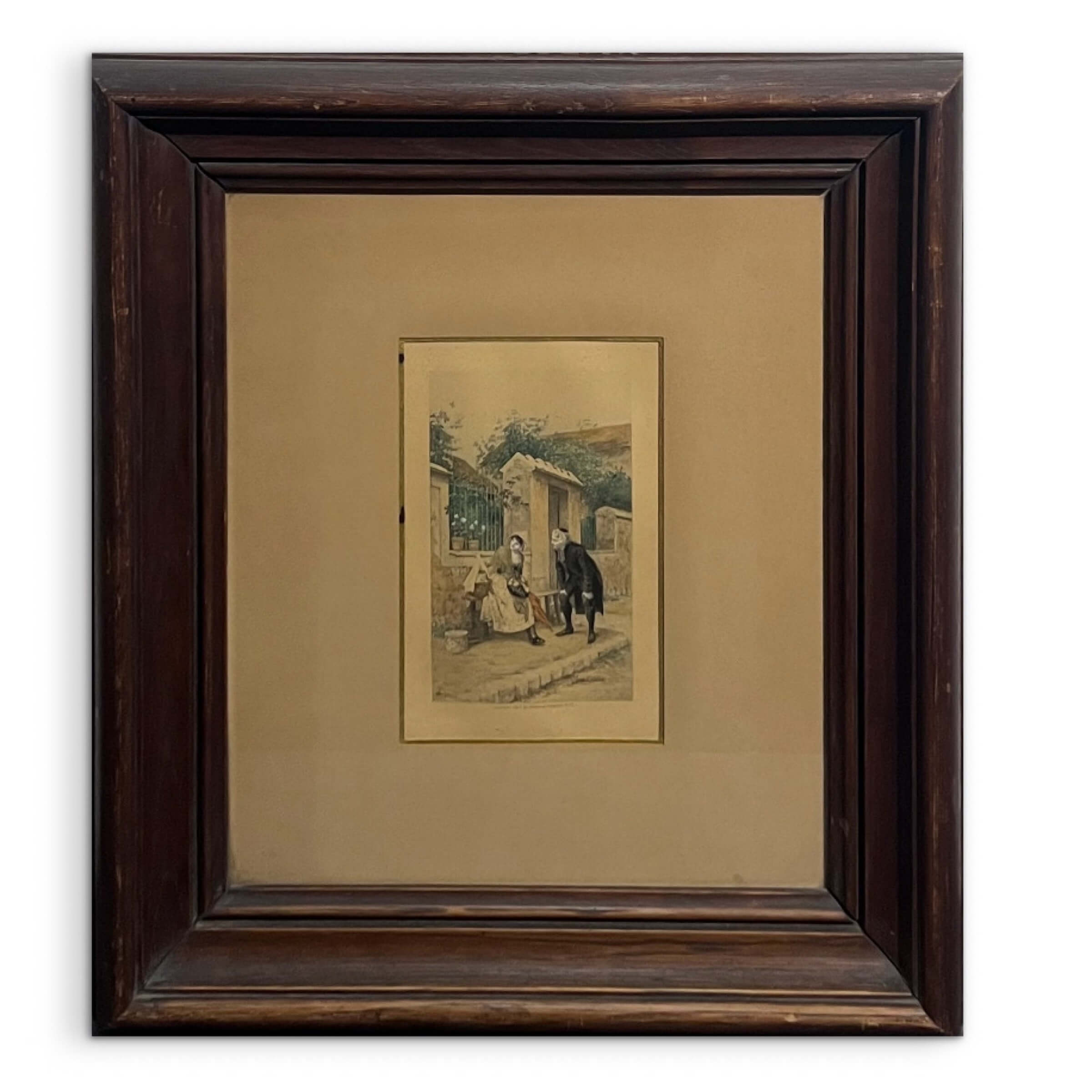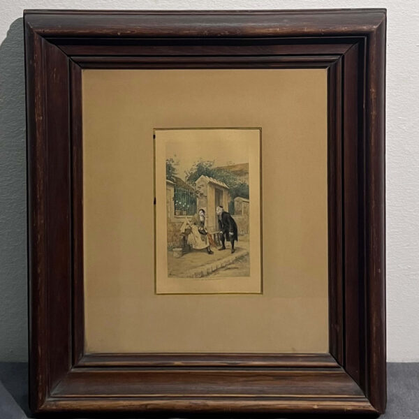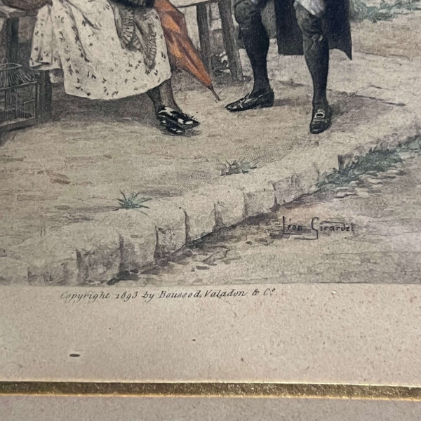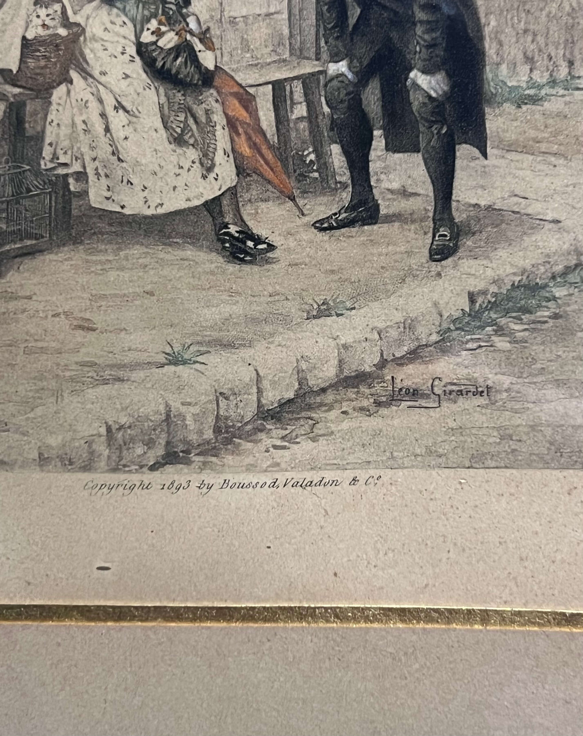 Nagyon régi színezett litográfia, párizsi ucatkép/életkép ábrázolás Léon Girardet (1856-1895) híres francia festő és metsző alkotásának grafikai másolata üvegezett keretben. A hátulján lévő szöveg alapján Freystädtler Jenő lovag pasától kapott ajándék volt ez az alkotás.
