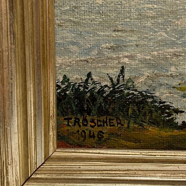 Gyönyörűen megfestett olajkép ‘TRŐSCHER’ szignóval ellátva 1946-ból, hozzáillő aranyozott keretben, azonnal falra akasztható állapotban! A művész beazonosítása folyamatban van! Gyűjtői darab!