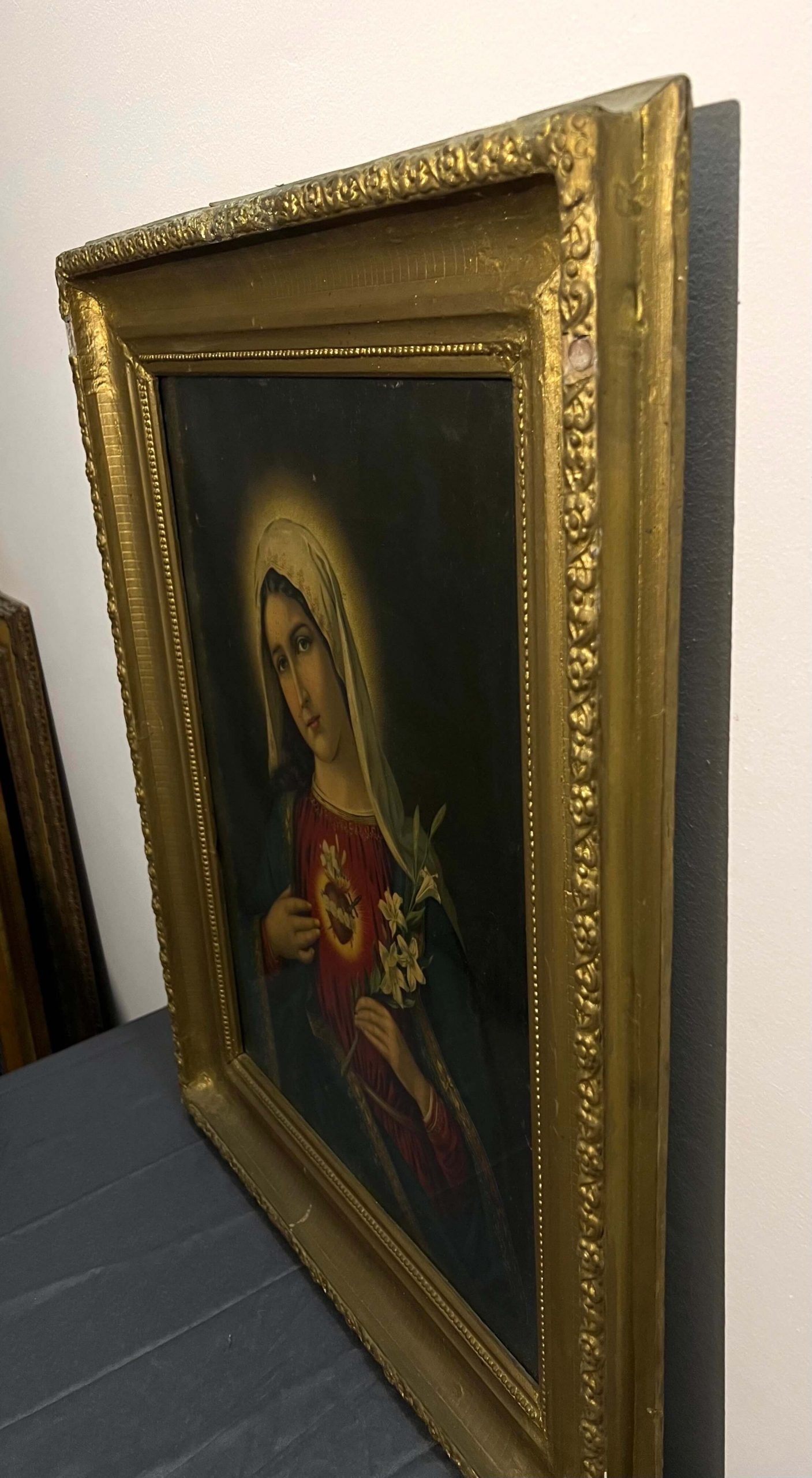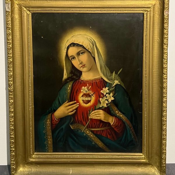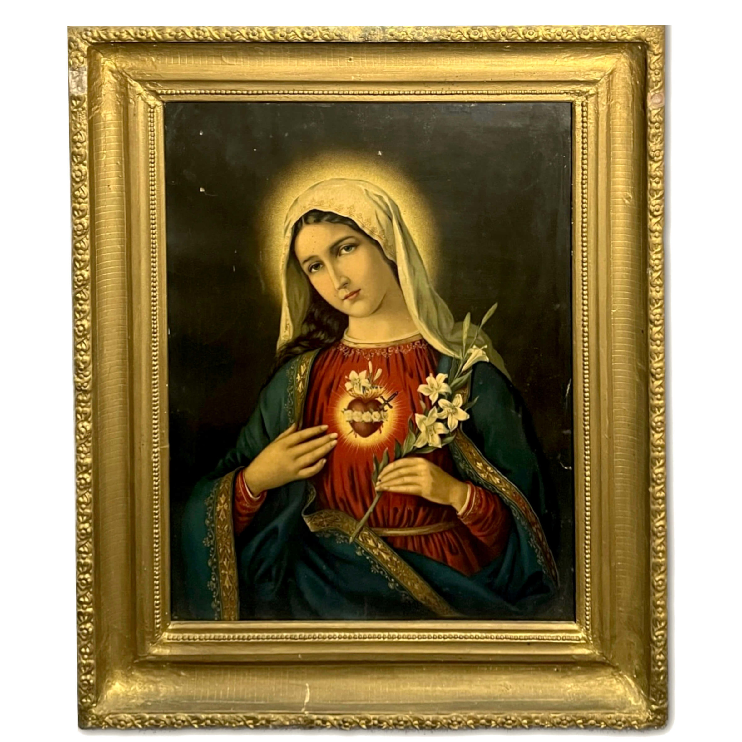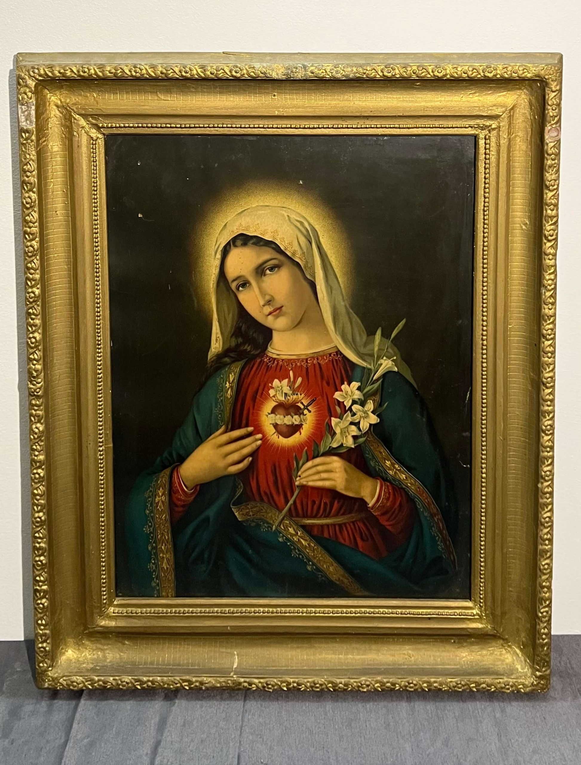 Régi, nagy méretű olajnyomat kartonon (vallási jelenet) régi, antik, üvegezett, arany színű keretben, amely nem hiányozhatott régen egyetlen otthonból sem. Páros kép.