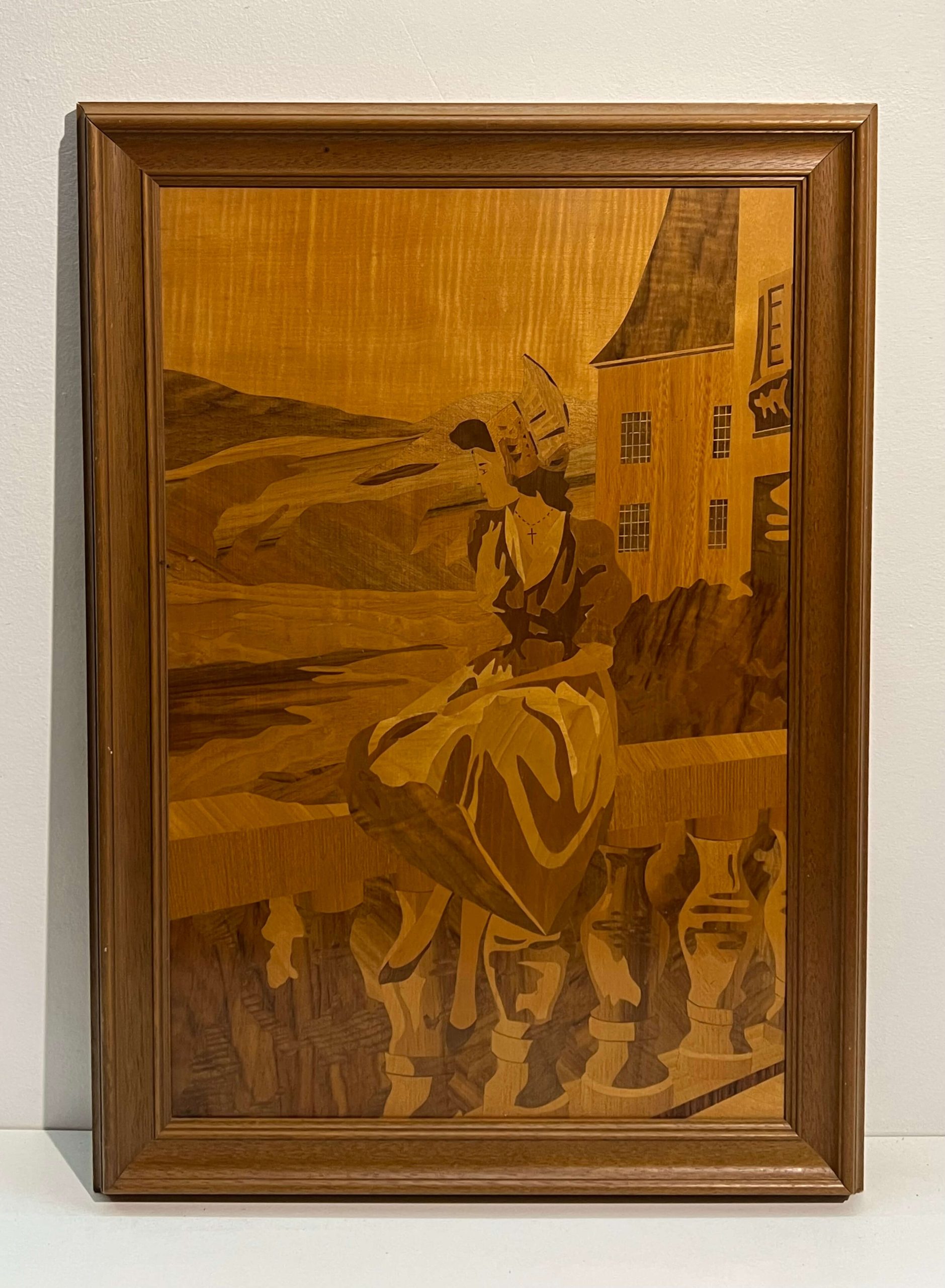 Szép intarzia kép Nyugat-Európából azonnal falra akasztható állapotban.