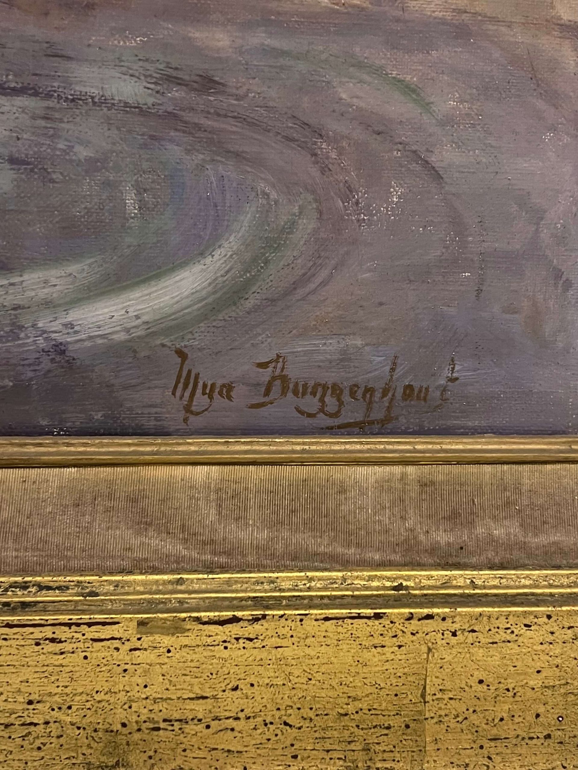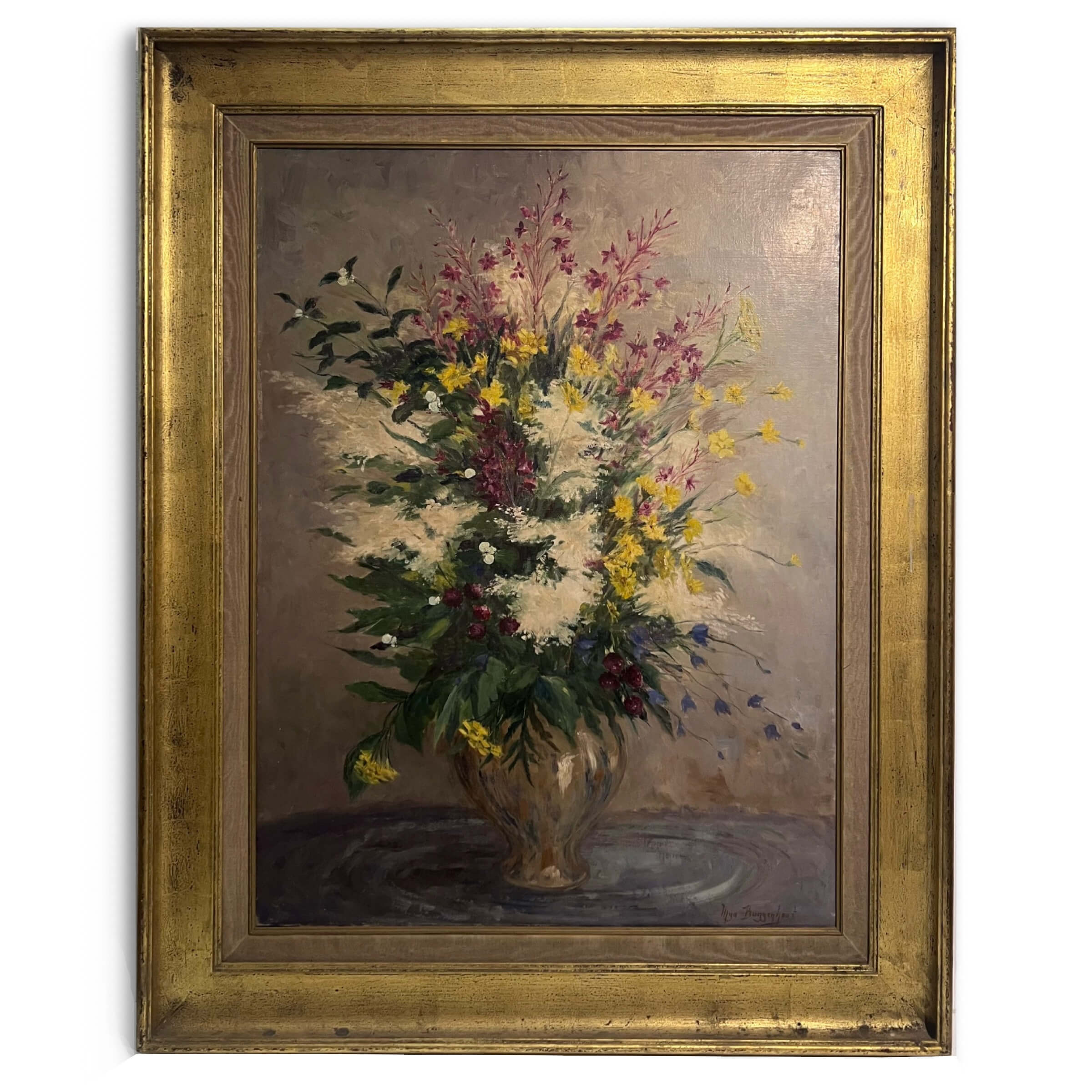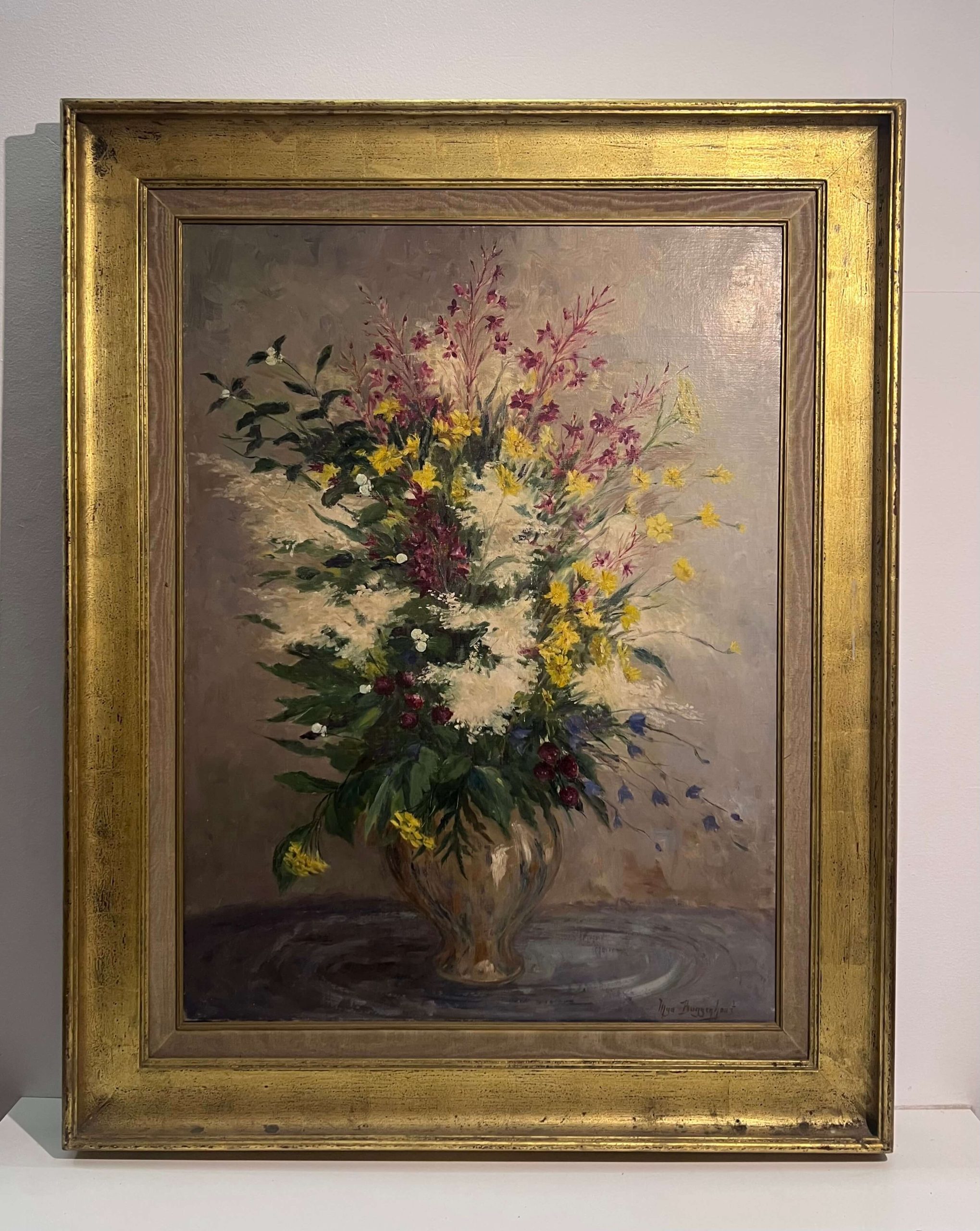 Régi, nagy méretű, nagyon művészien elkészített, kellemes színvilágú virágcsendélet Mya Buggenhout (1908-1992) híres belga művésztől hozzáillő keretben, azonnal falra akasztható állapotban!