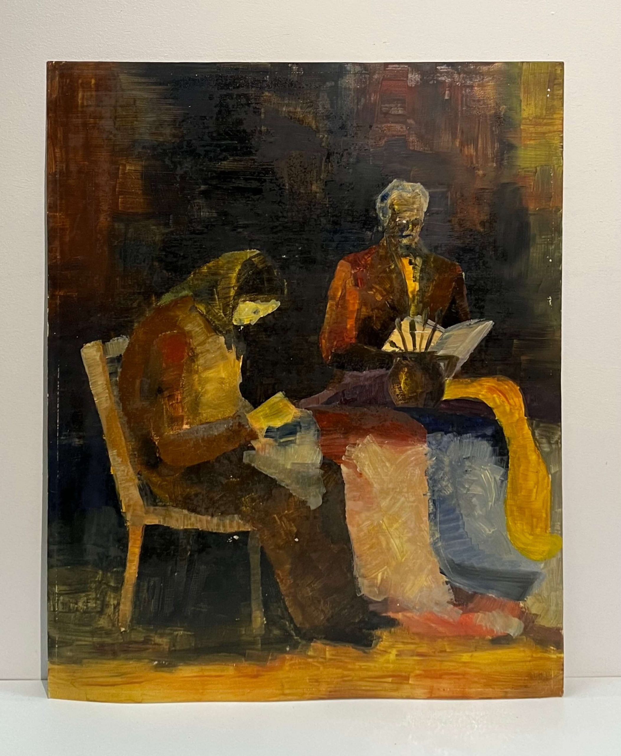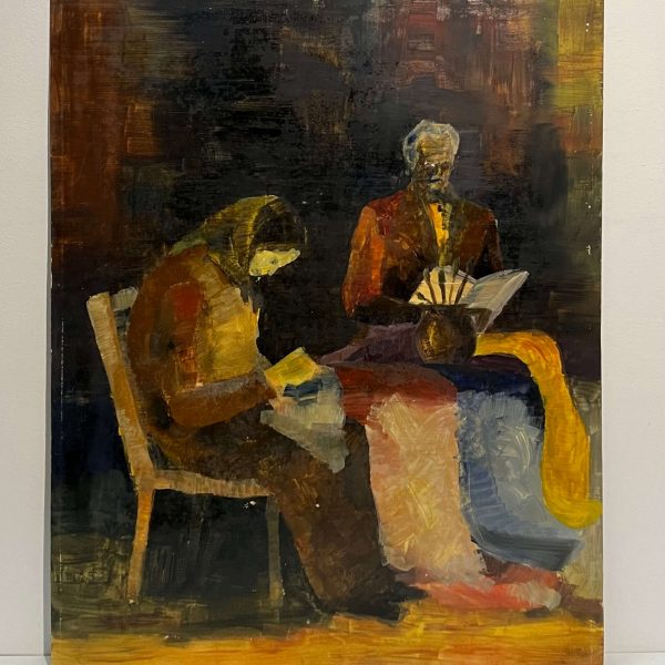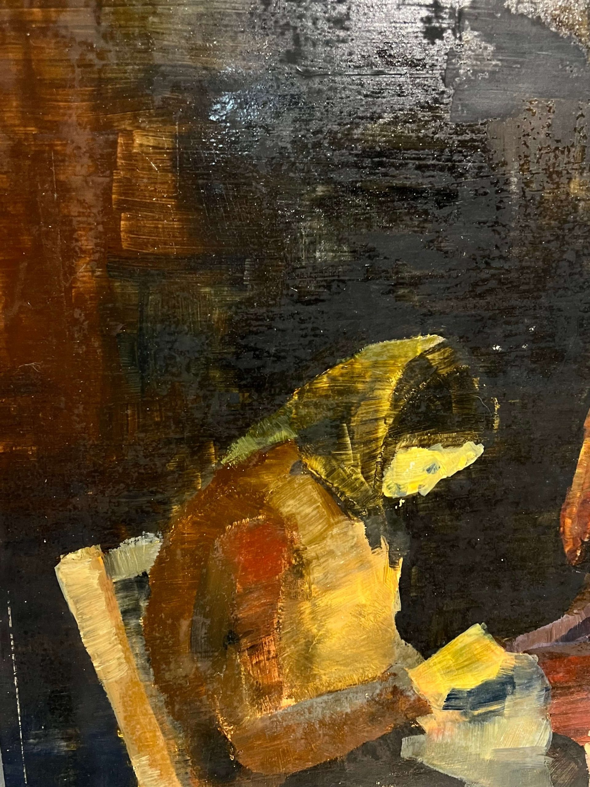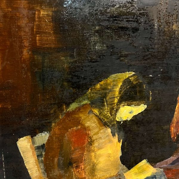 Nagyon kellemes színvilággal megfestett, nyugalmat árasztó életkép ábrázolás ismeretlen művésztől az 1950-60-as évek környékéről, amely egy hozzáillő keretezést igényel.