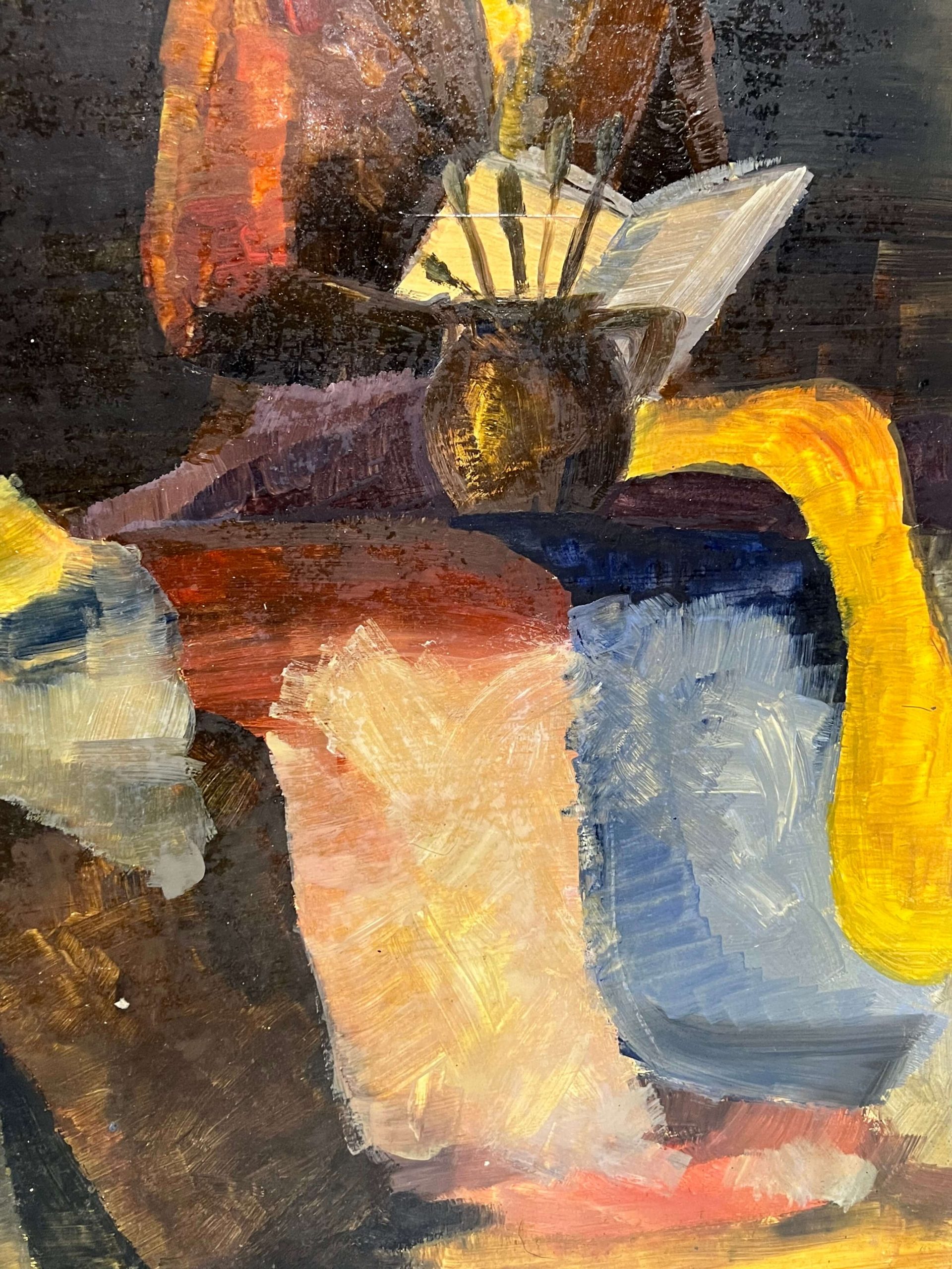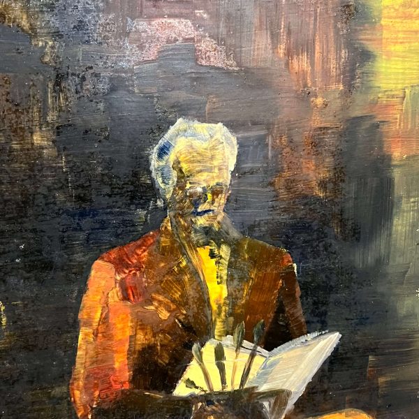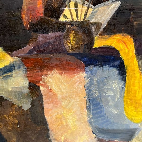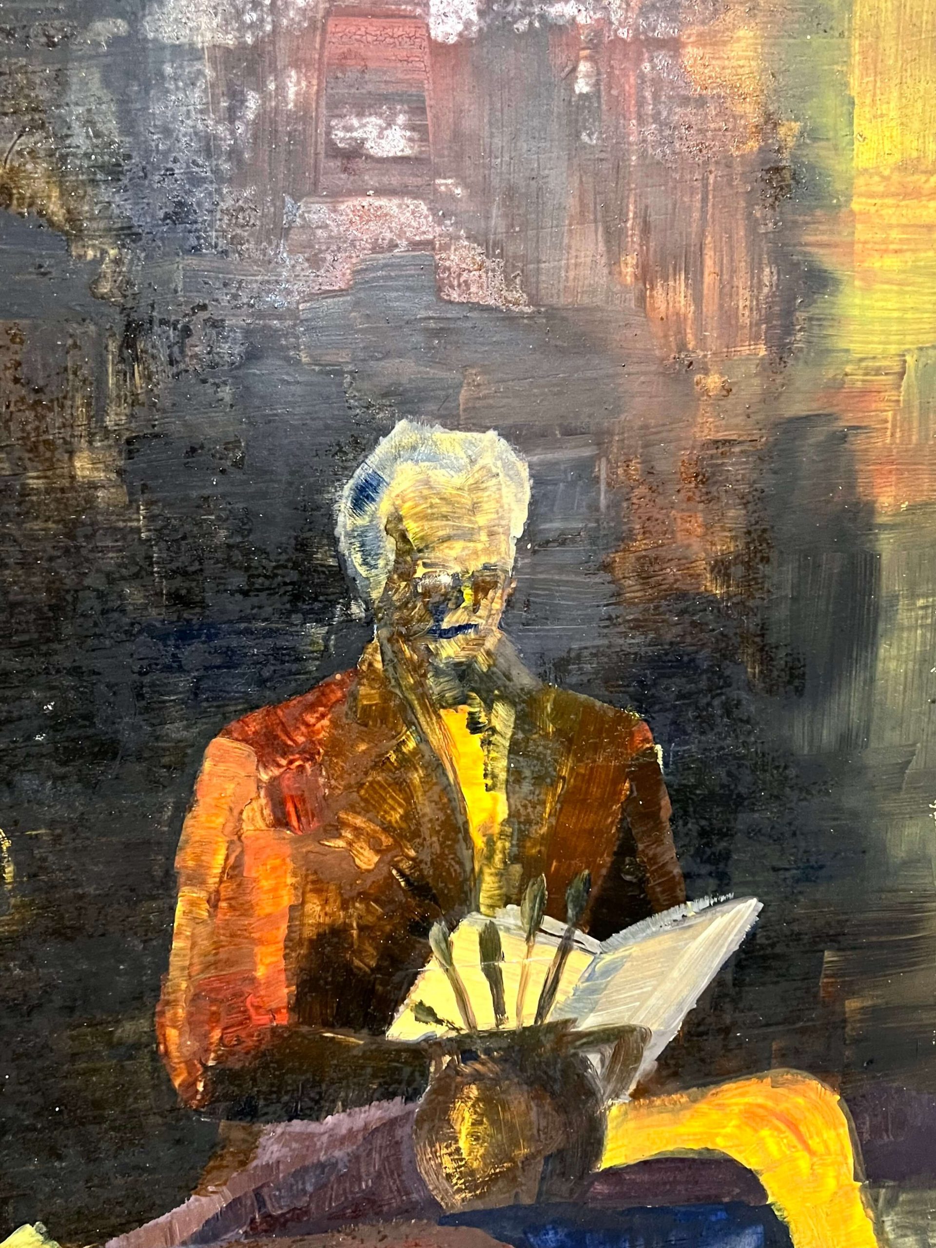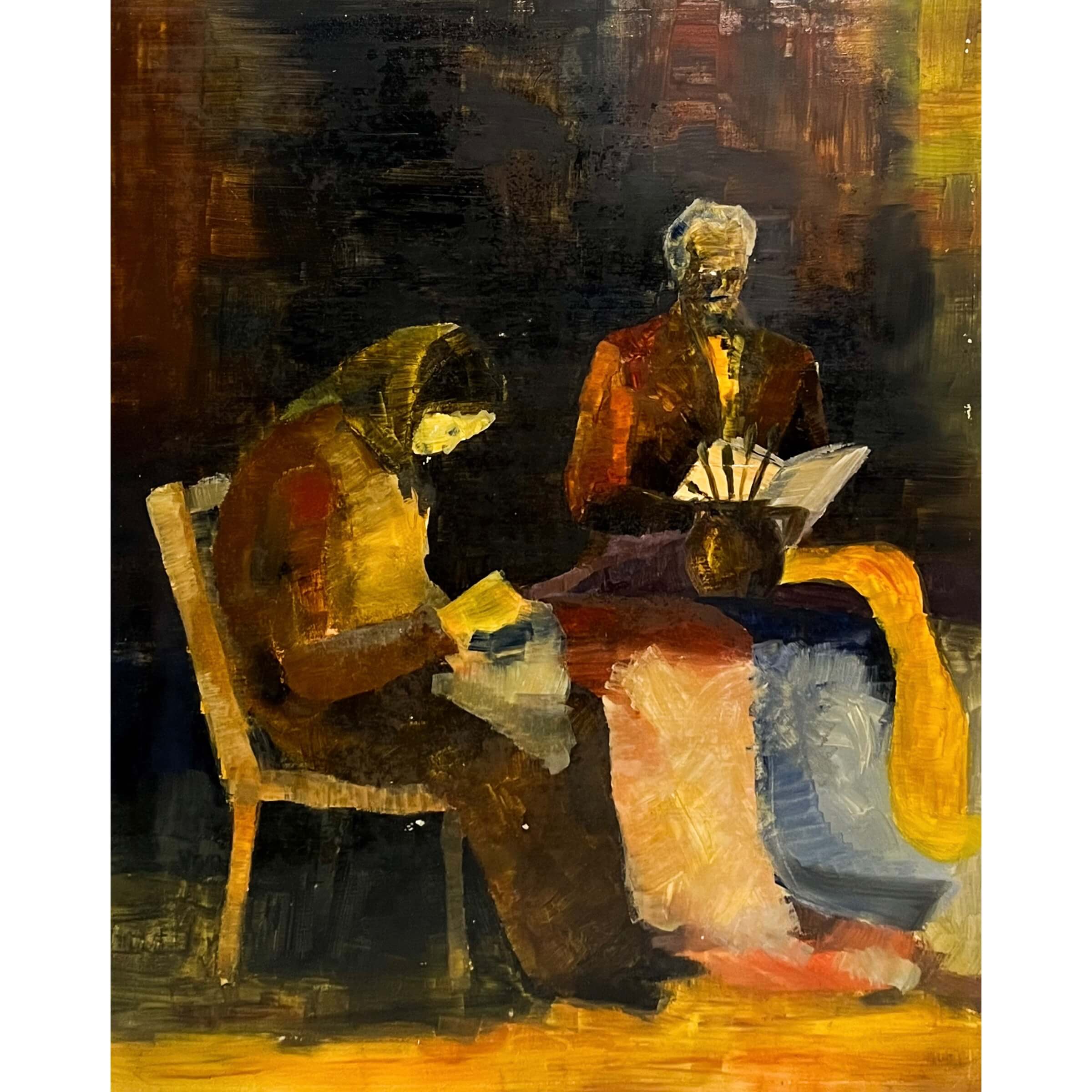 Nagyon kellemes színvilággal megfestett, nyugalmat árasztó életkép ábrázolás ismeretlen művésztől az 1950-60-as évek környékéről, amely egy hozzáillő keretezést igényel.
