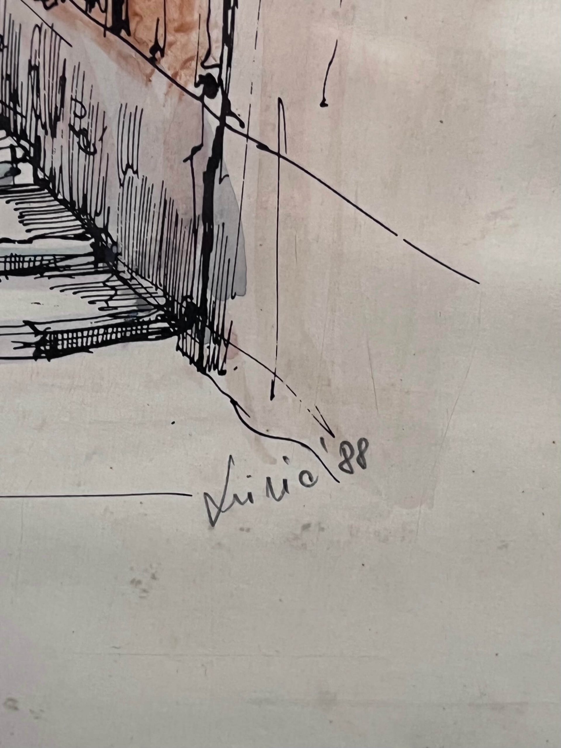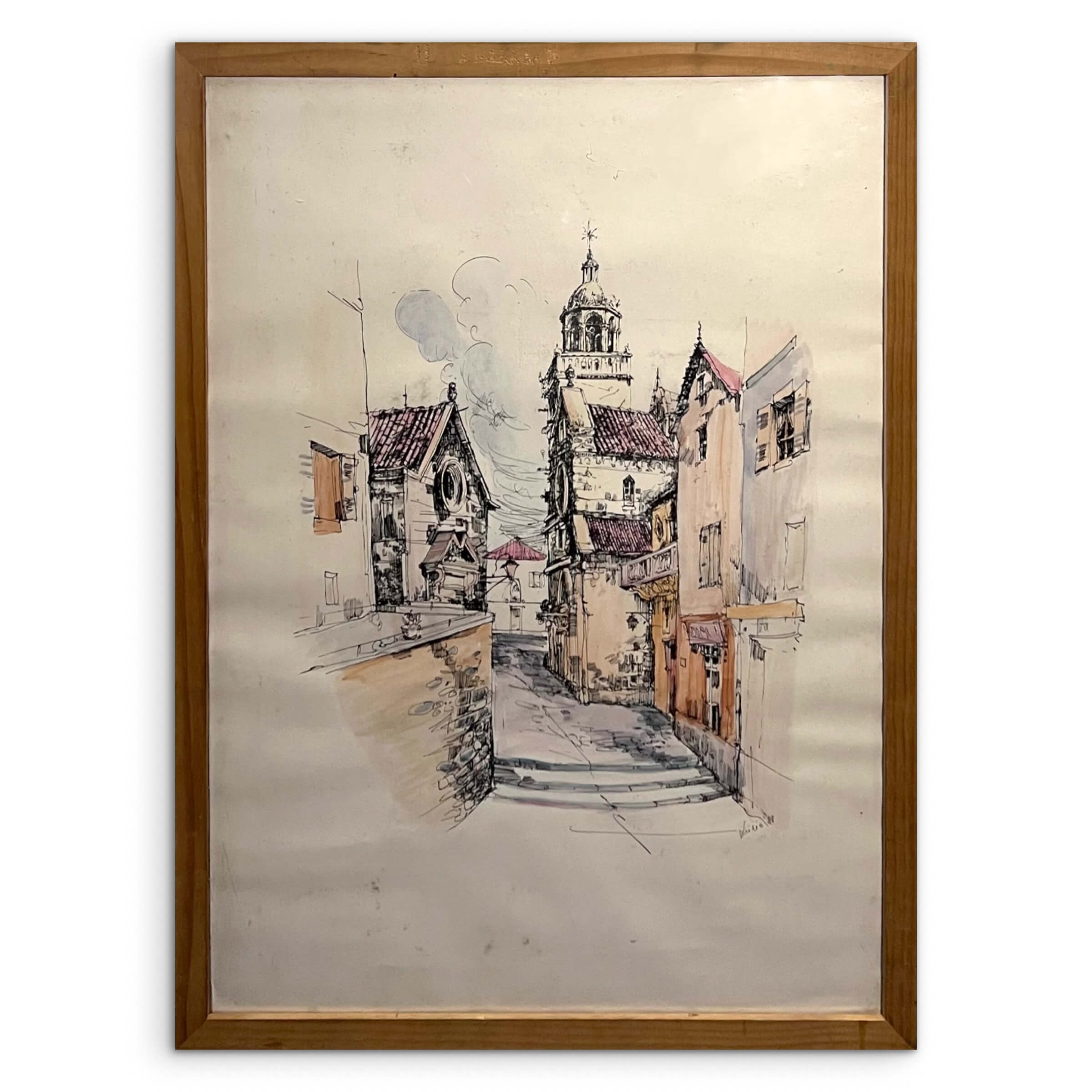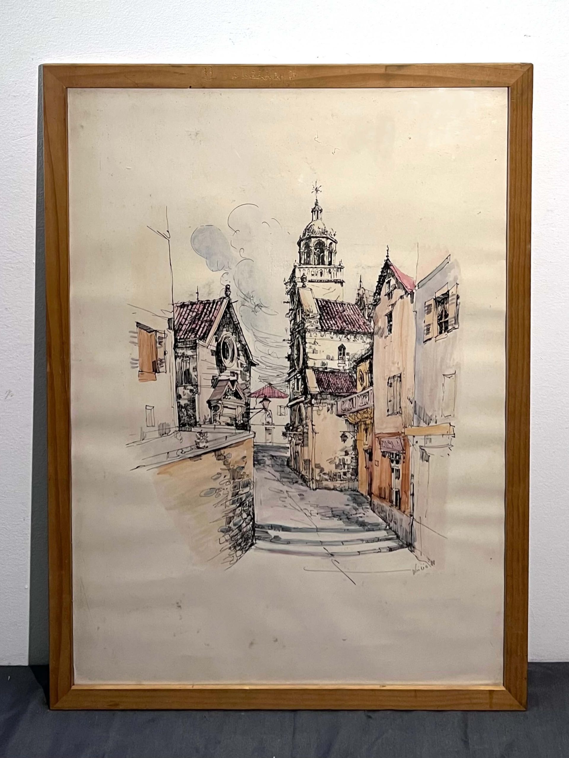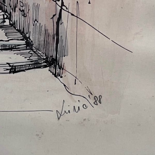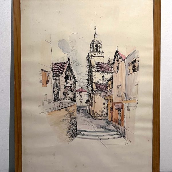 Nagy méretű, művészien elkészített színezett grafikai alkotás, utcakép ábrázolás 1988-ból eredeti keretében, de egy igényesebb keretezést igényel a kép. A művész beazonosítása folyamatban van.