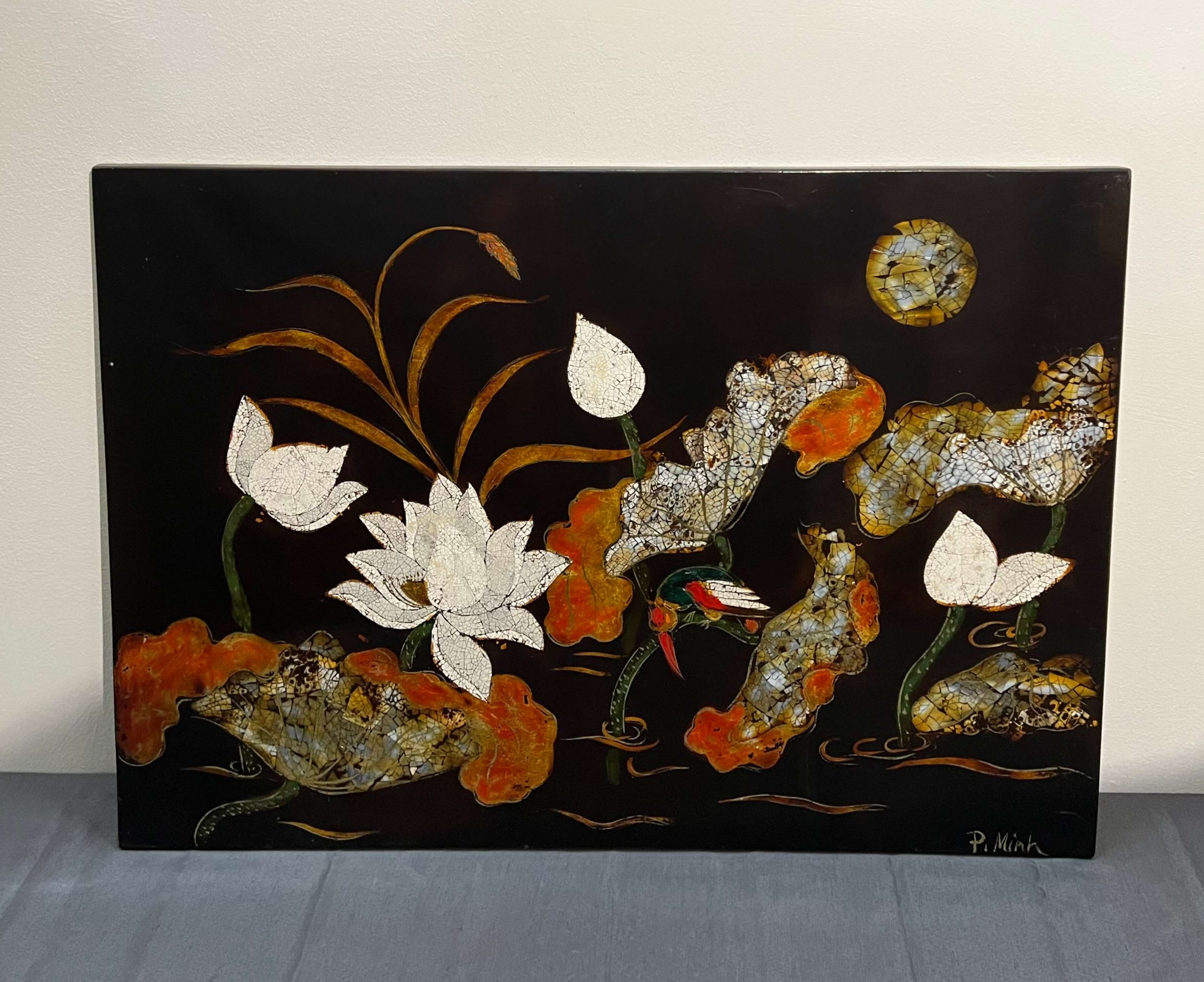 Azonnal falra akasztható állapotú kagylóhéj intarzia, amely egy igazi kuriózum munka, egy igazi gyűjtői darab!
