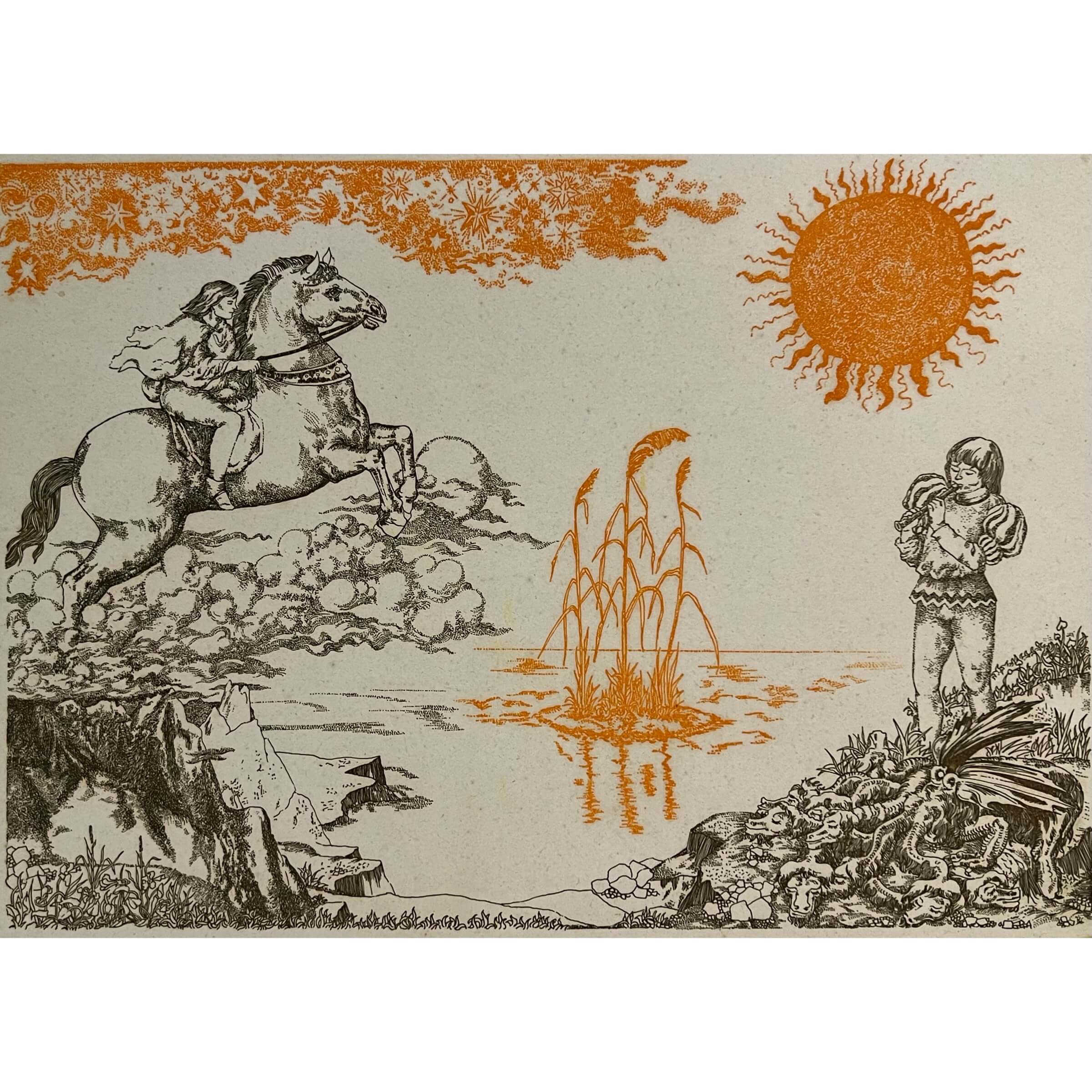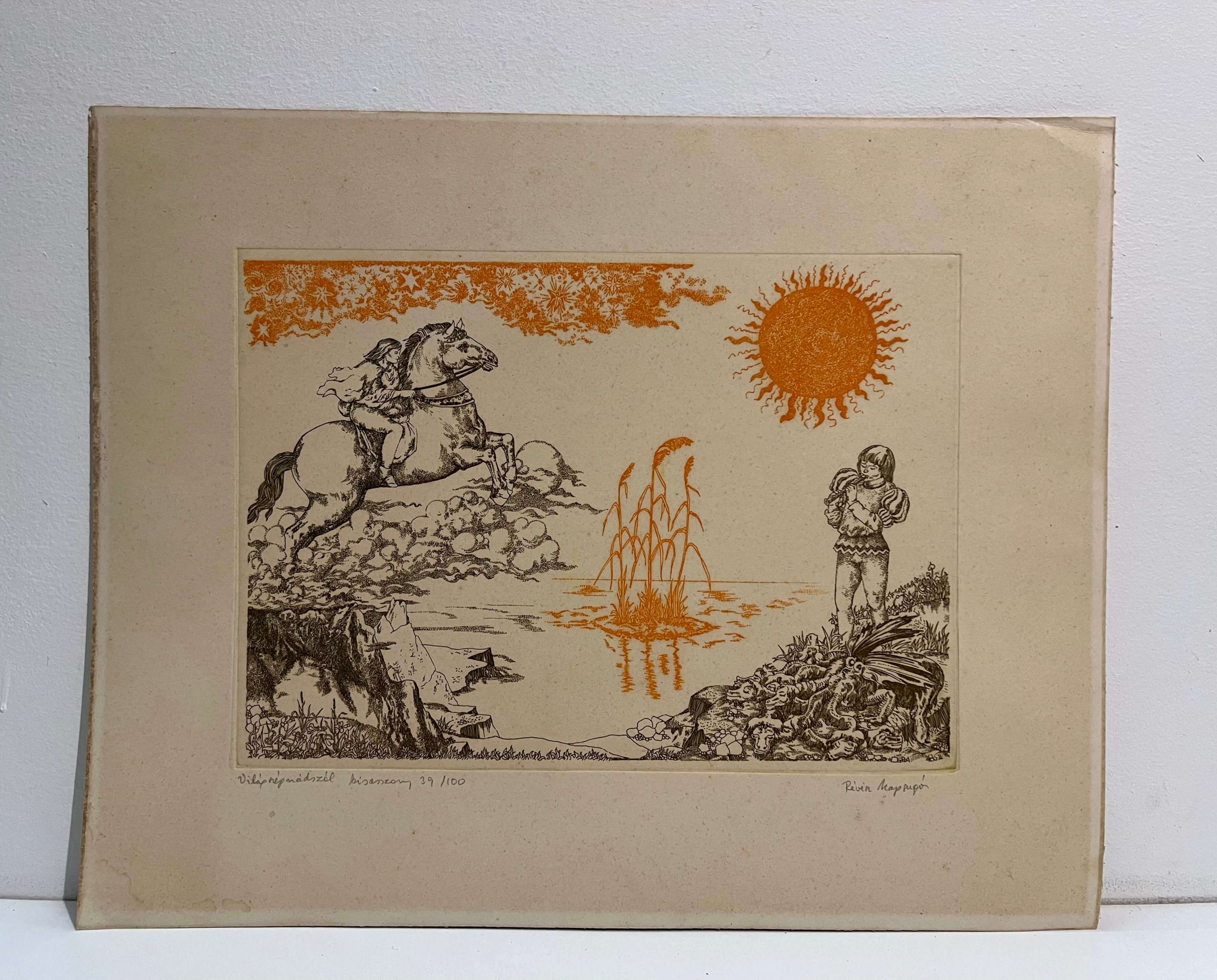 Nagyon igényesen elkészített mesejelenet Révész Napsugár (1944- ) híres magyar grafikustól, amely csak egy hozzáillő, szép keretezésre és egy gyűjtőre vár.