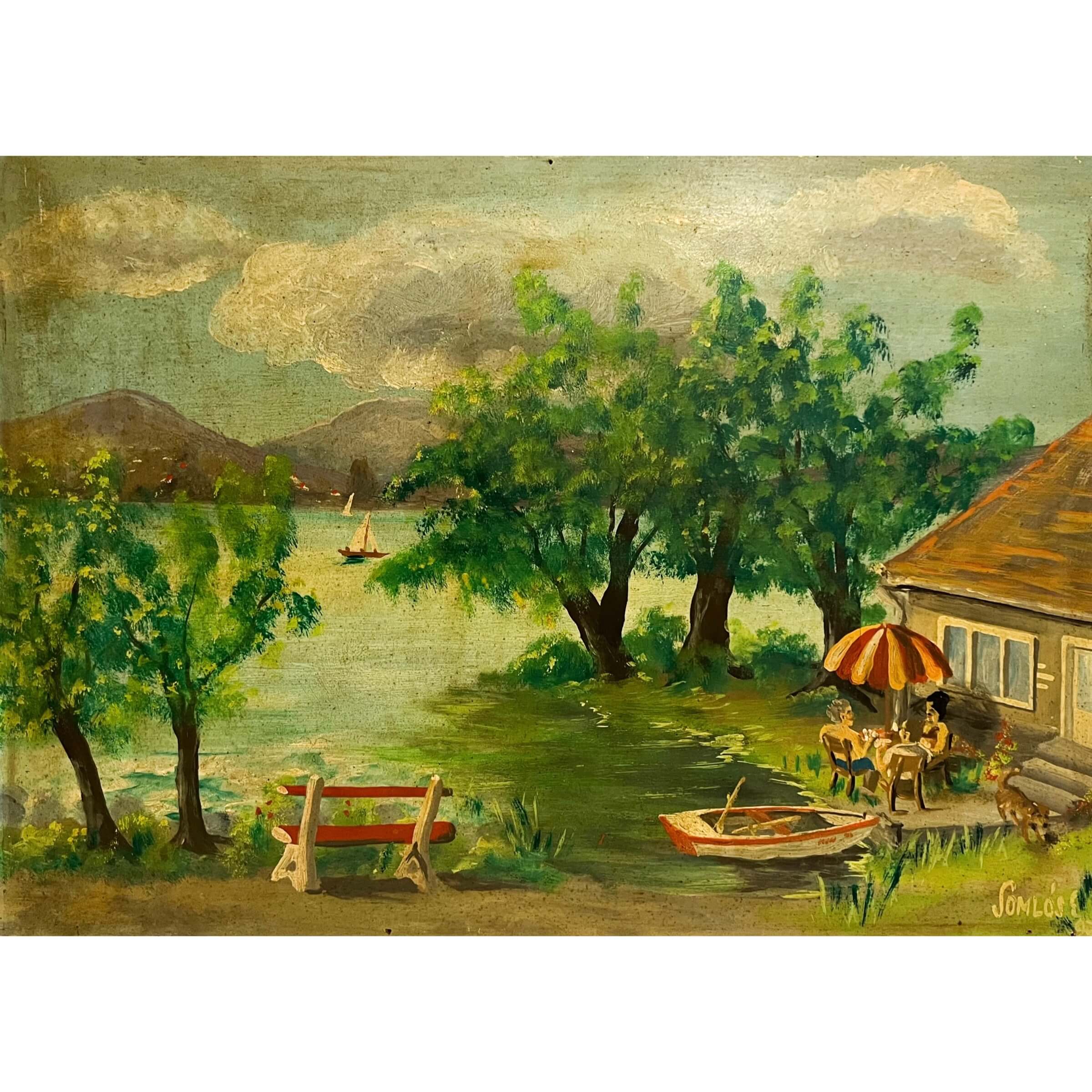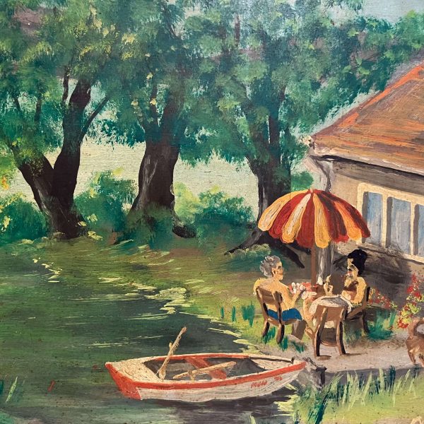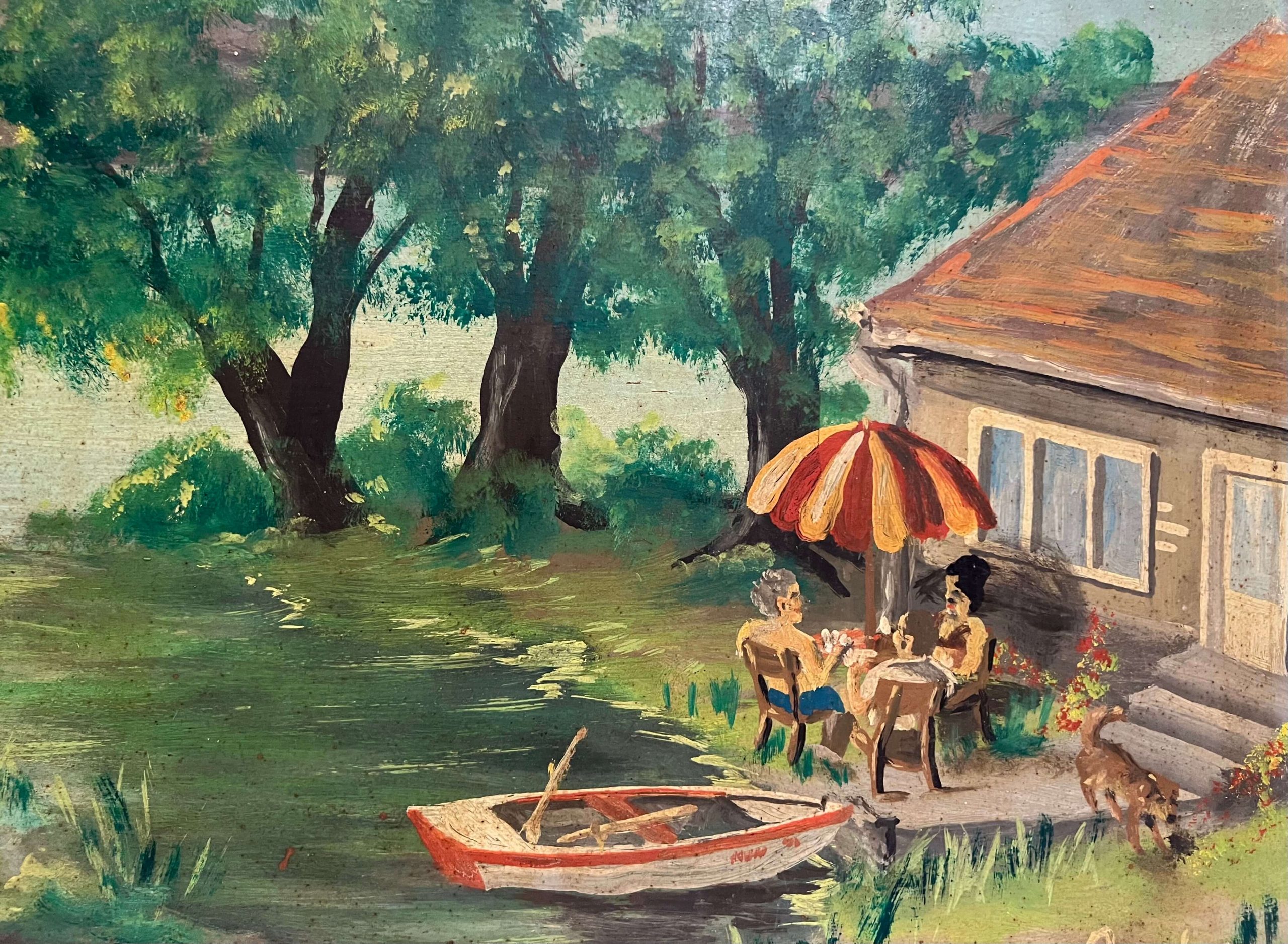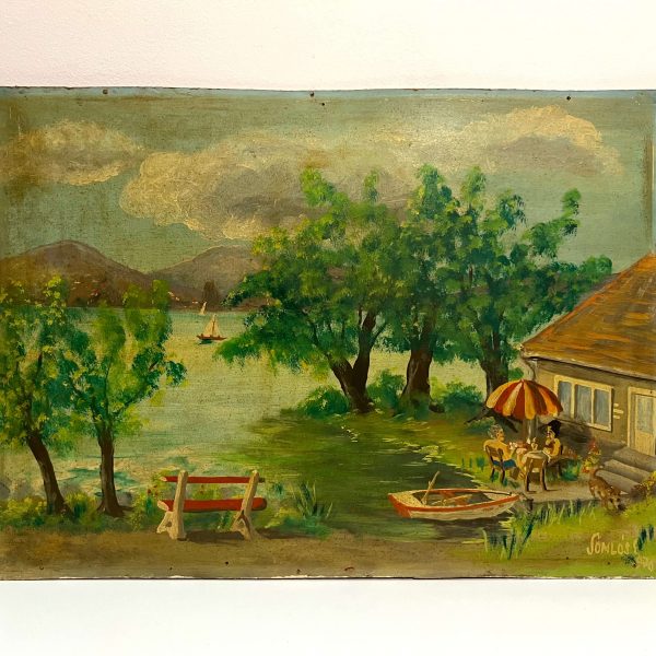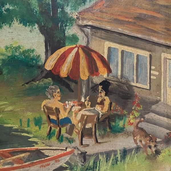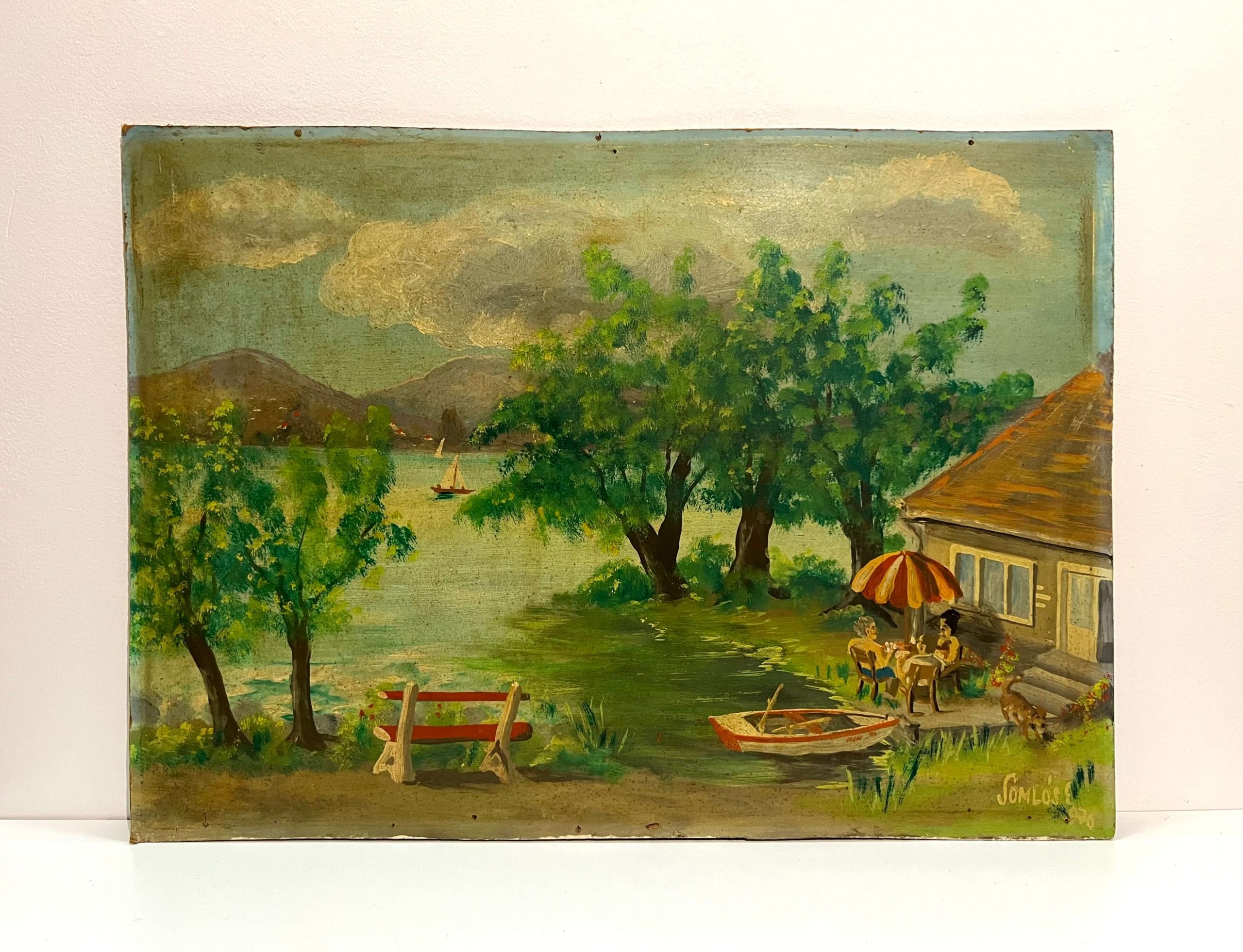 Igazi retró hangulatú, szépen megfestett balatoni életkép (olaj-farostlemez alkotás) 1970-ből, magyar művésztől. A művész beazonosítása folyamatban van!