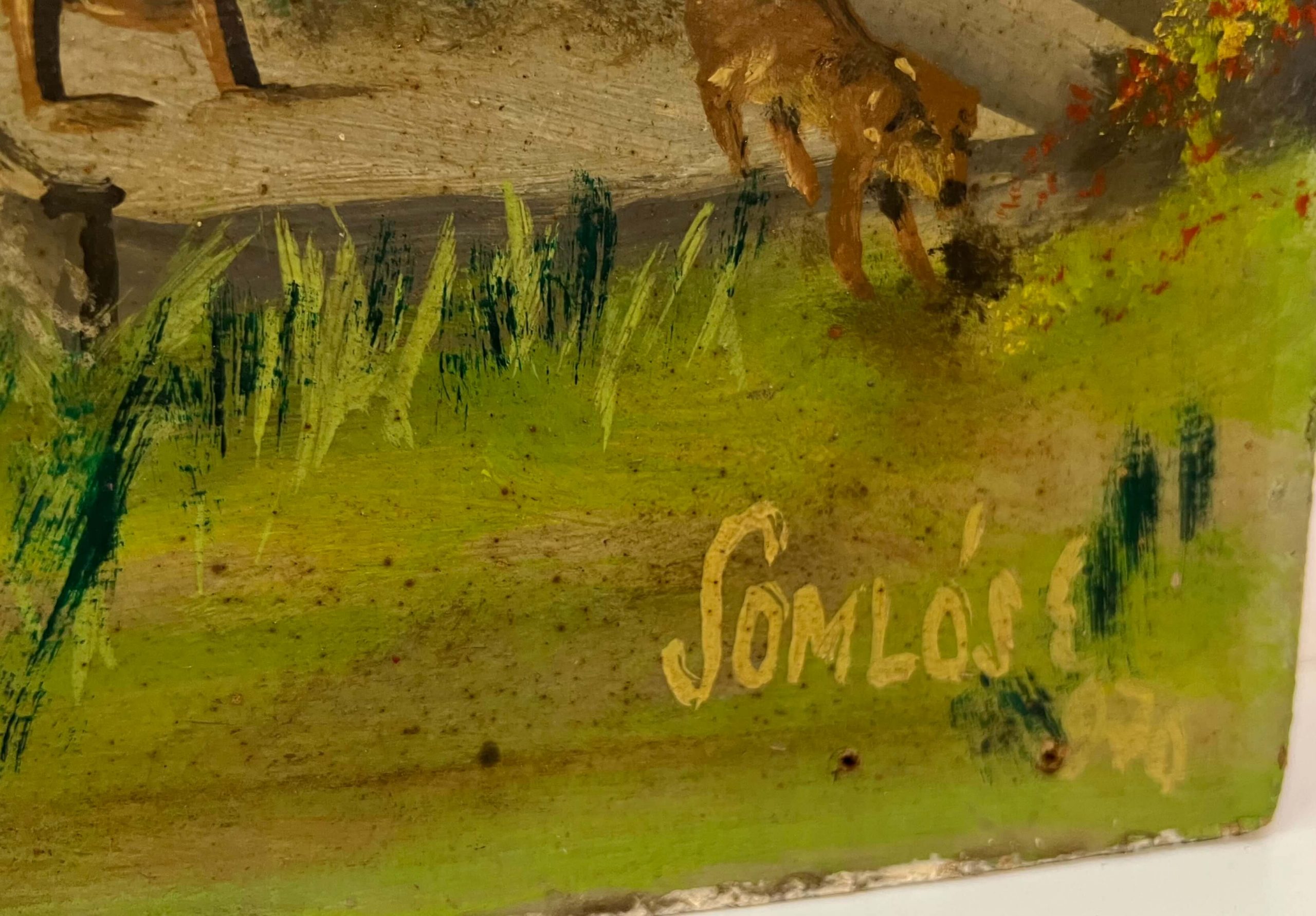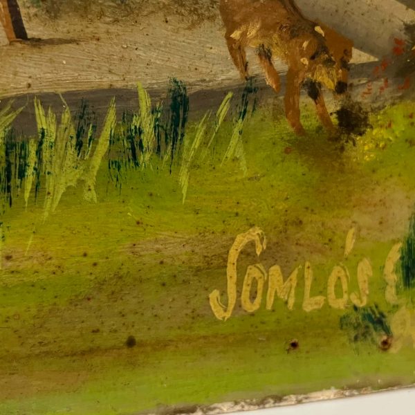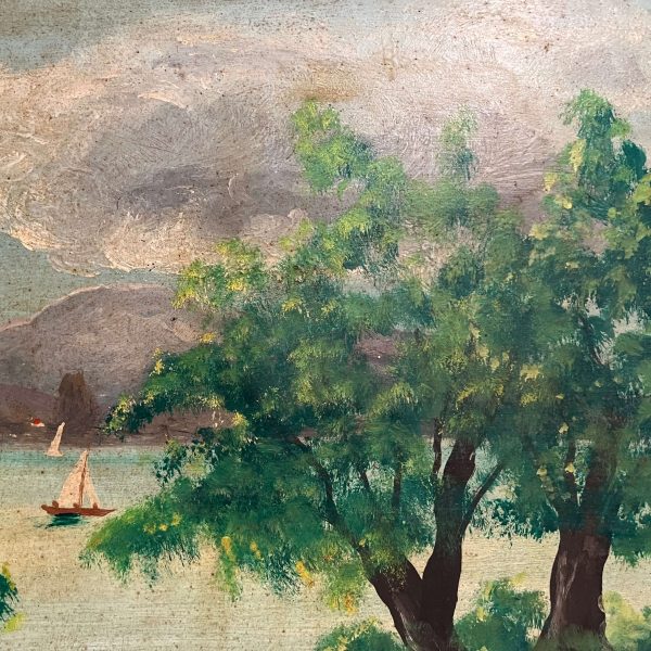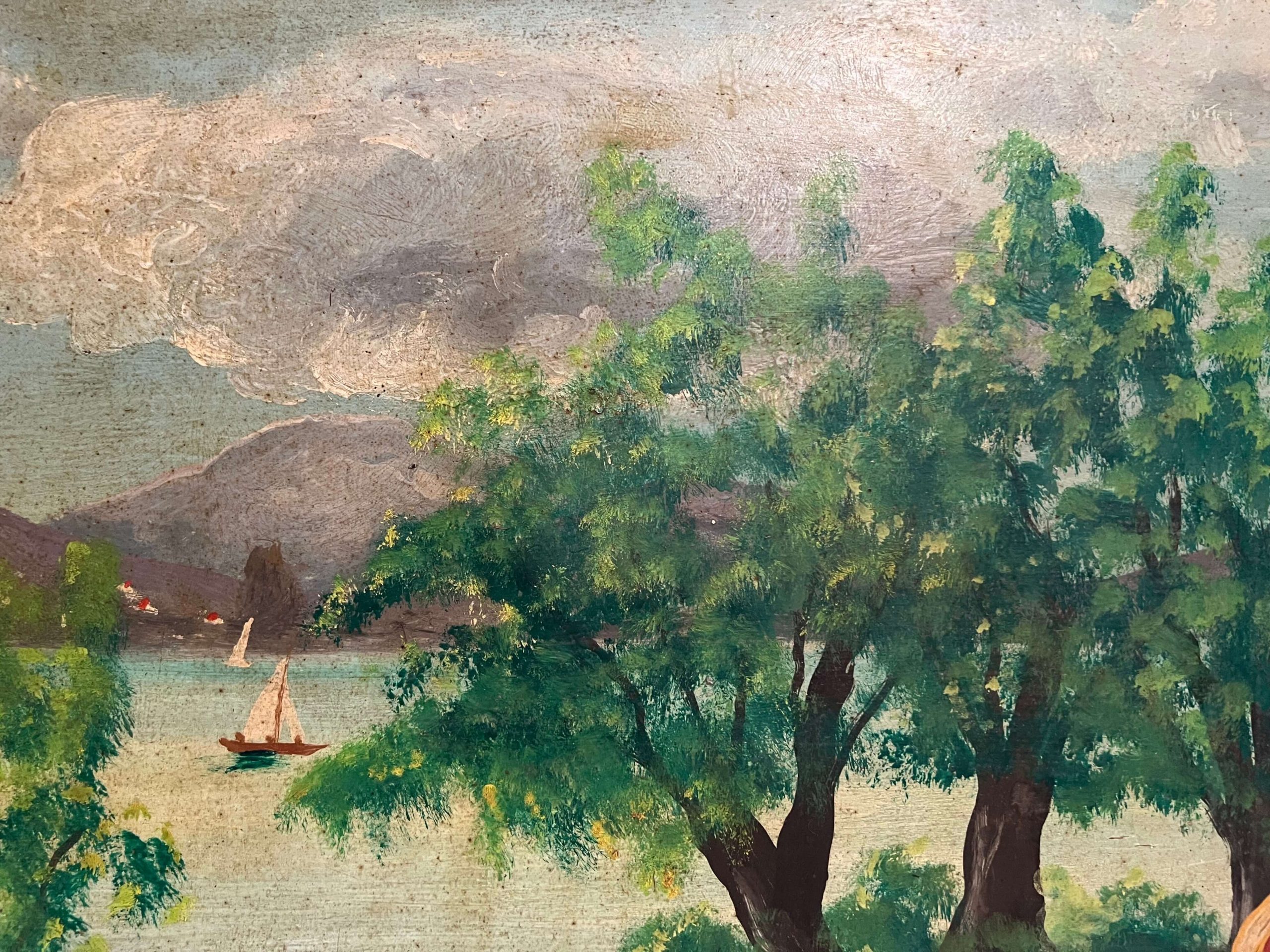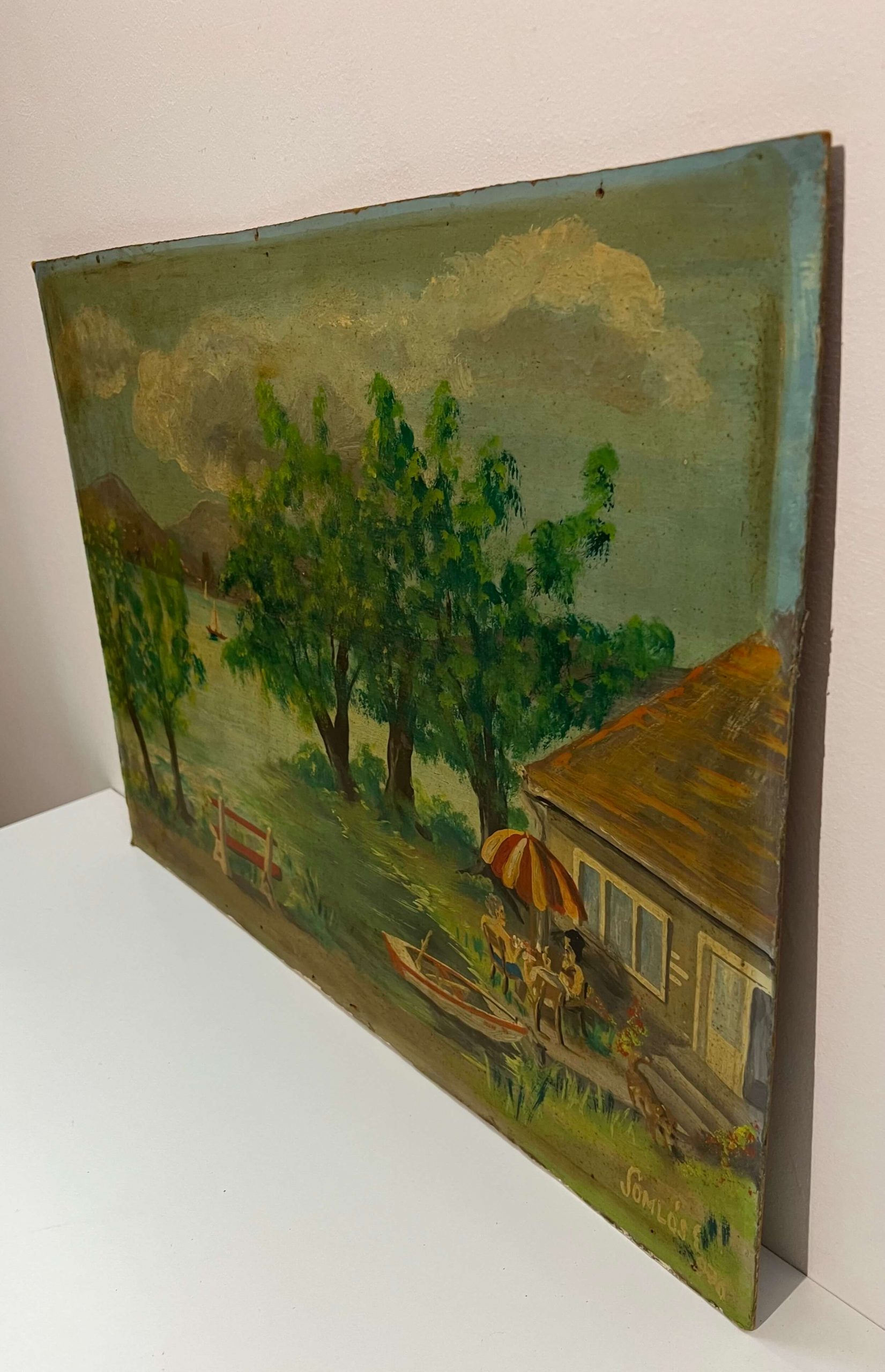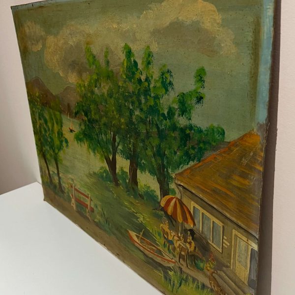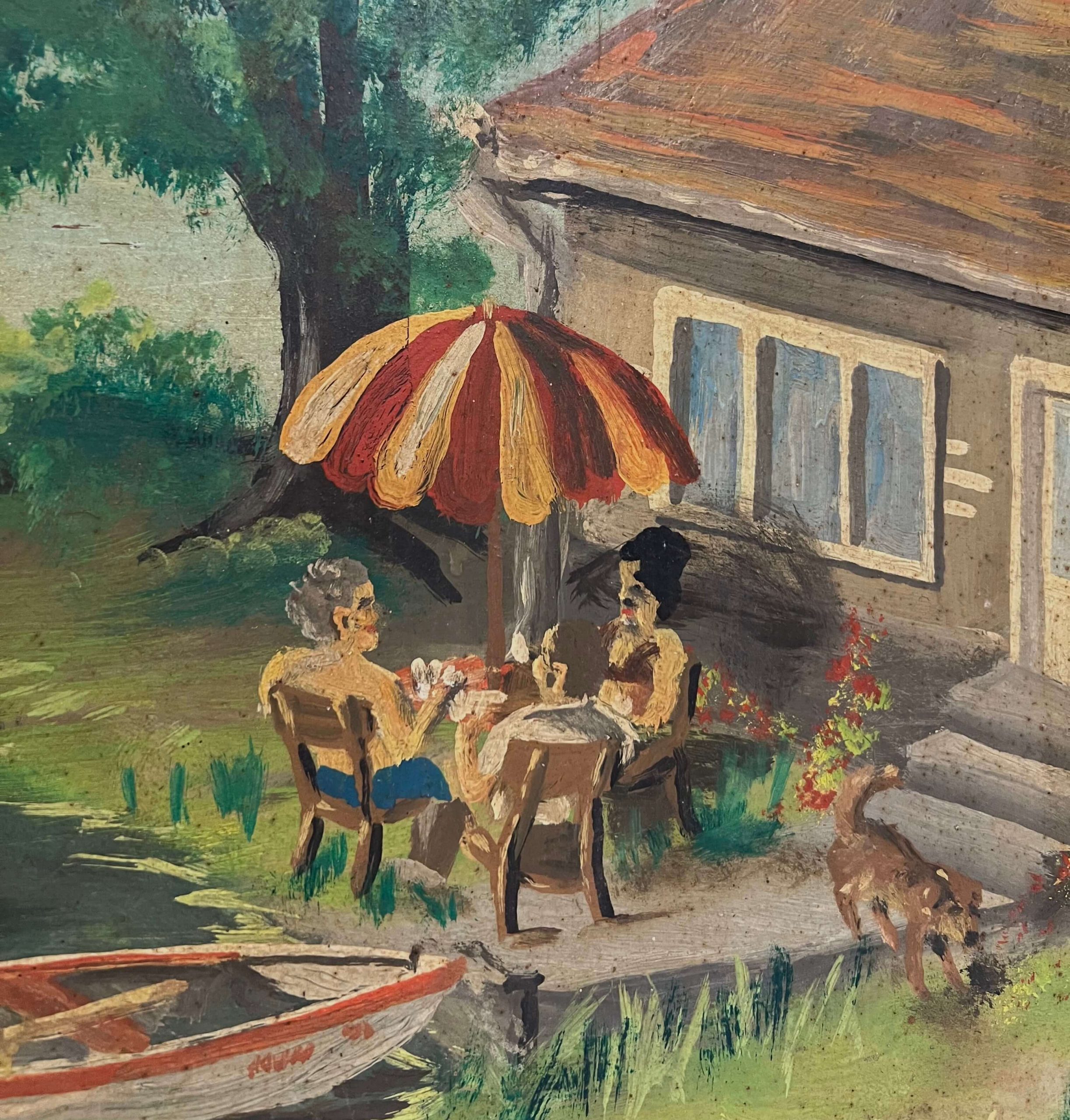 Igazi retró hangulatú, szépen megfestett balatoni életkép (olaj-farostlemez alkotás) 1970-ből, magyar művésztől. A művész beazonosítása folyamatban van!