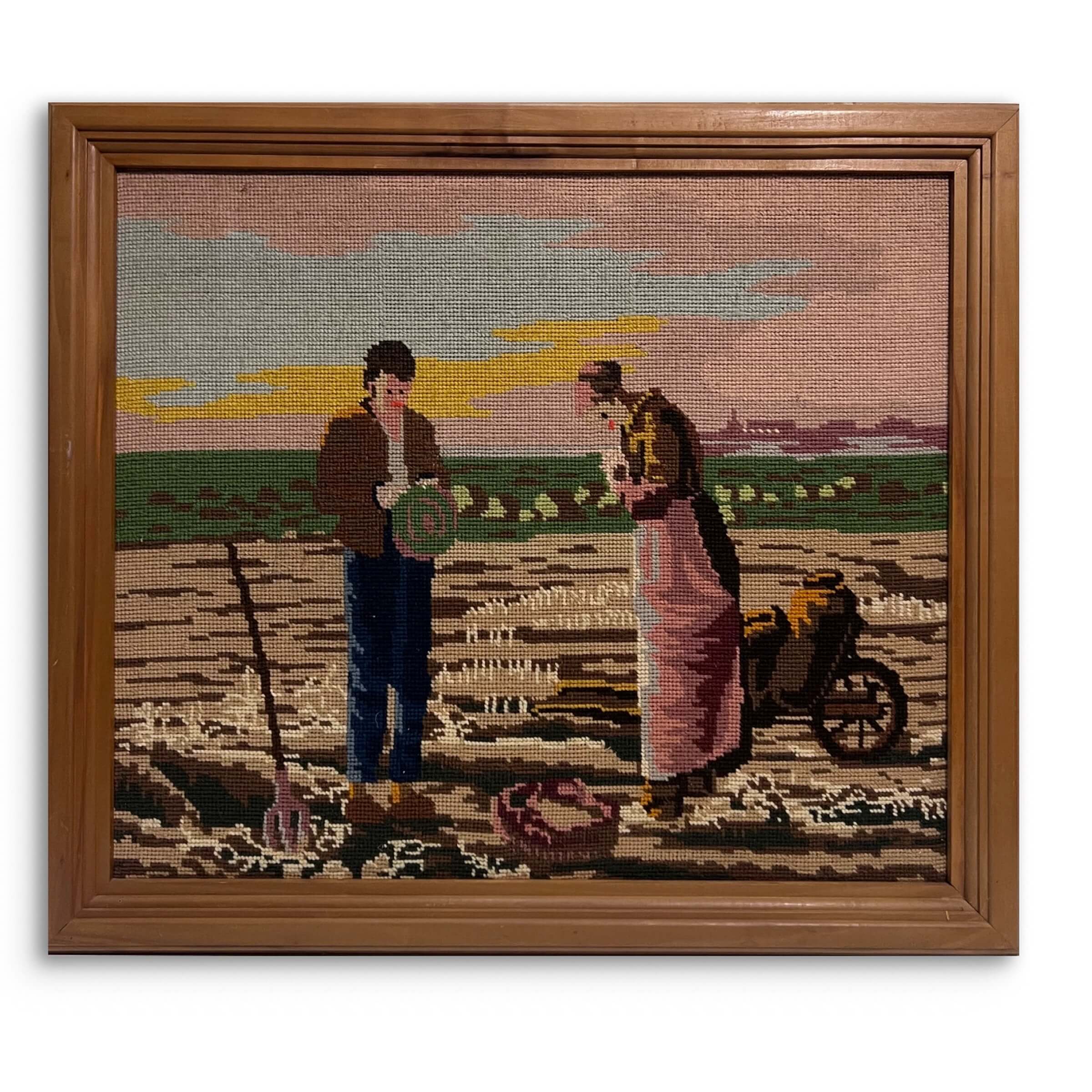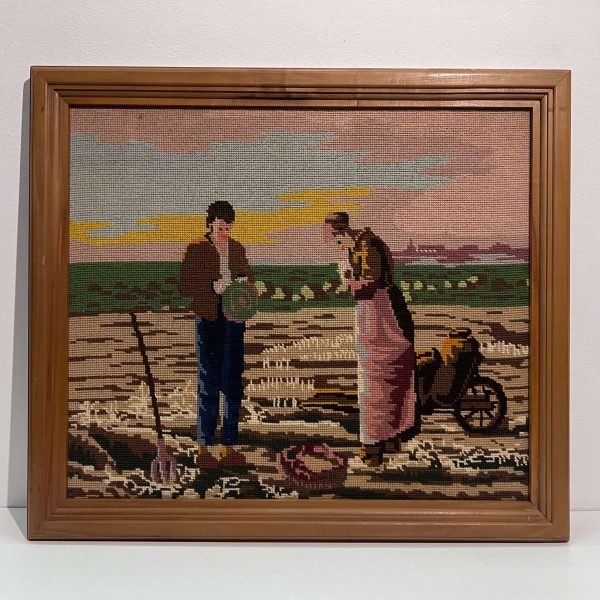 Hímzés. Vidéki életképet ábrázoló gobelin munka magyar művésztől 1979-ből azonnal falra akasztható állapotban. A gobelin szerelmeseinek!