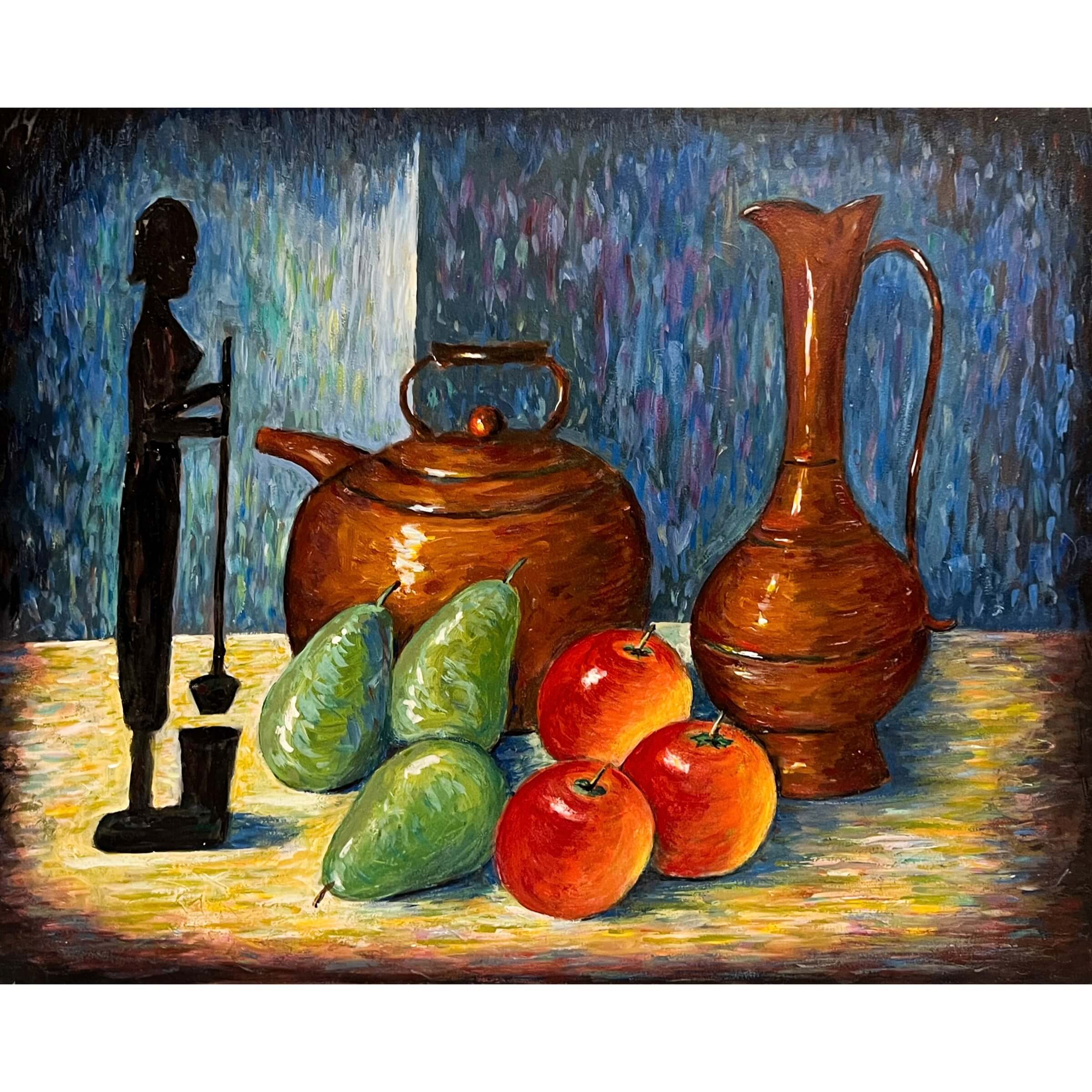 Asztali kompozíció gyümölcsökkel és tárgyakkal