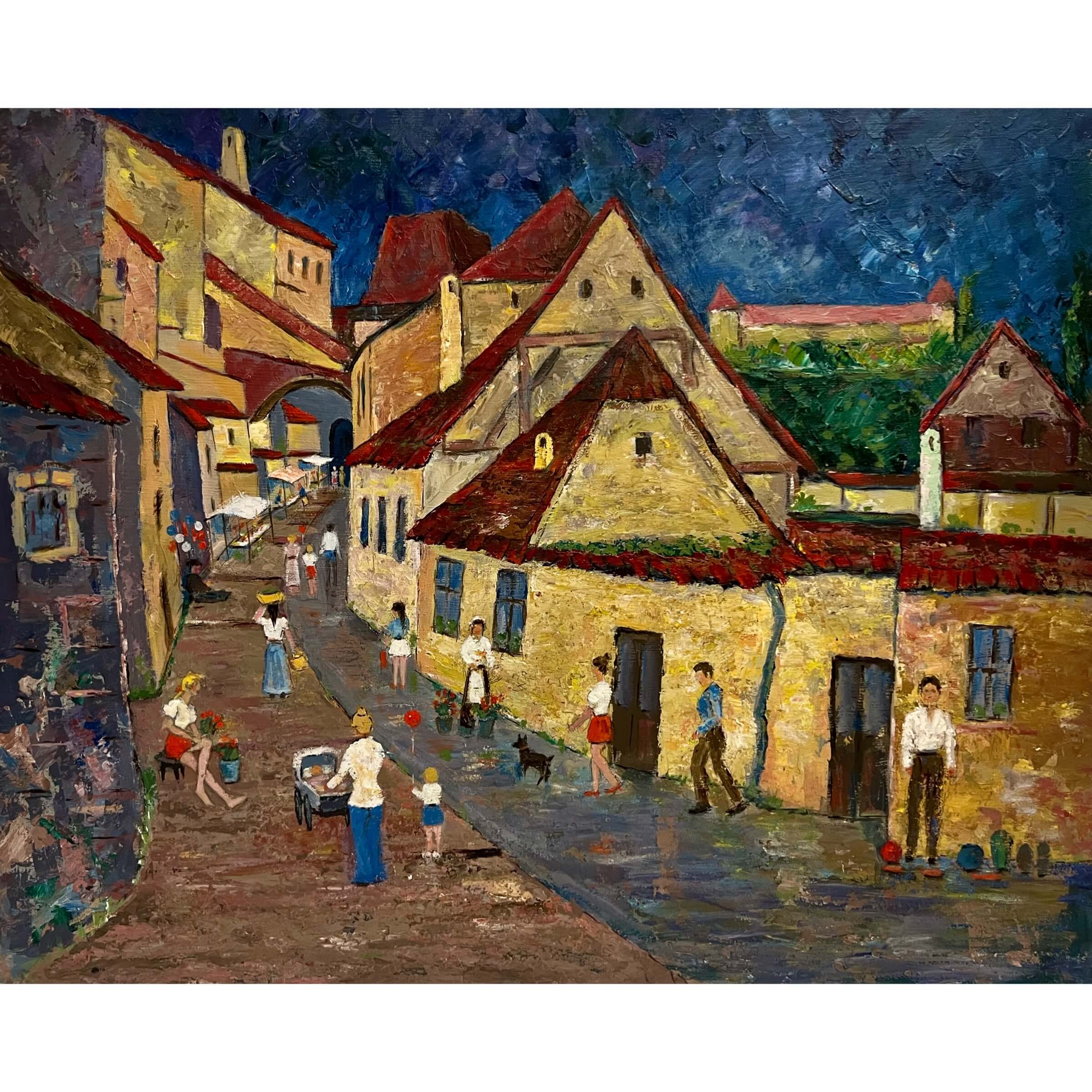 Hangulatos utcakép ábrázolás, nagyon kellemes színvilágú, nyüzsgő életet ábrázoló alkotás Székely Endre (1917-2014) magyar festőművésztől, mely csak egy hozzáillő keretezést igényel! A művészre jellemző, hogy csak nagyon kevés alkotását látta el jelzéssel. Extra gyűjtői darab!