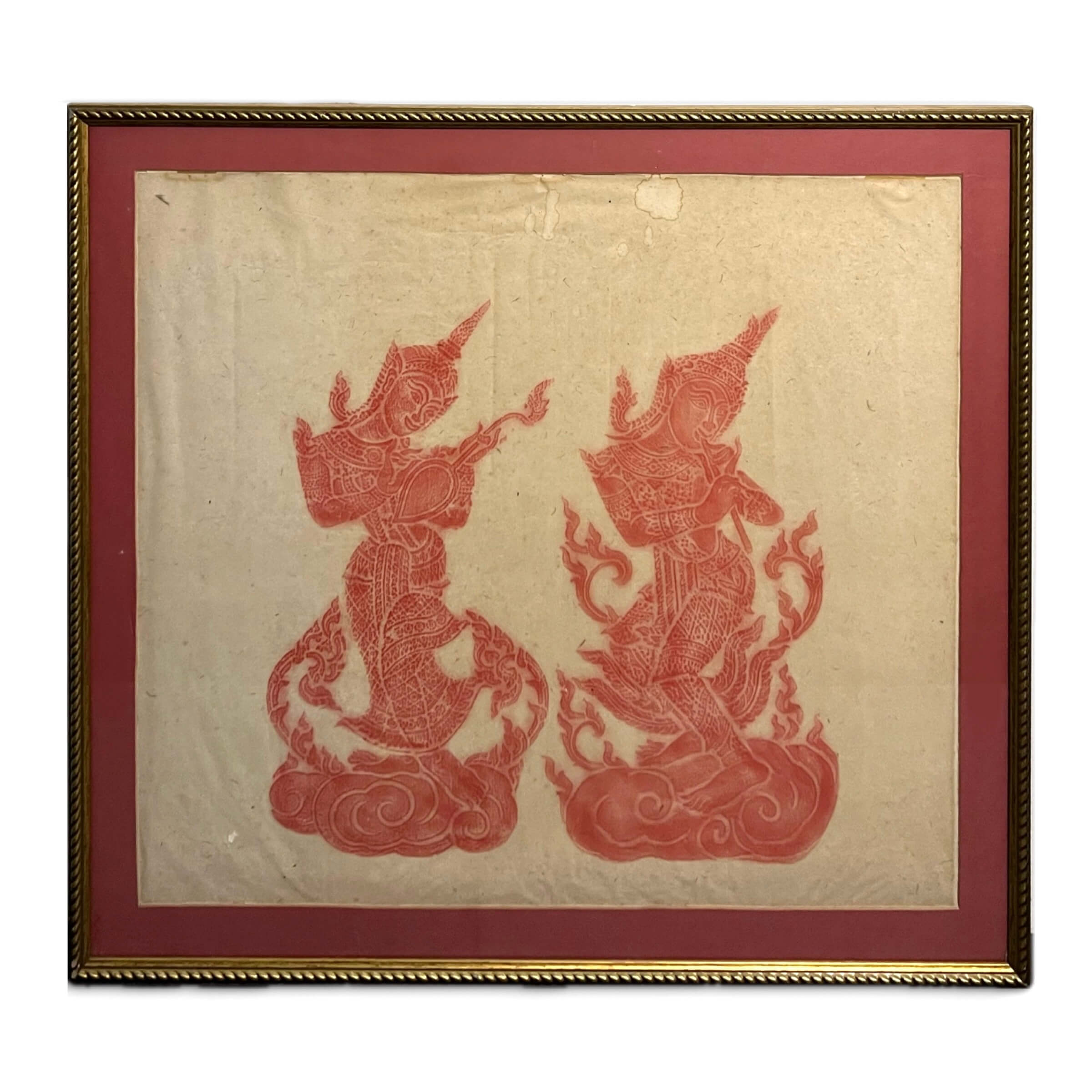 Igényesen elkészített, korának megfelelő állapotú thai templomdörzsölés (eredetileg úgy készítették, hogy rizspapírt helyeztek a templomok falain lévő domborművekre, majd festékkel átdörzsölték, hogy a részletek láthatóvá váljanak) üvegezett keretben.