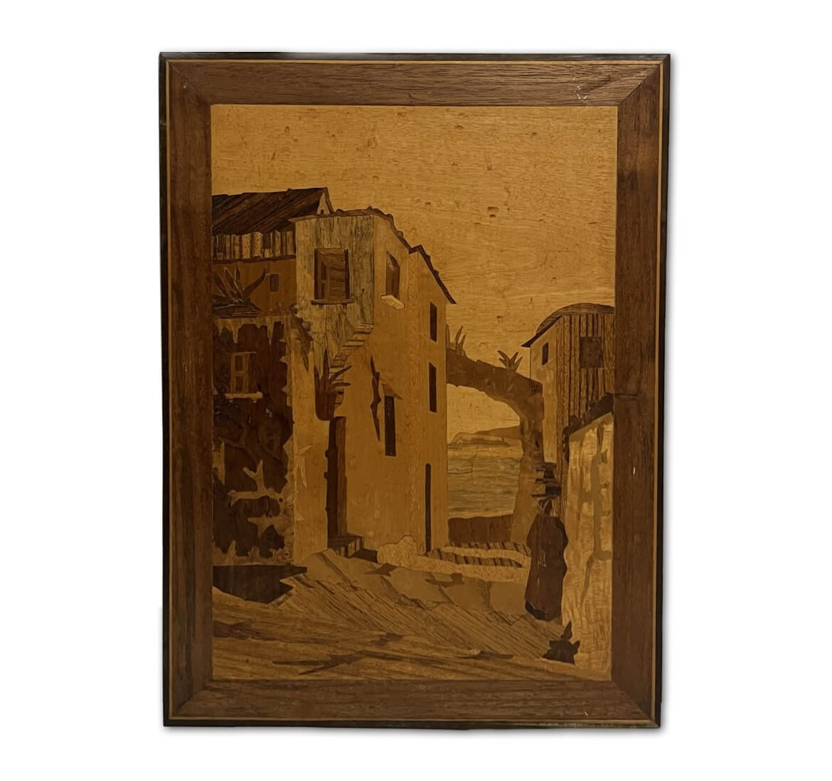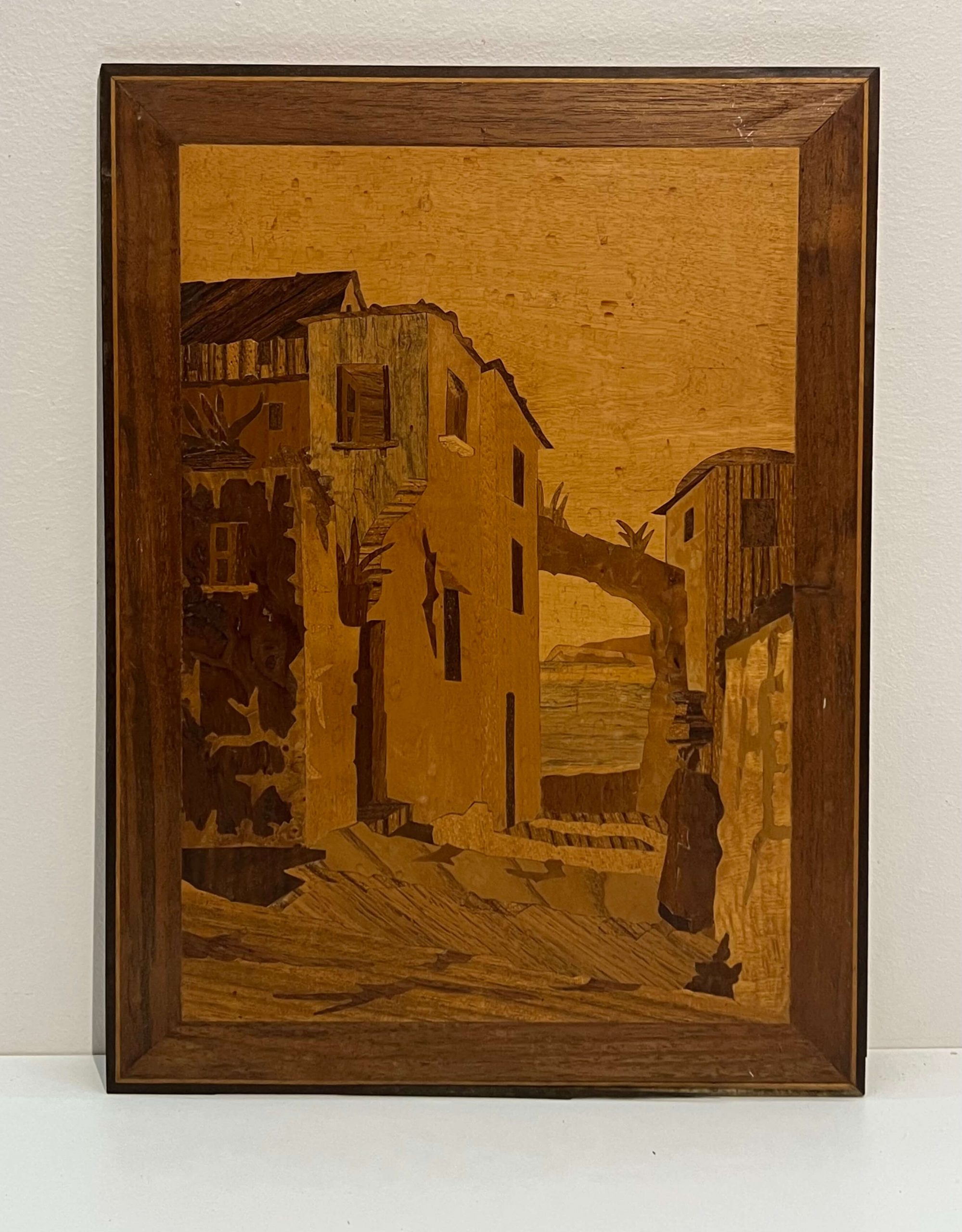 Régi, enyhe lakkozást igénylő fa intarzia.