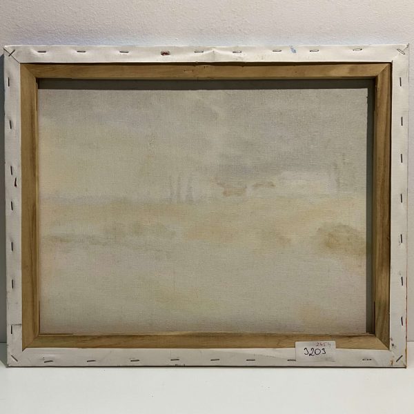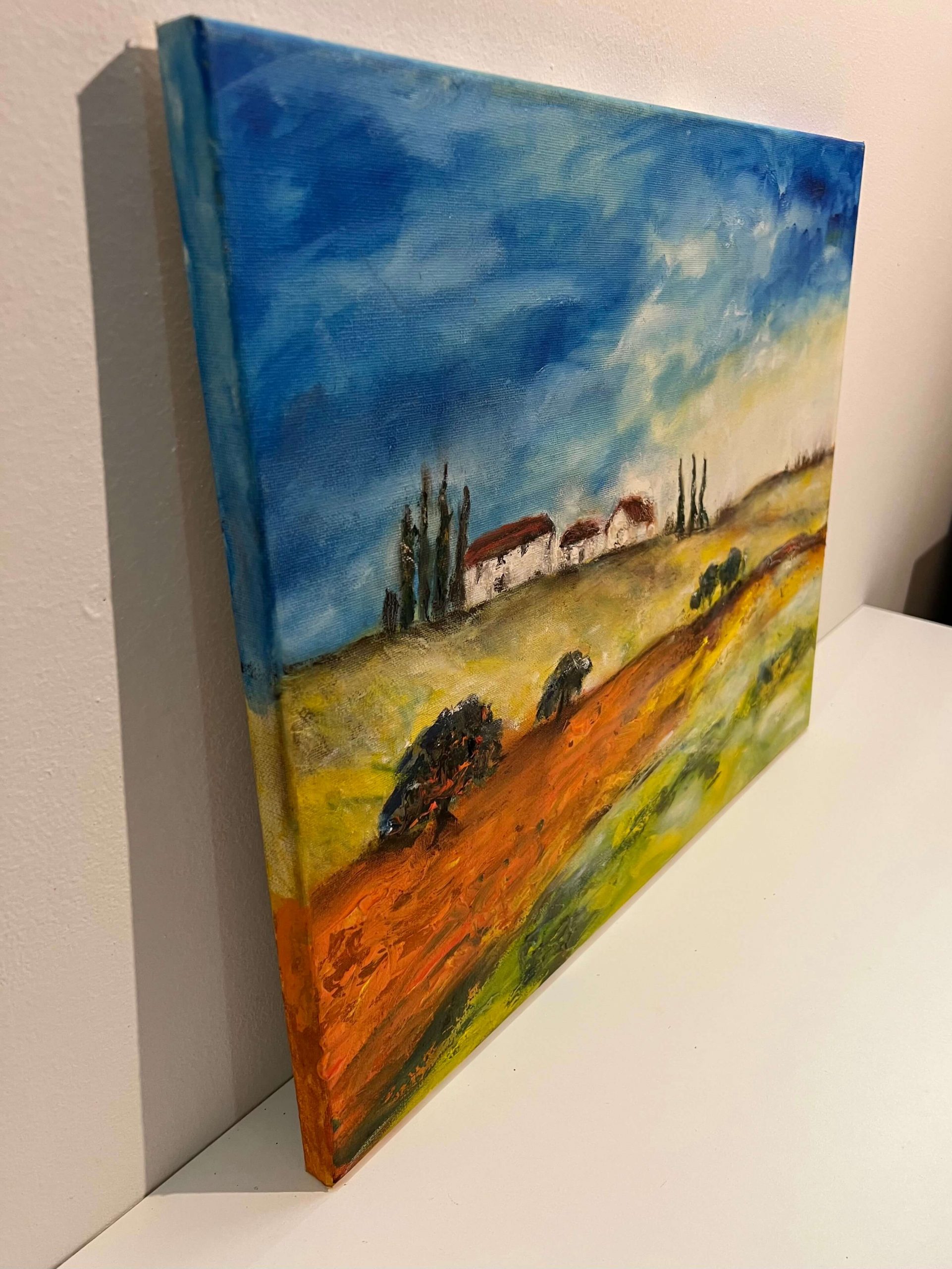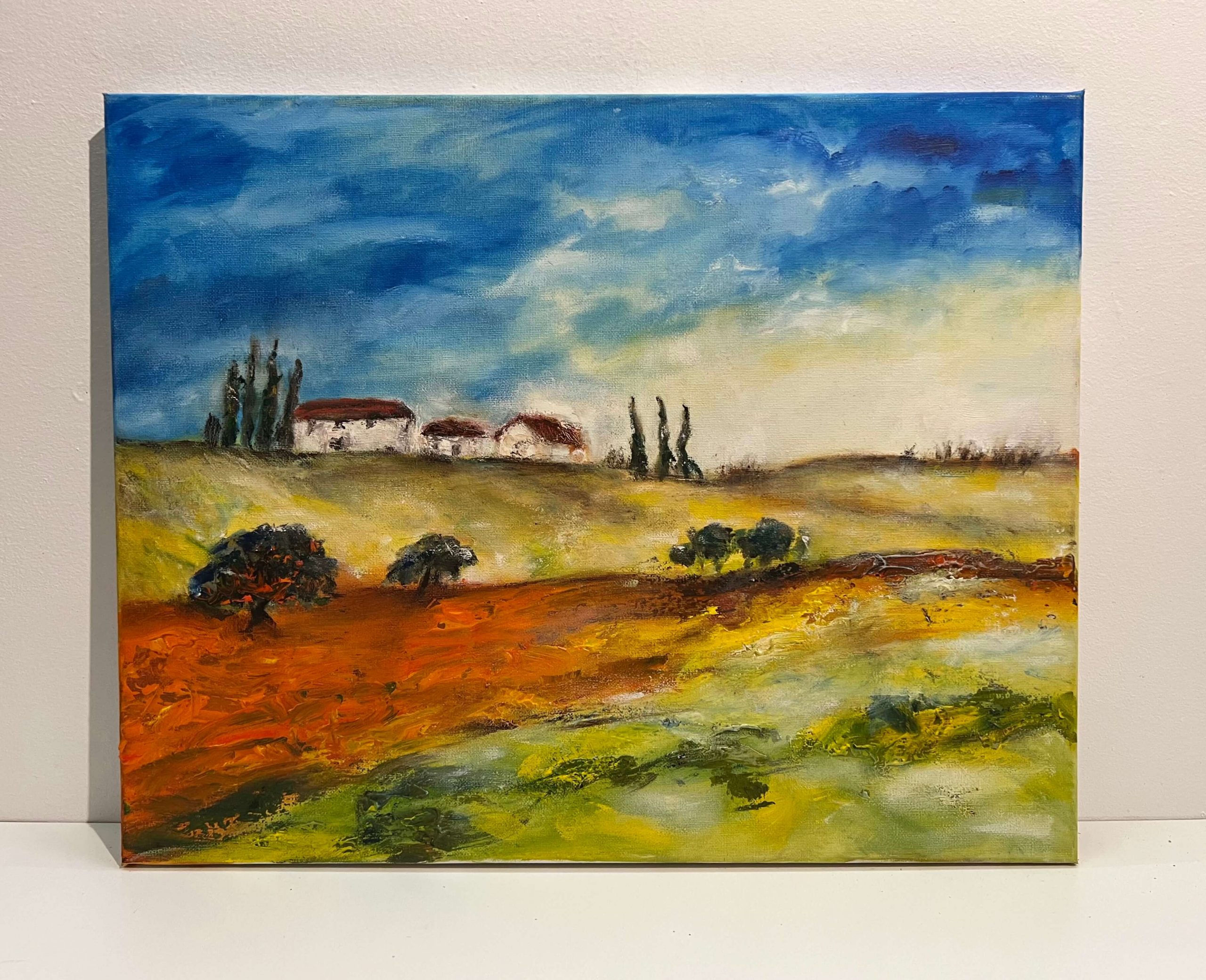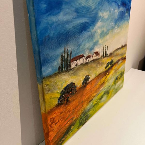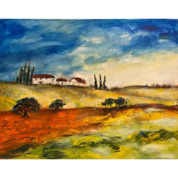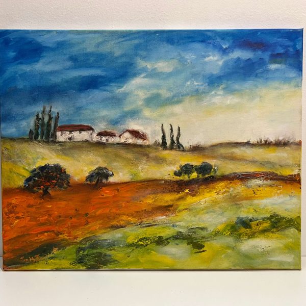 Pazar színvilágú mediterrán tájkép ábrázolás kortárs nyugat-európai művésztől, mely akár keretezés nélkül is falra akasztható, de egy keretben teljesedne ki igazán.