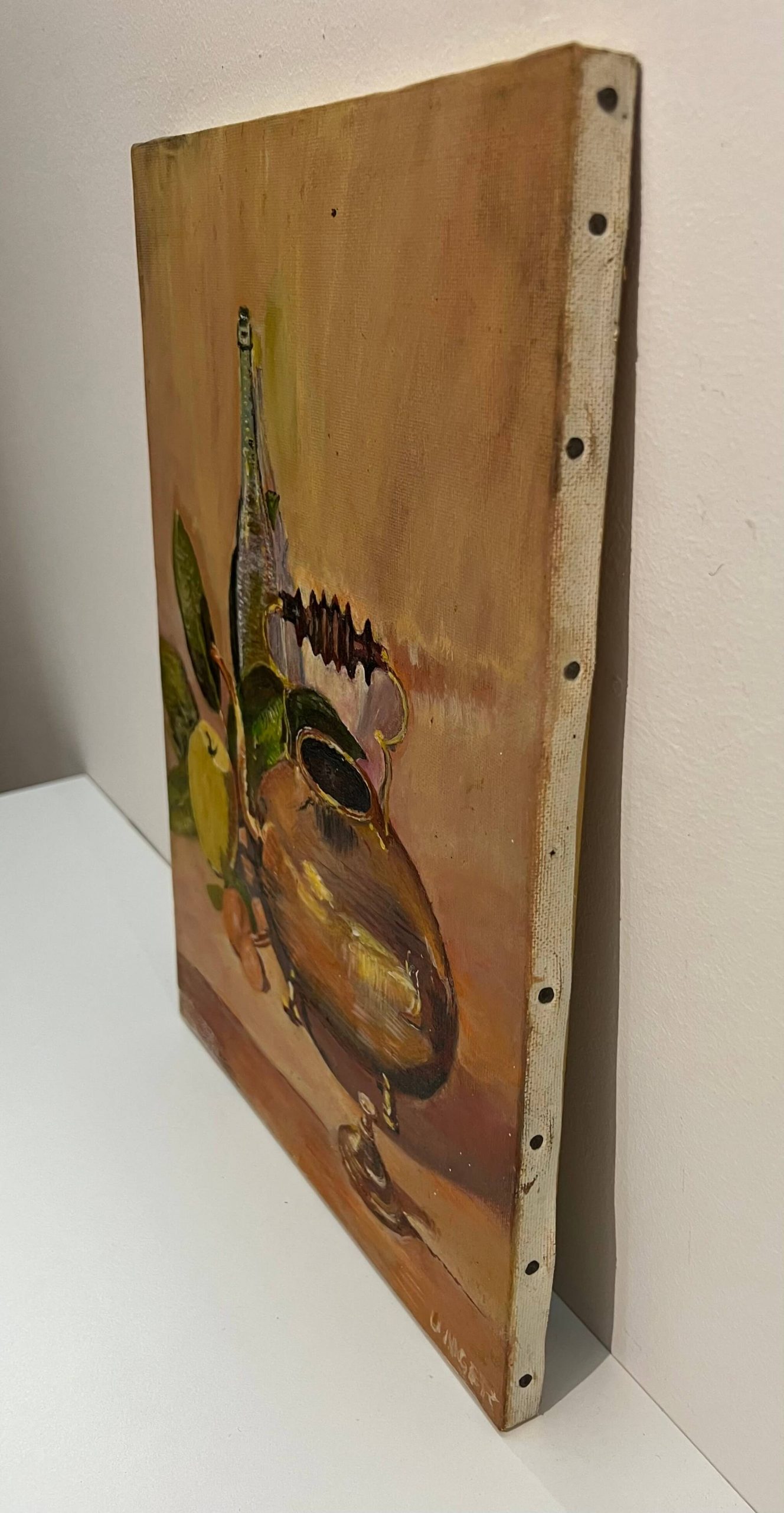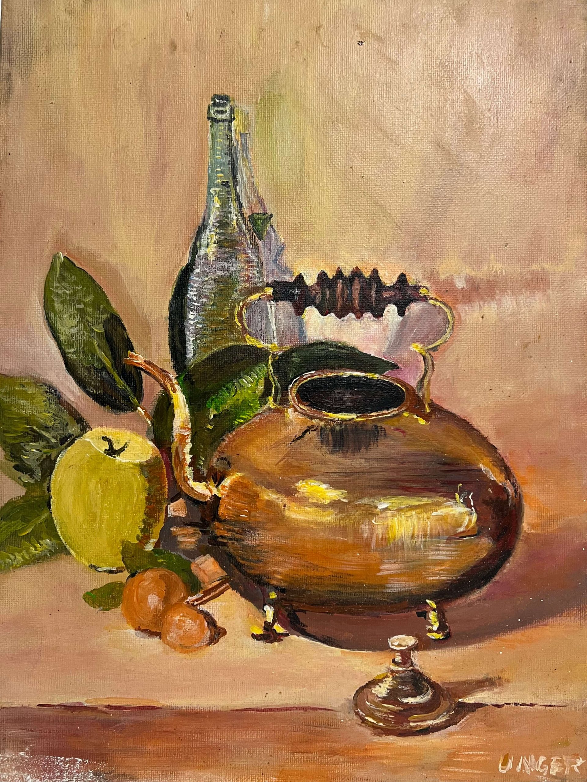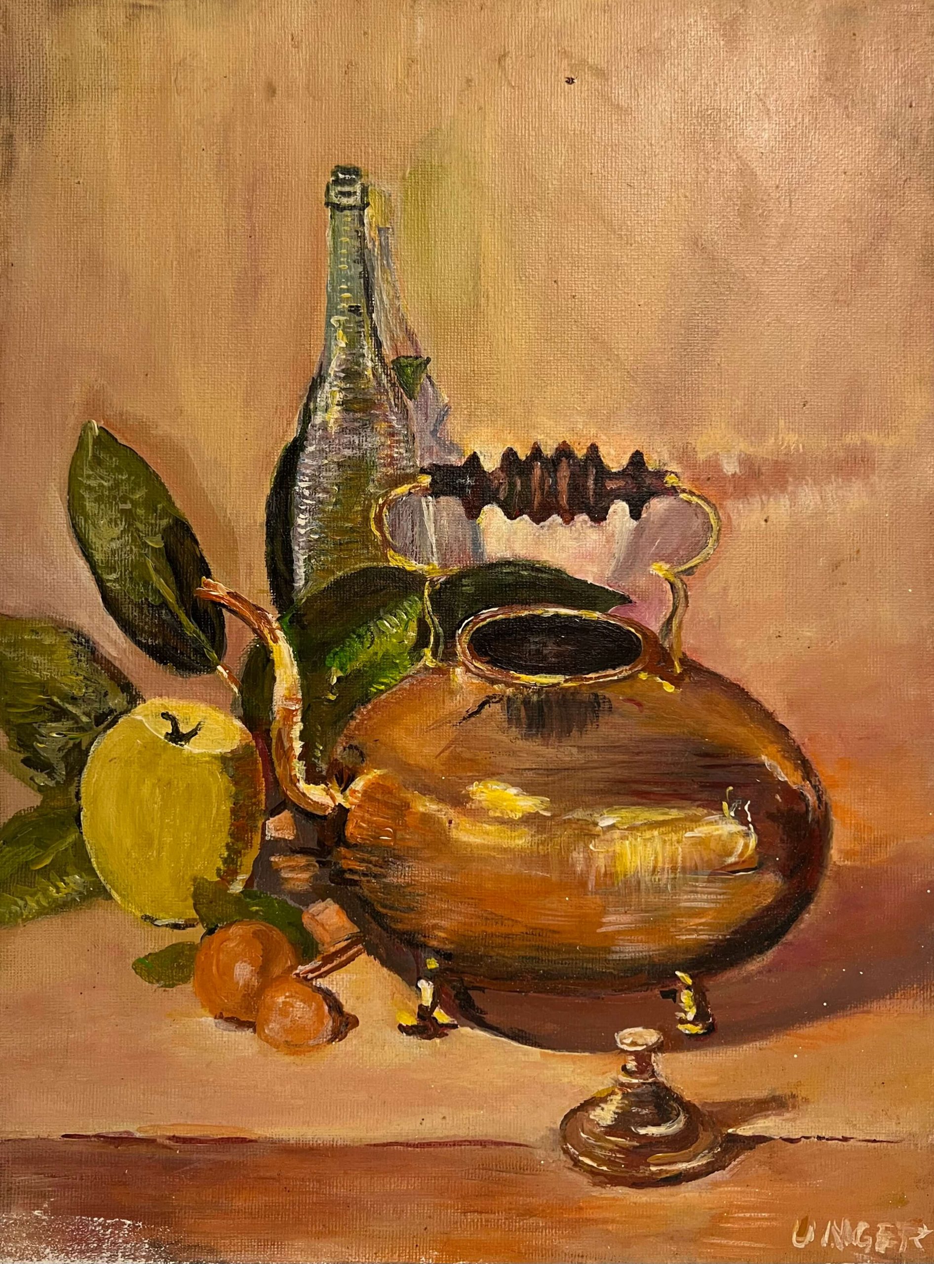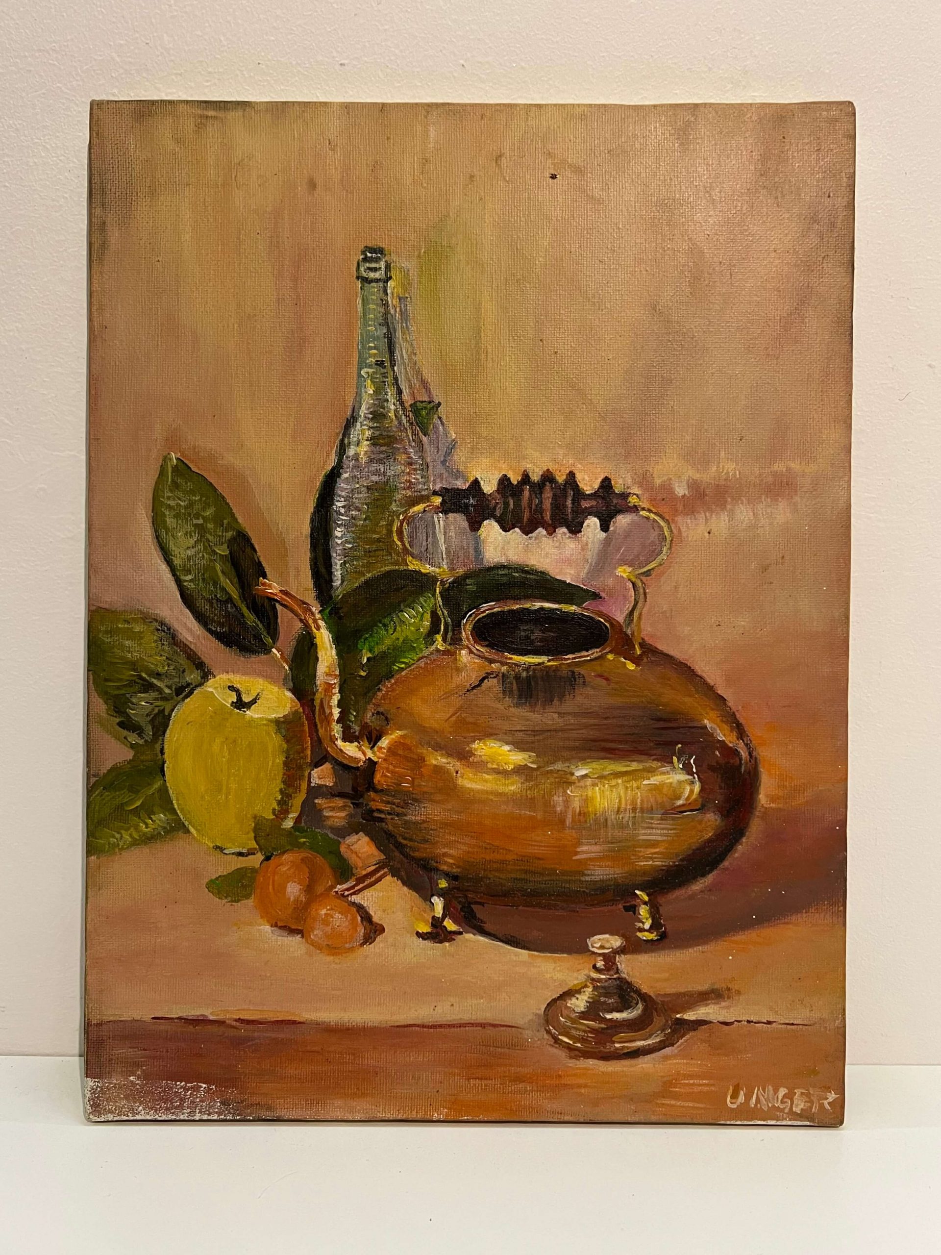 Igényesen megfestett asztali csendélet kompozíció, olaj-vászon alkotás gyönyörű színvilággal megfestve Unger Károly (1919- ) híres magyar festőtől a a becsült 70-80-as évekből! Extra igényes munka, egy gyűjtői csemege és nem utolsó sorban kiváló befektetési eszköz is!
