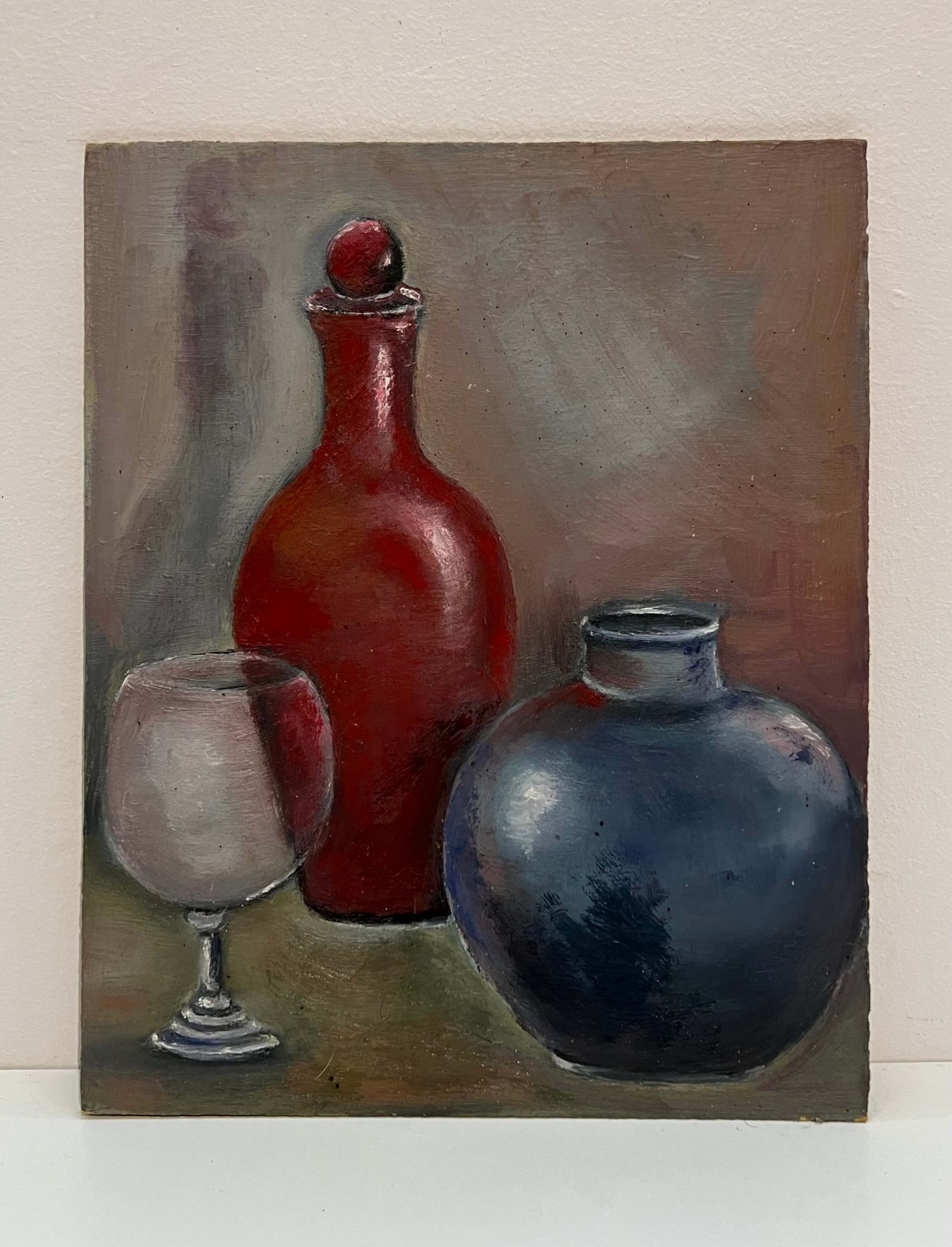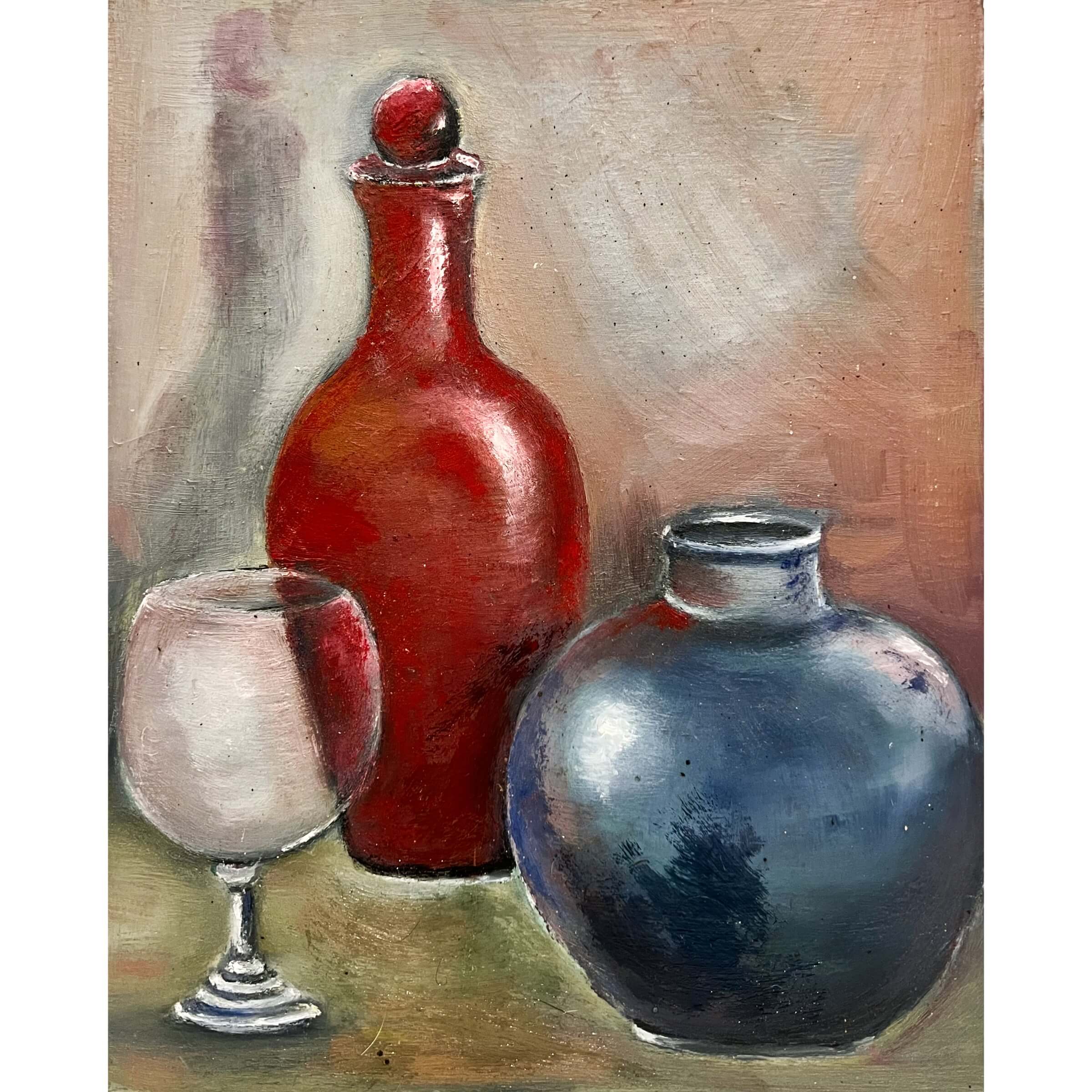 Igényes színvilággal megfestett üveg kompozíció csendélet, olaj farost alkotás a 70-80-as évekből! Kellemes gyűjtői darab és továbbá szép kis lakásdísz is egyben!