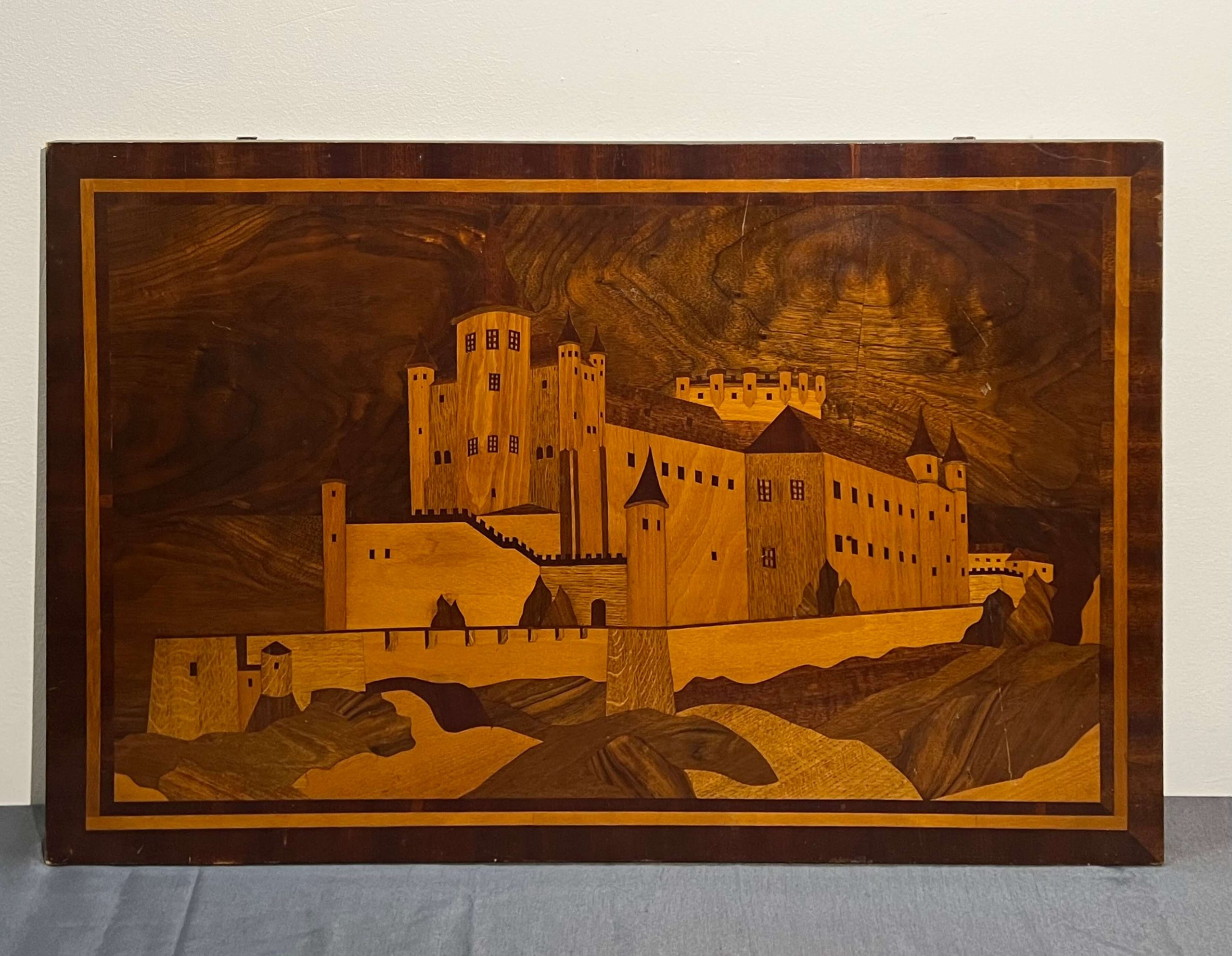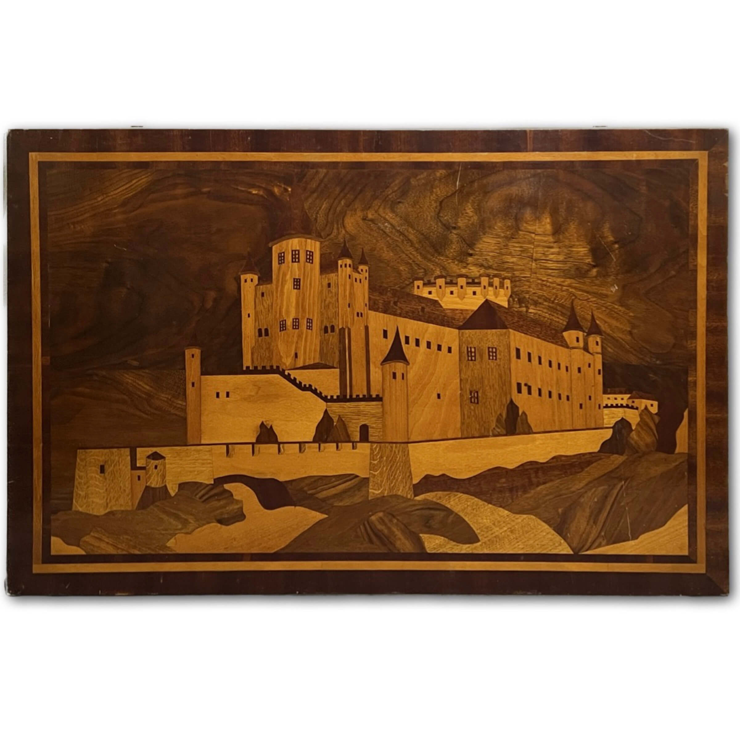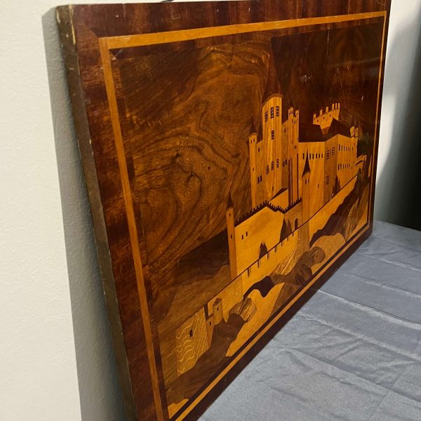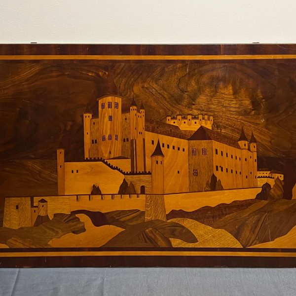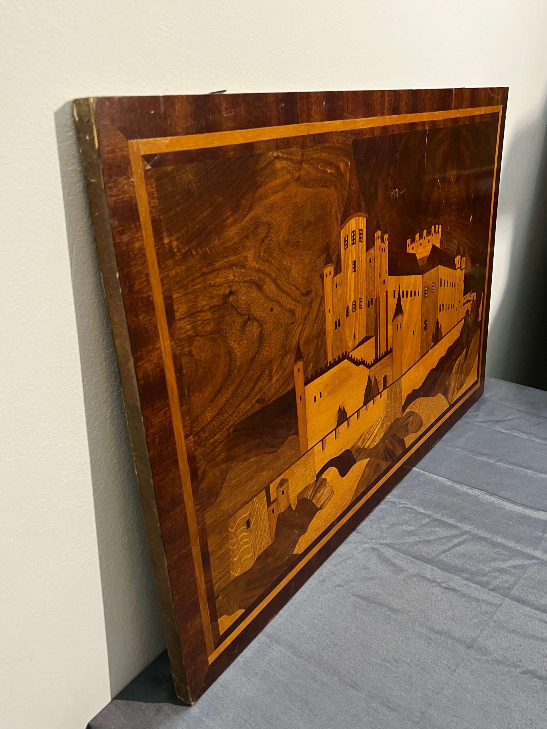 Igényesen elkészített, nagy méretű fa intarzia kép, mely pici törődést követően (lakkozást igényel) falra akasztható. Gyűjtői darab!